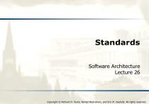Standards Software Architecture Lecture 26 Copyright © Richard N. Taylor, Nenad Medvidovic, and Eric M. Dashofy. All rights reserved. Software Architecture: Foundations, Theory, and Practice Objectives Concepts What are standards? Why use standards? And why not? (drawbacks) Deciding when to adopt a standard Prevalent Architectural Standards Conceptual standards Notational standards Standard tools Process standards 2 Software Architecture: Foundations, Theory, and Practice Objectives Concepts What are standards? Why use standards? And why not? (drawbacks) Deciding when to adopt a standard Prevalent Architectural Standards Conceptual standards Notational standards Standard tools Process standards 3 Software Architecture: Foundations, Theory, and Practice What are standards? Definition: a standard is a form of agreement between parties Many kinds of standards For notations, tools, processes, organizations, domains There is a prevalent view that complying to standard ‘X’ ensures that a constructed system has high quality This is almost never strictly true But that doesn’t mean standards are worthless! Here, we will attempt to put standards in perspective 4 Software Architecture: Foundations, Theory, and Practice De jure and de facto standards Some standards are controlled by a body considered authoritative ANSI, ISO, ECMA, W3C, IETF These standards are called de jure (“from law”) De jure standards usually are formally defined and documented are evolved through a rigorous, well-known process are managed by an independent body, governmental agency, or multi-organizational coalition rather than a single individual or company 5 Software Architecture: Foundations, Theory, and Practice De jure and de facto standards (cont’d) Some standards emerge through widespread awareness and use These standards are called de facto (“in practice”) De facto standards usually are created by a single individual organization to address a particular need are adopted due to technical superiority or market dominance of the creating organization evolve through an emergent, market-driven process are managed by the creating organization or the users themselves, rather than through a formal custodial body 6 Software Architecture: Foundations, Theory, and Practice Examples of de jure and de facto De jure standards UML (managed by OMG) CORBA (also managed by OMG) HTTP protocol (managed by IETF) De facto standards PDF format (managed by Adobe) May become de jure through ISO Windows (managed by Microsoft) There is a substantial gray area between these two 7 Software Architecture: Foundations, Theory, and Practice Gray-area Standards HTML Officially standardized by W3C, indicating de jure Flavors and browser-specific extensions developed by Microsoft, Netscape, and others, creating de facto variants None of these has power to force users to use standard JavaScript Developed by Netscape; copied (as JScript) by Microsoft After substantial adoption and possibly under threat of forking/splintering, Netscape submits it to ECMA Now standardized as ECMAScript (de jure) JavaScript and variants continue to be developed as compatible extensions of ECMAScript 8 Software Architecture: Foundations, Theory, and Practice Another spectrum Standards (whether de jure or de facto) can be: Open Allow public participation in the standardization process Anyone can submit ideas or changes for review Closed (a.k.a. proprietary) Only the custodians of a standard can participate in its evolution 9 Software Architecture: Foundations, Theory, and Practice Open vs. closed standards Another spectrum with a gray area Some standards bodies have high barriers to entry (e.g., steep membership fees, vote of existing membership) Some standards (e.g., Java) have aspects of both Sun Microsystems is effectively in control of Java as a de facto standard There is an open “community process” by which external parties can participate in a limited way 10 Software Architecture: Foundations, Theory, and Practice Why use standards? Standards are an excellent way to create and exploit A network effect exists if the value of participation increases as the number of users of the standard increases network effects versus Other network effects: TCP/IP, HTTP & HTML, UML… 11 Software Architecture: Foundations, Theory, and Practice Why use standards? (cont’d) To ensure interoperability between products developed by different organizations Usually in the interest of fostering a network effect To carry hard-won engineering knowledge from one project to another To take advantage of hard-won engineering knowledge created by others As an effort to attract tool vendors To create economies of scale in tools To attempt to control the standard’s evolution in your favor 12 Software Architecture: Foundations, Theory, and Practice Drawbacks of standards Limits your agility Remember that doing ‘good’ architecture-based development means identifying what is important in your project Standards often attempt to apply the same techniques to a too-broad variety of situations The most widely adopted standards are often the most general 13 Software Architecture: Foundations, Theory, and Practice Overspecification vs. underspecification A perennial tension in standards use and development Overspecification A standard prescribes too much and therefore limits its applicability too much Underspecification A standard prescribes too little and therefore doesn’t provide enough guidance Possibly in an effort to broaden adoption 14 Software Architecture: Foundations, Theory, and Practice Two different kinds of underspecification Two compromises often made in negotiation when disagreements occur Leave the disagreeable part of the standard unspecified or purposefully ambiguous Include both opinions in the standard but make them both optional Both of these weaken the standard’s value Consider the different kinds of reduction in interoperability imposed by these strategies Altho