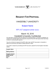 REQUEST FOR PROPOSAL VANDERBILT UNIVERSITY Subject Name RFP (VCT assigned number xxxxx) March 16, 2016 Vanderbilt University Confidential The information contained within this Request for Proposal (RFP) is considered confidential. All recipients are advised against discussing the contents of this RFP with anyone other than those involved in constructing its response. If you do not intend to respond to this RFP, either return all RFP documents to Vanderbilt or destroy all documents and delete all related electronic media. If you elect to respond by annotating this RFP document, please fill out the Supplier information section. Supplier Name Mailing Address Supplier Contact Email address Phone Fax Document1 Page 1 of 12 3/16/2016 1 About Vanderbilt Vanderbilt University (hereinafter “Vanderbilt”) is an independent, privately supported research university in Nashville, Tennessee, providing innovative programs, state-of-the-art facilities and a supportive environment for interdisciplinary inquiry. Vanderbilt comprises 10 schools, a public policy institute, a distinguished medical center and The Freedom Forum First Amendment Center. Vanderbilt offers undergraduate programs in the liberal arts and sciences, engineering, music, and education and human development, as well as a full range of graduate and professional degrees. Employing more than 3,488 full-time faculty, 396 part-time faculty and staff of more than 19,990, Vanderbilt is the largest private employer in Middle Tennessee and the second largest private employer based in the state. 2 Project Scope 2.1 This project consists of the [include a statement or paragraph defining the general nature of the project and your expectations of the Supplier] 2.2 All Vanderbilt facilities listed in this RFP will be included in this project. [Include a list of the impacted locations as either an attachment or included in the body of this RFP document]. 2.3 Vanderbilt prefers a single Supplier solution to provide [insert product/service description]. However, Vanderbilt reserves the right to make a multiple Supplier award if we deem it to be in Vanderbilt’s best interest. 2.4 Vanderbilt reserves the right to carve out any product/service that it determines could be more beneficially served as a separate program or in combination with another commodity program. 2.5 The standard Vanderbilt Purchase Agreement will be used for this project. A copy will be furnished with this RFP. 3 General RFP Terms and Conditions 3.1 Revisions to the Request for Proposal - In the event that it becomes necessary to revise any part of this RFP prior to the assigned response deadline, revisions will be provided by Procurement Services to all Suppliers involved in this project. Vanderbilt shall be the sole determinant of whether any revisions / addenda should be issued as a result of any question or other circumstances, and will extend the proposal deadline if, in Vanderbilt’s sole judgment, such information significantly amends this solicitation or makes compliance with the original deadline impractical. 3.2 Ownership of Materials – Ownership of all data, materials and documentation originated and prepared for Vanderbilt pursuant to this RFP shall belong exclusively to Vanderbilt. 3.3 Errors in Proposals - Vanderbilt will not be liable for any errors in Supplier proposals. Except during negotiations initiated by Vanderbilt, modifications to proposals will not be accepted after the deadline. Document1 Page 2 of 12 3/16/2016 3.4 Withdrawing Proposals - Suppliers may withdraw a proposal at any time prior to the deadline by submitting a written request to Vanderbilt from an authorized representative of the Supplier. After withdrawing a proposal, the Supplier may submit another proposal at any time prior to the proposal due date. 3.5 It is the responsibility of all suppliers to ensure their proposals are received by Vanderbilt no later than the appointed hour and date for submission as stated in the Request for Proposal. Unless there are extenuating circumstances acceptable to Procurement Services, or it is deemed to be in the best interests of the university, late bids will not be accepted. 3.6 Unsolicited proposals or counteroffers submitted after the proposal submission date will not be considered. 3.7 Vanderbilt expressly reserves the right to reject any and all proposals or any portion thereof and to award contracts based on factors other than price. Neither receipt of a proposal nor failure to reject shall impose any legal obligation on Vanderbilt. 3.8 Supplier’s submittal of their proposal certifies it is made without prior understanding, agreement, or connection with any corporation, firm or person submitting a bid/offer for the same services, and is in all respects fair and without collusion or fraud. Supplier agrees to abide by all conditions of this solicitation and certifies that the signatory is authorized to submit the proposal for the Supplier. 3.9 Use of Vanderbilt Name - Supplier shall not use Vanderbilt’s name, logos or other trademarks in any marketing and/or advertising media without Vanderbilt’s written approval to do so. 3.10 Suppliers are to direct all questions related to this RFP to the Vanderbilt contacts identified herein. Unauthorized contact, discussions or requests for meetings with any other Vanderbilt personnel during the bid process may result in the rejection of your proposal. 3.11 Confidentiality - As an independent, privately supported research university, Vanderbilt University is not required to disclose contracts, RFP documents, proposals or other purchasing documents to outside parties. All such materials are considered confidential and all requests for access to these materials will be declined. All suppliers are expected to maintain the confidentiality of all materials and correspondence with Vanderbilt regardless of whether or not any actual business is conducted. Vanderbilt does not conduct public bid openings. 4 General 