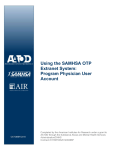 Using the SAMHSA OTP Extranet System: Program Physician User Account Completed by the American Institutes for Research under a grant to AATOD through the Substance Abuse and Mental Health Services Administration/DHHS Contract # HHSP233201400268P Using the SAMHSA OTP Extranet System: Program Physician User Account October 2015 Completed by the American Institutes for Research under a grant to AATOD through the Substance Abuse and Mental Health Services Administration/DHHS Contract # HHSP233201400268P 1000 Thomas Jefferson Street NW Washington, DC 20007-3835 202.403.5000 www.air.org Contents 1. Overview of the OTP Extranet System ..................................................................................... 1 1.1. OTP Extranet System Features ........................................................................................ 1 1.2. Types of User Accounts In the OTP Extranet System ..................................................... 1 2. Purpose of This User Guide ...................................................................................................... 2 3. Establishing Program Physician User Account ........................................................................ 2 3.1. Overview of Program Physician user account ................................................................. 2 3.2. Requesting Program Physician User Accounts................................................................ 3 3.3. Selecting a Password........................................................................................................ 7 4. Program Physician Account Permissions and Responsibilities ................................................ 7 4.1. Permissions for Program Physicians Working in Multiple OTPs ................................... 8 4.2. Patient Exception Request Forms (SMA-168) ................................................................ 9 4.2.1. SMA-168 Overview ............................................................................................. 9 4.2.2. When Should an Exception Request be Submitted? ............................................ 9 4.2.3. How Do Program Physicians Support the OTP’s Submission of Patient Exception Requests? ............................................................................................ 9 4.2.4. Creating an Exception Request .......................................................................... 10 4.2.5. Saving and Submitting an Exception Request ................................................... 13 4.2.6. What Happens When a Patient Exception Request Is Saved? ........................... 13 5. Preferences and Account Management ................................................................................... 16 5.1. Managing Submitted SMA-168s: Viewing, Archiving and Printing............................. 17 5.2. Managing Your Account................................................................................................ 18 5.2.1. How Do I Change My Password? ...................................................................... 18 5.2.2. I Forgot My Password—What Do I Do? ........................................................... 18 Exhibits Exhibit 1. Required Steps for Creating a Program Physician User Account .................................. 3 Exhibit 2. Screenshot of the OTP Extranet User Account Request Form Homepage, Emphasizing the Program Physician Account Type Menu Option .......................................... 4 Exhibit 3. Screenshot of the Program Physician Account Request Form (Partial Contents) ......... 5 Exhibit 4. OTP Extranet Program Physician Account Terms of Use, Extracted From the Online Program Physician Account Request Form .................................................................. 6 Exhibit 5. Screenshot of Automatically Generated Web Page Confirming Receipt of Program Physician Account Request ........................................................................................ 6 Exhibit 6. Screenshot Displaying a Program Selection Screen for Program Physician With Access to Multiple OTPs ................................................................................................. 8 Exhibit 7. Screenshot Emphasizing the Program Physician’s Name and Selected Program for Program Physician with OTP Extranet System Access to Multiple OTPs ......................... 8 Exhibit 8. Screenshot of the OTP Extranet Homepage for Program Physician Accounts, Highlighting the Option to “Create an Exception Request” ................................................... 10 Exhibit 9. Screenshot of a Partial SMA-168, Newly Created with Pre-Populated Program Physician Name and Title ....................................................................................................... 11 Exhibit 10. Instructions for Completing the Items in SAMHSA Form SMA-168 ....................... 11 Exhibit 11. Screenshot of Options Available to Program Physician Account Holders After Completing an SMA-168 ........................................................................................................ 13 Exhibit 12. Screenshot of a Confirmation Message Displayed by the OTP Extranet System When an SMA-168 Form Is Saved. ........................................................................... 14 Exhibit 13. Screenshot Displaying the OTP’s Saved (But Not Submitted) Patient Exception Requests ................................................................................................................. 14 Exhibit 14. Screenshot of a Confirmation Dialogue Displayed By the OTP Extranet System When a Program Physician Account Holder Clicks On the “Submit to SAMHSA/State Authority” Option ........................................................................................ 15 Exhibit 15. Screenshot of a Confirmation Message Displayed By the OTP Extranet System When an SMA-168 Form is Successfully Signed and Submitted.............................. 15 E
