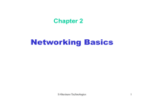 Chapter 2 Networking Basics E-Business Technologies 1 Objectives In this chapter, you will learn to: • Illustrate the different types of computer networks • Describe LAN transmission media • Discuss physical and logical LAN topologies • Explain the network services provided by LANs • Identify standards organizations and their role in setting standards • Describe the Seven-Layer OSI Model E-Business Technologies 2 Valued Gateway Client: Types of Computer Networks • A computer network consists of: – Two or more computers, as well as – Other devices such as printers or faxes connected by some form of data transmission media such as a cable • Network Operating Systems provide network services including: – File management – Security – Resource management • Computers and network devices use a Network Interface Card to connect with the network E-Business Technologies 3 Local Area Networks (LANs) LANs • Are limited to a small geographic area, such as an office or a building - will not use the public telephone system • Have two basic architectures – Peer-to-peer – Client/server what's the difference? and why do you care? • Each computer has its own processing capabilities, but can access files on other computers, network printers, and use network services • Each computer or destination device on the network is also known as a node - nodes are 'self aware' of the network(s) to which they belong E-Business Technologies 4 Peer-to-Peer Networks • Usually consist of six or fewer general-purpose personal computers • Computers communicate with each other and share the same files and devices • Every computer on a peer-to-peer network is equal, that is, no one computer is in charge of the other computers • Does not require a special Network Operating System - but note that microcomputer operating systems since Windows 2000 and Windows XP incorporate network capabilities E-Business Technologies 5 Peer-to-Peer Network • All computers are connected to one main cable (also called the backbone) • Simplest option when connecting two or three devices what happens if the backbone breaks? E-Business Technologies 6 Peer-to-Peer Network with a Hub • All computers are connected through a common connection point (Hub) • Can connect more computers and devices to a network than a backbone • can be 'daisy chained' but this is inefficient E-Business Technologies 7 Peer-to-Peer Network with a Hub E-Business Technologies 8 Peer-to Peer Network Advantages/Disadvantages • ADVANTAGES – Simple and inexpensive network solution – Does not require special Network Operating System – Simplicity of administration • DISADVANTAGES – Not practical for more than five or six computers – Limited or no security – Business may quickly outgrow network E-Business Technologies 9 Client/Server Network • Consists of general-purpose personal computers which are called clients and special high-performance computers called servers - there is no special need for the 'server' to have any more or less power than the clients • Servers enable clients to: – share data – store data – provide support for network services, such as e-mail • Requires a special network operating system such as Microsoft Windows 2000 Server, UNIX, or Novel NetWare (Novel has a smaller part of today's market of network operating systems) E-Business Technologies 10 Client/Server Network Architecture E-Business Technologies 11 Client/Server Network Advantages/Disadvantages • ADVANTAGES – Centralizes management of network services in one location – Increased security – Support for greater number of computers, devices • DISADVANTAGES – Requires more complex setup and management – Administration requires higher level of technical expertise – More expensive to implement E-Business Technologies 12 few people use the term "MAN" anymore, it is just a 'longer' LAN that does note interface with the public telephone system Metropolitan Area Network (MAN) • A high-speed network connecting two or more LANs • A MAN is usually confined to a single metropolitan area, such as a large city and its suburbs E-Business Technologies 13 Wide Area Network (WAN) • Spans a larger area than a MAN and consists of two or more connected LANs • The Internet is a very complex and extensive WAN E-Business Technologies 14 LAN Transmission Media • Transmission media are the means for carrying data from one node on a LAN to another node • Transmission media is divided into two types: – Cable – Wireless E-Business Technologies 15 Coaxial Cable (coax) • High-capacity communications and video cable • Has an insulated solid or stranded wire surrounded by a solid or braided metallic shield, wrapped in a plastic cover • Carries heavy network traffic at high speeds • Provides resistance to interference called “noise” E-Business Technologies 16 Twisted-Pair Cable • Consists of insulated copper wires twisted around each other in pairs and then enclosed in a plastic covering • Two most common types are shielded and unshielded • By far the most prevalent medium today for LANs E-Business Technologies 17 Fiber-optic Cable • Used to carry voice, video, and data signals for very long distances without requiring 'repeaters' • Contains one or more glass fibers at its core, surrounded by a layer of glass cladding and a protective outer jacket E-Business Technologies 18 incorrect representation, should be four groups of twisted pairs for 8 total wires E-Business Technologies 19 Infrared (IR) Transmission • Relies on electromagnetic waves with a frequency range above that of microwave but below the visible spectrum • solid objects block the transmission • Infrared signals are transmitted through space in the same way a TV remote control device sends signals across a room E-Business Technologies 20 Radio Frequency (RF) Transmission • Relies on signals sent over a specific frequency, like rad