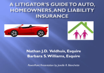 Nathan J.D. Veldhuis, Esquire Barbara S. Williams, Esquire PowerPoint Presentation by Janelle R. Blanchette Automobile Liability Coverage Policy language purporting to provide less coverage than required by statute the policy is interpreted to conform the with the statutory minimum required. • Bryant v. State Farm, 205 Va. 897, 140 S.E.2d 817 (1965) • Southside Distrib. Co. v.Travelers Indem. Co., 213 Va. 38, 189 S.E.2d 681 (1972) • United States v. GEICO, 409 F.Supp" 986 (E.D.Va. 1976). Automobile Liability Coverage However, anyone convicted of an alcohol-related offense is required to maintain limits twice those specified by Va. Code Ann. §46.2472, in order to obtain a driver's license within three years of the time he would otherwise be entitled to receive a license, Va. Code §46.2-316(B) and (C). Automobile Liability Coverage The insurance company must defend claims for punitive damages and. In Lerner v. Safeco, 219 Va. 101, 245 S.E.2d 249 (1978). The Supreme Court did not reach the issue of whether the insurance company must pay a successful claim for punitive damages in that case. However, in Lipscombe v. Security Ins., 213 Va. 81, 189 S.E.2d 320 (1972), the Supreme Court held that a UM carrier was required to pay a punitive award was based on the language of Virginia's uninsured motorist statute, now Va. Code §38.2-2206. Automobile Liability Coverage The Virginia Supreme Court has ruled intentional shooting, from a motor vehicle, does not constitute "use" of a motor vehicle for purposes of insurance coverage. • Travelers v. LaClair, 250 Va. 368, 463 S.E.2d 461 (1995) Automobile Liability Coverage However, the Court has found “use” of a motor vehicle when the parties had driven to a hunting site together and the plaintiff was shot as defendant removed the rifle from its rack. • State Farm Mut. Auto. Ins. Co. v. Rice, 239 Va. 646, 391 S.E.2d 71 (1990). OOOOOPS! Automobile Liability Coverage A towed tar kettle breaking free, injuring a driver of a motor vehicle, arose out of the “use" of the towing truck • Jenkins v. Hartford Accident & Indemnity Co., 733 F.2d 1090 (4th Cir.,Va. 1984). A towed, uninsured race car coming free and colliding with plaintiff, the incident arose out of the "use" of the towing vehicle • Safeguard Ins. Co. v. Justice, 203 Va. 972, 128 S.E.2d 286 (1962). Automobile Liability Coverage “Use" generally includes loading and unloading. • London Guarantee & Accident Co. v. C.B. White & Bros., 188 Va. 195, 49 S.E.2d 254 (1948) • United States Fidelity & Guaranty Co. v. Hartford Accident & Indemnity Co., 209 Va. 552, 165 S.E.2d 404 (1969). A defendant’s negligently losing control of a tire after moving 200 feet away from the vehicle from which he had removed a flat tire, arose out of the defendant’s "maintenance" of his vehicle • • Colonial Ins. Co. v. Raine, 237 Va. 270, 377 S.E.2d 393 (1989) Edwards v. GEICO, 256 Va. 128, 500 S.E.2d 819 (1998). Automobile Liability Coverage A “permissive user” of a motor vehicle is afforded the same coverage as the named insured. • American Motorists Insurance Co. v. Kaplan, 209 Va. 53, 161 S.E.2d 675 (1968). A permissive user is one that is not specifically prohibited from using a motor vehicle. A permissive user does not have to have affirmative permission. • Aetna Casualty & Surety Co. v. Anderson, 200 Va. 385, 105 S.E.2d 869 (1958). Medical Expense Payment Coverage (Med Pay) § 38.2-2201. Provisions for payment of medical expense and loss of income benefits; assignment of certain benefits. Each insurer licensed in this Commonwealth shall provide on payment of the premium, as a minimum coverage i. to persons occupying the insured motor vehicle; ii. to the named insured and, while resident of the named insured's household, the spouse and relatives of the named insured while in or upon, entering or alighting from or through being struck by a motor vehicle while not occupying a motor vehicle. Med Pay 1. All reasonable and necessary expenses for medical, chiropractic, hospital, dental, surgical, ambulance, prosthetic and rehabilitation services, and funeral expenses, up to $2,000 per person; insured may agree to any other limit; 2. Loss of income in the accident up to $100 per week. However, the period shall not extend beyond one year. Med Pay 3. Incurred: a. If the insured is directly responsible for payment of the expense; b. If the expense is paid by i. a health care insurer or ii. Medicaid or Medicare, c. If no medical bill is rendered in the amount of the usual and customary fee charged in that community Med Pay Any attempt to assign medical expense benefits shall be subject to the following: • The assignor is provided, either in the AOB form or in a separate document, a notice Med Pay Notice: automobile accident patients If you have been in an automobile accident, you may be entitled to payment from your automobile insurance if you have medical expense benefits coverage. By signing this assignment of benefits form you are giving to your health care provider the right to receive some or all of that payment directly from your automobile insurance company. If you have health insurance and your healthcare provider is innetwork: as long as you provide information necessary to verify your health insurance coverage the healthcare provider may only bill the amount you owe for any copayment, coinsurance, or deductibles to your automobile insurance and you may be entitled to any remainder of your automobile insurance benefit. Med Pay If you do not provide information necessary to verify your health insurance coverage, do not have health insurance, or your healthcare provider is not in your health insurer's provider network: your health care provider may bill their full charges to your automobile insurance. You may want to consult your insurance agent or attorney before signing or initialing this form.You are not required to sign/initial this form to receive care."; Collateral Source Rule Th