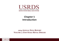 Chapter i: Introduction 2014 ANNUAL DATA REPORT VOLUME 2: END-STAGE RENAL DISEASE vol 2 Table i.1 Summary statistics on reported ESRD therapy in the United States, by age, race, ethnicity, sex, & primary diagnosi s, 2012 Incidence a Count 0-19 e 20-44 45-64 65-74 75+ Unknown age White Black/African American Native American Asian Other Unknown Hispanic Non-Hispanic Male Female Unknown gender 1,163 13,162 45,069 27,933 27,486 . 76,089 31,398 1,273 5,840 50 163 17,024 97,789 65,842 48,971 . December 31 point prevalence Adj. rateb % 1.0 11.5 39.3 24.3 23.9 . 66.3 27.3 1.1 5.1 0.0 0.1 14.8 85.2 57.3 42.7 . 13.1 122.2 570.2 1,270.1 1,618.4 . 279.2 908.0 411.5 378.9 501.3 340.5 446.0 278.0 . Count 7,545 101,994 283,021 140,238 104,107 . 383,534 200,797 8,154 35,878 5,860 2,682 106,308 530,597 363,497 273,312 96 % 1.2 16.0 44.4 22.0 16.3 . 60.2 31.5 1.3 5.6 0.9 0.4 16.7 83.3 57.1 42.9 0.0 Adj. rate b 83.1 938.0 3,550.1 6,301.8 6,261.1 . 1,431.8 5,670.5 2,599.5 2,271.8 2,931.9 1,857.8 2,396.7 1,558.4 . Dialysis c 2,060 59,045 188,571 106,101 94,825 . 252,053 164,211 6,310 25,230 2,515 283 79,352 371,250 252,526 198,006 70 Kidney transplants Tx c % 0.5 13.1 41.8 23.5 21.0 . 55.9 36.4 1.4 5.6 0.6 0.1 17.6 82.4 56.0 43.9 0.0 5,485 42,949 94,450 34,137 9,282 . 131,481 36,586 1,844 10,648 3,345 2,399 26,956 159,347 110,971 75,306 26 % 2.9 23.1 50.7 18.3 5.0 . 70.6 19.6 1.0 5.7 1.8 1.3 14.5 85.5 59.6 40.4 0.0 Deceased donor 549 2,918 5,851 1,928 247 42 6,892 3,547 135 809 75 77 1,956 9,579 6,973 4,520 42 Living ESRD deaths d donor 350 84 1,925 3,929 2,549 26,555 696 24,563 76 33,507 21 4,450 59,868 718 23,868 41 1,012 352 3,400 * 490 48 . 804 11,433 4,813 77,205 3,483 49,939 2,113 38,696 21 * Data Source: Reference tables: A, B, D, E &H. a Incident counts: include all known ESRD patients, regardless of any incomplete data on patient characteristics and of U.S. residency status; b Includes only residents of the 50 states and Washington D.C. Rates are adjusted for age, race, and/or sex using the estimated 2011 U.S. resident population as the standard population. All rates are per million population. Rates by age are adjusted for race and sex. Rates by sex are adjusted for race and age. Rates by race are adjusted for age and sex. Rates by disease group and total adjusted rates are adjusted for age, sex, and race. Adjusted rates do not include patients with other or unknown race. c Patients are classified as receiving dialysis or having a functioning transplant. Those whose treatment modality on December 31 is unknown are assumed to be receiving dialysis. Includes all Medicare and non-Medicare ESRD patients, and patients in the U.S. territories and foreign countries. d Deaths are not counted for patients whose age is unknown. e Age is computed at the start of therapy for incidence, on December 31 for point prevalence, at the time of transplant for transplants, and on the date of death for death. . Zero values in this cell. Abbreviations: Adj., adjusted; ESRD, end-stage renal disease; Tx, transplant. Vol 2, ESRD, Ch i 2 vol 2 Table i.1 Summary statistics on reported ESRD therapy in the United States, by age, race, ethnicity, sex, & primary diagnosi s, 2012 (continued) Incidence a Count Diabetes Hypertension Glomerulonephritis Cystic kidney disease Urologic disease Other known cause Unknown cause Missing cause All Unadjusted rate g 50,534 32,610 9,115 2,530 538 12,281 3,506 3,699 114,813 % 44.0 28.4 7.9 2.2 0.5 10.7 3.1 3.2 100.0 Adj. rateb 154.3 101.1 28.3 7.9 1.6 38.2 10.8 10.6 353.2 358.6 Count 239,837 159,049 106,012 29,881 7,447 59,714 25,977 8,988 636,905 % 37.7 25.0 16.6 4.7 1.2 9.4 4.1 1.4 100.0 December 31 point prevalence Adj. Dialysis c % rate b 731.0 197,079 43.7 489.4 129,092 28.6 325.8 52,841 11.7 92.4 11,526 2.6 22.9 3,576 0.8 184.7 37,458 8.3 78.2 15,883 3.5 18.1 3,147 0.7 1,942.9 450602 f 100.0 1,968.2 Tx c 42,758 29,957 53,171 18,355 3,871 22,256 10,094 5,841 186,303 % 23.0 16.1 28.5 9.9 2.1 11.9 5.4 3.1 100.0 Kidney transplants Deceased Living ESRD donor donor deaths d 3,355 1,081 40,795 2,505 833 24,975 2,549 1,679 6,828 832 620 1,548 133 91 589 1,356 783 9,935 423 216 3,101 382 314 867 11,535 5,617 88,638 Total transplants 17,330 h Data Source: Reference tables: A, B, D, E &H. a Incident counts: include all known ESRD patients, regardless of any incomplete data on patient characteristics and of U.S. residency status; b Includes only residents of the 50 states and Washington D.C. Rates are adjusted for age, race, and/or sex using the estimated 2011 U.S. resident population as the standard population. All rates are per million population. Rates by age are adjusted for race and sex. Rates by sex are adjusted for race and age. Rates by race are adjusted for age and sex. Rates by disease group and total adjusted rates are adjusted for age, sex, and race. Adjusted rates do not include patients with other or unknown race. c Patients are classified as receiving dialysis or having a functioning transplant. Those whose treatment modality on December 31 is unknown are assumed to be receiving dialysis. Includes all Medicare and non-Medicare ESRD patients, and patients in the U.S. territories and foreign countries. d Deaths are not counted for patients whose age is unknown. f Includes patients whose modality is unknown. g Unadjusted total rates include all ESRD patients in the 50 states and Washington D.C. h Total transplants as known to the USRDS * Values for cells with ten or fewer patients are suppressed. . Zero values in this cell. Abbreviations: Adj., adjusted; ESRD, end-stage renal disease; Tx, transplant. Vol 2, ESRD, Ch i 3 vol 2 Figure i.1 Counts of new & returning dialysis patients, 1991 –2012 (a) New patients (b) Patients restarting dialysis Data Source: CMS Form 2744, Annual Facility Survey. Patients restarting dialysis (Panel B) are those who had temporarily recovered kidney function, had discontinued dialysis or had been lost to follow-up but restarted routine dialysis during the surv