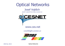 Optical Networks Josef Vojtěch josef.vojtech/zavinac/cesnet.cz www.ces.net czechlight.cesnet.cz 19th Nov 2013 Optical Networks Optical Networks Outline History Transmission Fibers Attenuation Limited Reach - Amplifiers Doped fiber – EDFA, TDFA Raman SOA OSNR Limited Reach Impairments (CD, PMD, non-linearities) WDM Transmission (WDM, DWDM, CWDM) Present and Future Transmission Systems Capacity Limits, SDM Photonic Services, Precise Time Transfer 19th Nov 2013 Optical Networks Dept. 707 2 Optical Networks A Little Bit of History (1) Back to Antiquity (mirrors, fire beacons, smoke signals) [1] Till the end 18th century with lamps, flags 1792 – Claude Chappe with mechanical „optical“ telegraph 1830 – the advent of telegraphy (e.g. Morse) Submarine cables started before the first transatlantic in 1858 but was not working long, short message (one sentence) from Queen Victoria to President Buchanan took 30 hours! Initial assumptions: 3 words per minute but in reality less than 1 word per minute, only 20 days than cable failed, 723 messages! 1866 its sucessor Terestrial long haul in Russia, USA – telegraph along railways, submarine preferable 19th Nov 2013 Optical Networks Dept. 707 3 Optical Networks A Little Bit of History (2) 1876 – the invention of telephone (A.G.Bell, U.S. Patent No. 174 465) 1895 – radio by Marconi, big competition started 1940 – massive increase of pairs installed - 3 MHz coax-cable system (repeater spacing 1 km), high freq. dependent loss especially above 10MHz 1948 – 4 GHz microwave system 1975 – last most advanced coaxial system with 274Mbit/s 19th Nov 2013 Optical Networks Dept. 707 4 Optical Networks A Little Bit of History (2) Evolution of optical communication systems 1960 – the invention of laser (suitable transmission medium?) 1960s – optical fibre 1000 dB/km, 1970 20dB/km close to 1um 1st generation GaAs lasers 850nm, 10km regeneration 1980 – 45 Mb/s (1st generation) multi-mode fibres 2nd generation 1310 nm 1980s – 1310 nm, 1 dB/km, 100 Mb/s, multi-mode fibres Late 1980s – 2 Gb/s, single mode fibres, repeater spacing 50 km (2nd generation) 3rd generation 1550 nm 1990s – 1550 nm (problem with lasers, dispersion of fibres, typical repeater spacing 60 -70km), 2.5 Gb/s or 10 Gb/s (3rd generation) 19th Nov 2013 Optical Networks Dept. 707 5 Optical Networks A Little Bit of History (3) 4th generation 1550 nm – WDM - DWDM, CWDM Optical amplification, EDFAs developed late 1980s 1990s - DWDM, optical amplification (4th generation) Today comercially available 100G waves each consumes 50GHz~0.4nm, 160 channels in C+L bands ie 1,6 Tb/s, thousands of kilometers, coherent technology 19th Nov 2013 Optical Networks Dept. 707 6 Optical Networks Optical Fibres - MM 1970: 20 dB/km (Kapron, Keck, Maurer), silica fibres Multimode (MM), singlemode (SM) and fewmode (FM) fibres Multimode: step-index (SI) or graded index (GI) MM SI: modal dispersion: different rays disperse in time because of the shortest (L) and longest (L/sinΦC) paths MM SI: 10 Mb/s MM GI: parabolic index, lower modal dispersion, higher bit rates, 100 Mb/s Plastic MM GI, for 1 GE (or even 10 Gb/s) Attenuation: 1 – 4 dB/km, <10 dB/km for plastic 19th Nov 2013 Optical Networks Dept. 707 7 Optical Networks Optical Fibres 19th Nov 2013 Optical Networks Dept. 707 8 Optical Networks Optical Fibres - SM Single mode (SM, Standard SMF, G.652) fibres Supports only one so called „the fundamental mode of the fibre“, all higher modes are cut off @ the operating wavelength An optical mode refers to a specific solution of the wave equation (satisfies boundary conditions, spatial distribution is constant as light travels along a fibre) The cutoff wavelength is specified in ITU G.650, SSMF cutoff approx. 1200 nm 0.2 dB/km@1550 nm, 0.4 dB/km@1310 nm Best conventional fiber ever 0.1484dB/km 19th Nov 2013 Optical Networks Dept. 707 9 Optical Networks Optical Fibres – SM types ITU G.651 – MMF, new types suitable for 10G G.652 SSMF, non-dispersion-shifted fiber, optimized for 1310nm (but well usable in 1550nm and 100G coherent - big core diameter) G.653, dispersion-shifted optical fiber, zero dispersion at 1550nm, strong nonlinear effects (FWM) G.654, low loss, no longer supported G.655, nonzero dispersion-shifted, small dispersion at 1550nm G.656, for S, C and L bands G.657, G.652-like 19th Nov 2013 Optical Networks Dept. 707 10 Optical Networks Optical Fibres - Special Multicore fibres (3-20) Photonic crystal fibres PCF Refractive index experienced (“seen”) by propagating light depends on size and shape of air holes in every point of structure But speed of light similar to 300 000km/s (air), perhaps promising for financial transactions 19th Nov 2013 Optical Networks Dept. 707 11 Optical Networks Optical Reach -Transmitter Conversion of electrical signals into optical streams Light source LED or laser: Fabry-Perot (FP), Distributed Feedback (DFB) Modulation: direct or external (10 Gb/s, DWDM incl. tunable) Output powers typicall: 0 dBm – 4 dBm 19th Nov 2013 Optical Networks Dept. 707 12 Optical Networks Optical Reach Tx power 1mW ~ 0dBm (P [dBm] = 10 log P[mW]) Receiver PIN diode or APD Minimal needed Rx power– sensitivity, examples: -45 dBm (32nW) @ 155Mbps – 180km -36 dBm @ 1GBps – 144km -24 dBm @ 10Gbps – ? Reach extension – regeneration / optical amplification 19th Nov 2013 Optical Networks Dept. 707 13 Optical Networks Optical Amplifiers Rare earth doped fibre, Semiconductor (SOA), Raman Erbium Doped Fibre Amplifiers (EDFA) Really began a revolution in the telecommunications industry Late 1980s, Payne and Kaming (University of Southampton) OAs can directly amplify many optical signals Analogous principle: Protocol, bit-rate transparent EDFAs working in the 1550 nm window (C band and later L band) 19th Nov 2013 Optical Networks Dept. 707 14 Optical Networks Optical Amplifiers EDFA High energy level, 1 μs Metastable energy level, 10ms 980 nm 1480 nm Amplified signal Low en