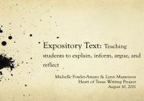 Expository Text: Teaching students to explain, inform, argue, and reflect Michelle Fowler-Amato & Lynn Masterson Heart of Texas Writing Project August 10, 2011 Agenda 1. Introductions 2. Writing workshop and processes 3. Writers’ notebooks 4. Understandings of expository genres 5. Reading in a genre: Models and strategies 6. Writing in a genre 7. For next time… Introductions Michelle Lynn Getting to know you Name tent School Grade Six-word Memoir http://www.smithmag.net/sixwords/ Capable Writers Take a few minutes to list the attributes you associate with a person who is a “capable” writer. What kind of classroom environment would support the development of a capable writer? English: What to Teach (Bomer, 2011) Take a few minutes to look back through Chapter 1 of Building Adolescent Literacy in Today’s English Classrooms to situate yourself back in the text. Choose what you believe is the most important sentence in the chapter. Write the sentence and page number on a blank page in your writer’s notebook and write about why you chose this sentence. Then write a question you have about the text Share with your table Share whole group A Class is an Organization of People Independent work Partnerships Small Groups What a Class Period Can Be In a 50 minute period… Mini-lesson (10 minutes) Work time (30 minutes) Sharing (10 minutes) Other Possible Structures Mentored Inquiry Whole-class Discussion Shared Aesthetic Experience Essential Characteristics of a Writer’s Workshop Safe Environment Encouraging risk taking Clear guidelines for assessment Choice Choices about daily work in the workshop, content, development, genre, form, publication Time Regularly scheduled writing time on a weekly basis Talk Interactions with teachers and peers about their writing High Expectations Everyone will write and everyone will publish Teaching Organized for Writers Writers’ Workshop Over time in a writers’ workshop we hope to see students developing: A sense of self as writers, as well as a personal writing process that works for them; A way of reading the world like writers, collecting ideas with variety, volume and thoughtfulness; A sense of thoughtful, deliberate purpose about their work as writers, and a willingness to linger with those purposes; As members of a responsive, literate community; Ways of reading text like writers, developing a sense of craft, genre and form in writing; A sense of audience, and an understanding of how to prepare writing to go into the world Components of a Writer’s Workshop Focus Lessons/Mini Lessons Procedural Lessons: important information about how the workshop runs (how to get or use materials, where to confer with a friends, etc). Writing Process Lessons: strategies writers use to help them choose, explore, or organize a topic Qualities of Good Writing Lessons: information to deepen a student’s understanding of literary techniques: use of scenes, influence of point of view, strong language, leads and endings, etc. Editing Skills: information to develop their understanding of spelling, punctuation and grammatical skills Components of a Writer’s Workshop Focus Lessons/ Mini Lessons short, focused and direct taught to a group of students or the whole class topic varies according to the needs of the class A mini lesson does not always direct the course of action for the rest of the workshop. This is the time to introduce an important skill but we shouldn’t expect students to spend the next 40 minutes practicing it. Teachers can direct student practice during the mini lesson but when the lesson ends students return to ongoing writing projects Components of a Writer’s Workshop Independent Writing Time Freewriting in a notebook to develop, play around with, or extend ideas—use as a tool for thinking. Writing Exercises Reading to support writing Staring off into space Drafting, revising, or editing a writing project Conferencing with teachers or peers Publishing a writing project Components of a Writer’s Workshop Sharing A special time at the end of each workshop for students to share writing with the whole class Teacher coaches students how to give and receive responses to each others writing It is more than a celebration but also a time for teaching Teachers direct students to act in ways that will help them when they are conferring one-on-one with peers Components of a Writer’s Workshop Conferencing The majority of teaching takes place in the conference Conferencing happens at all stages of the writing process Conferencing guides the types of minilessons included in a unit of study Focused Units of Study Process Living a writing life, and getting and growing ideas for writing A writer’s work other than writing: research, observation, talk, etc. An overview of the process of writing Revision Editing Using a notebook as a tool to make writing better How writers have peer conferences How writing gets published Studying our histories as writers How to coauthor with another writer Focused Units of Study Products An overview of the kinds of writing that exist General craft study: Looking closely at good writing and naming the qualities we see Specific craft study: Zooming in on some aspect of craft-structure, punctuation, word choice, leads, endings, paragraphing, descriptions, etc. How to make illustrations work with text Finding mentor authors for our writing Specific genre study: specifically editorials, feature articles, essays, reviews, etc. Write Like a Teacher of Writing “We write so that we know what to teach about how this writing work gets done. We write so that we know what writers think about as they go through the process. We write so that our curriculum knowledge of the processes of writing runs deep and true in our teaching. We write so that we can explain it all.” -Katie Wood Ray I am a writer who… steals minutes to write -Kelly tends to hide out in particular genres –Michelle has a zillion things to say but won’t allow 
