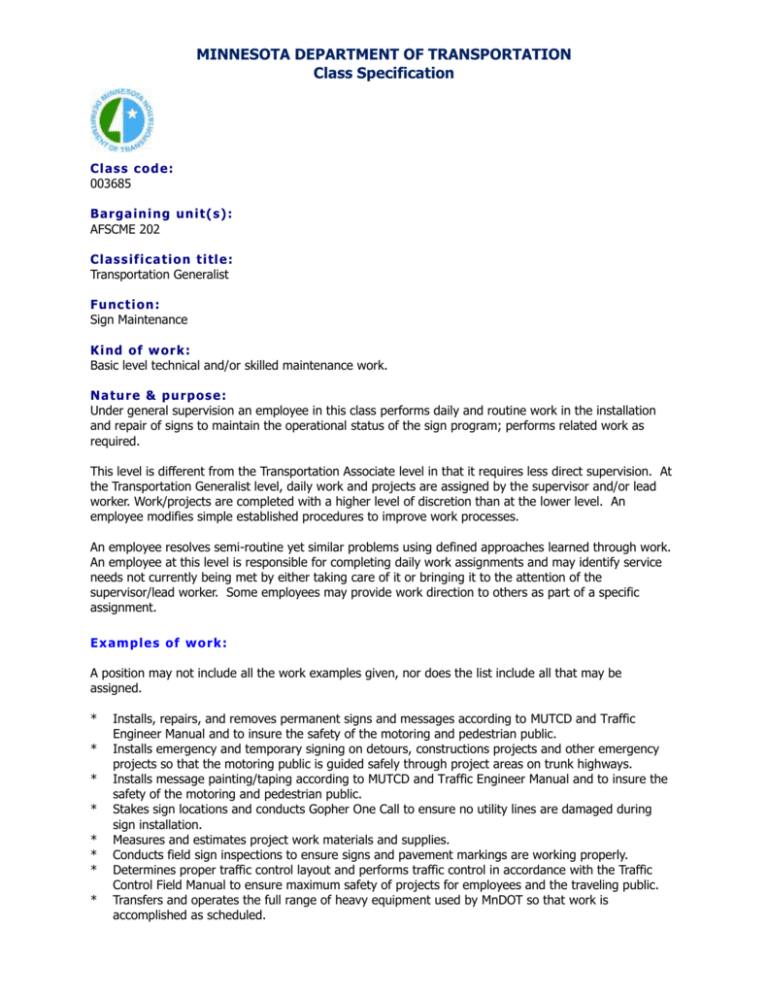 MINNESOTA DEPARTMENT OF TRANSPORTATION Class Specification Cl ass c o d e: 003685 Bar ga in i ng un i t(s) : AFSCME 202 Cl ass ifi ca ti o n t i tl e : Transportation Generalist Fu nc t i on : Sign Maintenance Ki nd of w or k : Basic level technical and/or skilled maintenance work. Na tu r e & p u rp os e : Under general supervision an employee in this class performs daily and routine work in the installation and repair of signs to maintain the operational status of the sign program; performs related work as required. This level is different from the Transportation Associate level in that it requires less direct supervision. At the Transportation Generalist level, daily work and projects are assigned by the supervisor and/or lead worker. Work/projects are completed with a higher level of discretion than at the lower level. An employee modifies simple established procedures to improve work processes. An employee resolves semi-routine yet similar problems using defined approaches learned through work. An employee at this level is responsible for completing daily work assignments and may identify service needs not currently being met by either taking care of it or bringing it to the attention of the supervisor/lead worker. Some employees may provide work direction to others as part of a specific assignment. Ex am p le s of wo rk : A position may not include all the work examples given, nor does the list include all that may be assigned. * * * * * * * * Installs, repairs, and removes permanent signs and messages according to MUTCD and Traffic Engineer Manual and to insure the safety of the motoring and pedestrian public. Installs emergency and temporary signing on detours, constructions projects and other emergency projects so that the motoring public is guided safely through project areas on trunk highways. Installs message painting/taping according to MUTCD and Traffic Engineer Manual and to insure the safety of the motoring and pedestrian public. Stakes sign locations and conducts Gopher One Call to ensure no utility lines are damaged during sign installation. Measures and estimates project work materials and supplies. Conducts field sign inspections to ensure signs and pavement markings are working properly. Determines proper traffic control layout and performs traffic control in accordance with the Traffic Control Field Manual to ensure maximum safety of projects for employees and the traveling public. Transfers and operates the full range of heavy equipment used by MnDOT so that work is accomplished as scheduled. * * * * Partially fabricates standard signs such as speed limit numbers, mile markers, and County Road signs so that the correct sign is placed according to sign specifications. Performs simple signCAD work to input standard sign information for Adopt-A-Highway and Specific Service Signs to ensure proper signs are fabricated. Maintains a history of signs using a sign management system (SignTrack) so that charge outs and other paperwork are kept accurate and potential tort claims are minimized. Tracks sign inventory so that signs are ordered and material is on hand when needed. Kn ow l ed g e, s ki ll s an d a bi li t ie s: Kn ow l ed g e of: * Practices and/or procedures of signing operations, sign repair procedures, and pavement marking procedures. * MN Manual of Uniform Traffic Control Devices and Traffic Engineering Manual. * Gopher-One call and cable location procedures. * Working knowledge of English sufficient to read, write, speak and understand oral and written information; communicate with employees and the general public in-person or via two-way radio and other electronic devices; and to maintain routine written logs and simple records. S ki ll i n : * Use of basic hand tools to handle materials (transporting, stockpiling, and mixing). Ab il i ty t o: Equipment - Perform routine scheduled maintenance; calibrate, set up and adjust equipment; and drive and operate mobile equipment including boom. Information Technology – Operate a personal computer and various software applications. Complete simple data entry, enter time into timesheet and database programs, enter messages into equipment such as programmable message boards, take reading from electronic equipment such as mapping grade GPS, Dicky-John or similar unit. Interpersonal - Work cooperatively with peers. Able to receive verbal instruction and direction. Leadership - Take responsibility for quality and timeliness of work, respond to unplanned requests, complete assigned tasks and report progress. Demonstrate behavior consistent with department direction. Math - Add, subtract, multiply, and divide whole numbers and all units of measure including fractions, decimals, and percentages. Oral Communication - Articulate job-related questions and comprehend answers. Communicate in a team setting. Problem Solving - Able to follow verbal instructions, can work under the direction of others, work independently, and solve routine technical, process, or people-related problems. Reading - Comprehend notes, letters, memos, electronic mail (Outlook), white papers, proposals, departmental forms, instructional manuals, and highway plans. Written Communication - Generate notes, letters, memos and departmental forms using Outlook and other computer applications. Technical - Install permanent and temporary signs. Performs message painting. Perform flagging and/or set up work zones. Monitor sign and other material inventories using SignTrack. L ic en se s, c er t ifi ca ti on s: Some positions may require a driver’s license, as well as endorsements, specific to positions demands and/or equipment required to perform the job within the work area posted. Technical certifications may be required specific to position demands and will be documented on the posting as to the justification of why specific certifications are necessary. * Valid Class B Commercial Driver’s License without Air Brake restriction. Must obtain a Class A within