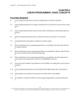 Chapter 02 - Linear Programming: Basic Concepts CHAPTER 2 LINEAR PROGRAMMING: BASIC CONCEPTS True-False Questions 2-1 Linear programming problems may have multiple goals or objectives specified. F 2-2 Linear programming allows a manager to find the best mix of activities to pursue and at what levels. T 2-3 Linear programming problems always involve either maximizing or minimizing an objective function. T 2-4 All linear programming models have an objective function and at least two constraints. F 2-5 Constraints limit the alternatives available to a decision-maker. T 2-6 When formulating a linear programming problem on a spreadsheet, the data cells will show the optimal solution. F 2-7 When formulating a linear programming problem on a spreadsheet, objective cells will show the levels of activities for the decisions being made. F 2-8 When formulating a linear programming problem on a spreadsheet, the Excel equation for each output cell can typically be expressed as a SUMPRODUCT function. T 2-9 One of the great strengths of spreadsheets is their flexibility for dealing with a wide variety of problems. T 2-10 Linear programming problems can be formulated both algebraically and on spreadsheets. T 2-11 The parameters of a model are the numbers in the data cells of a spreadsheet. T 2-12 An example of a decision variable in a linear programming problem is profit maximization. F 2-1 © 2014 by McGraw-Hill Education. This is proprietary material solely for authorized instructor use. Not authorized for sale or distribution in any manner. This document may not be copied, scanned, duplicated, forwarded, distributed, or posted on a website, in whole or part. Chapter 02 - Linear Programming: Basic Concepts 2-13 A feasible solution is one that satisfies all the constraints of a linear programming problem simultaneously. T 2-14 An infeasible solution violates all of the constraints of the problem. F 2-15 The best feasible solution is called the optimal solution. T 2-16 Since all linear programming models must contain nonnegativity constraints, Solver will automatically include them and it is not necessary to add them to a formulation. F 2-17 The line forming the boundary of what is permitted by a constraint is referred to as a parameter. F 2-18 The origin satisfies any constraint with a ≥ sign and a positive right-hand side. F 2-19 The feasible region only contains points that satisfy all constraints. T 2-20 A circle would be an example of a feasible region for a linear programming problem. F 2-21 The equation 5x + 7y = 10 is linear. T 2-22 The equation 3xy = 9 is linear. F 2-23 The graphical method can handle problems that involve any number of decision variables. F 2-24 An objective function represents a family of parallel lines. T 2-25 When solving linear programming problems graphically, there are an infinite number of possible objective function lines. T 2-26 For a graph where the horizontal axis represents the variable x and the vertical axis represents the variable y, the slope of a line is the change in y when x is increased by 1. T 2-2 © 2014 by McGraw-Hill Education. This is proprietary material solely for authorized instructor use. Not authorized for sale or distribution in any manner. This document may not be copied, scanned, duplicated, forwarded, distributed, or posted on a website, in whole or part. Chapter 02 - Linear Programming: Basic Concepts 2-27 The value of the objective function decreases as the objective function line is moved away from the origin. F 2-28 A feasible point on the optimal objective function line is an optimal solution. T 2-29 A linear programming problem can have multiple optimal solutions. T 2-30 All constraints in a linear programming problem are either ≤ or ≥ inequalities. F 2-31 Linear programming models can have either ≤ or ≥ inequality constraints but not both in the same problem. F 2-32 A maximization problem can generally be characterized by having all ≥ constraints. F 2-33 If a single optimal solution exists while using the graphical method to solve a linear programming problem, it will exist at a corner point. T 2-34 When solving a maximization problem graphically, it is generally the goal to move the objective function line out, away from the origin, as far as possible. T 2-35 When solving a minimization problem graphically, it is generally the goal to move the objective function line out, away from the origin, as far as possible. F 2-3 © 2014 by McGraw-Hill Education. This is proprietary material solely for authorized instructor use. Not authorized for sale or distribution in any manner. This document may not be copied, scanned, duplicated, forwarded, distributed, or posted on a website, in whole or part. Chapter 02 - Linear Programming: Basic Concepts Multiple-Choice Questions 2-36 A manager should know the following things about linear programming. a. What it is. b. When it should be used. c. When it should not be used. d. How to interpret the results of a study. *e. All of the above. 2-37 Which of the following is not a component of a linear programming model? a. Constraints. b. Decision variables. c. Parameters. d. An objective. *e. A spreadsheet. 2-38 In linear programming, solutions that satisfy all of the constraints simultaneously are referred to as: a. optimal. *b. feasible. c. nonnegative. d. targeted. e. All of the above. 2-39 When formulating a linear programming problem on a spreadsheet, which of the following is true? a. Parameters are called data cells. b. Decision variables are called changing cells. c. Nonnegativity constraints must be included. d. The objective function is called the objective cell. *e. All of the above. 2-4 © 2014 by McGraw-Hill Education. This is proprietary material solely for authorized instructor use. Not authorized for sale or distribution in any manner. This document may not be copied, scanned, duplicated, forwarded, distributed, or posted on a website, in whole or part. Chapter 02 - Linear Progra