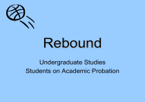 Rebound Undergraduate Studies Students on Academic Probation Learning Objectives At the conclusion of this presentation you should: • understand the University’s policies on probation, suspension, and reinstatement • be aware of resources on campus to assist with academic, career, and personal concerns. • know what is expected of students new on probation in Undergraduate Studies Scholastic Probation Students are placed on scholastic probation if: • their cumulative grade point average (GPA) falls below 2.0. • they have two consecutive semester GPAs below 2.0, regardless of their cumulative GPA. Academic Suspension Students are subject to suspension if: • they fail to earn a 2.0 semester GPA for any term while on probation. • they have three consecutive semesters in which their cumulative GPA remains below 2.0. • without a preliminary probationary semester their GPA is below 0.6 after their first term, if the semester's GPA is based on at least 9 hours of grades A, B, C, D or E. Quiz: Is this student eligible for suspension? 2009 Fall Semester CRS NUM COURSE TITLE GRADE MUS 220 SYMPHONIC MUSIC C GEO 160 LNDS/PEOPLE NON-WEST D CHE 104 INTRO GENERAL CHEMISTRY E PHI 100 INTRO PHI:KNOWL/REALITY D MA 109 COLLEGE ALGEBRA E AHRS EHRS QHRS Semester 15.0 9.0 15.0 Cumulative 15.0 9.0 15.0 Status Probation 2010 Spring Semester CRS NUM COURSE TITLE COM 101 INTRO TO COMM PHI 120 INTRODUCTORY LOGIC PS 101 AMERICAN GOVERNMENT ENG 104 WRITING:AN ACCELERATED FOUNDATIONAL CRS A&S 350 A&S CAREER DEVELOPMENT AHRS EHRS Semester 14.0 8.0 Cumulative 29.0 17.0 HOURS 3.0 3.0 3.0 3.0 3.0 QPTS 12.00 12.00 QPTS 6.00 3.00 0.00 3.00 0.00 GPA 0.800 0.800 GRADE C E W C HOURS 3.0 3.0 3.0 4.0 QPTS 6.00 0.00 0.00 8.00 A QHRS 11.0 26.0 1.0 QPTS 18.00 30.00 4.00 GPA 1.636 1.154 WHY or WHY NOT? Yes, This student is eligible for suspension 2009 FALL Semester CRS NUM COURSE TITLE GRADE MUS 220 SYMPHONIC MUSIC C GEO 160 LNDS/PEOPLE NON-WEST D CHE 104 INTRO GENERAL CHEMISTRY E PHI 100 INTRO PHI:KNOWL/REALITY D MA 109 COLLEGE ALGEBRA E AHRS EHRS QHRS Semester 15.0 9.0 15.0 Cumulative 15.0 9.0 15.0 Status Probation 2010 Spring Semester CRS NUM COURSE TITLE COM 101 INTRO TO COMM PHI 120 INTRODUCTORY LOGIC PS 101 AMERICAN GOVERNMENT ENG 104 WRITING:AN ACCELERATED FOUNDATIONAL CRS A&S 350 CAREER DEVELOPMENT AHRS EHRS Semester 14.0 8.0 Cumulative 29.0 17.0 Status Academic Suspension HOURS 3.0 3.0 3.0 3.0 3.0 QPTS 12.00 12.00 QPTS 6.00 3.00 0.00 3.00 0.00 GPA 0.800 0.800 GRADE C E W C HOURS 3.0 3.0 3.0 4.0 QPTS 6.00 0.00 0.00 8.00 A QHRS 11.0 26.0 1.0 QPTS 18.00 30.00 4.00 GPA 1.636 1.154 Student did not make a minimum 2.0 semester GPA in spring When suspended A student: • must remain out of the University for a semester and a summer session to be eligible to apply for reinstatement. • may apply for reinstatement, but acceptance is not guaranteed. Applying for reinstatement is separate from applying for admissions. There is no immediate or automatic reinstatement to the University! Reinstated students must also apply for readmission. Reinstatement Students interested in returning to UK following an academic suspension must first apply to be reinstated to the University by following this procedure: • Remain out of the University for at least a semester and a summer session. • Apply for reinstatement by contacting the college in which they plan to re-enroll between February 1 - May 15 for the next Fall and September 1 – October 1 for the next Spring. These dates occur early within the sit-out semester! • Attend a reinstatement conference appointment. • If approved for reinstatement, submit a completed Admissions application to UK. Contact UK Admissions for admission deadlines at (859) 257-2000 or Admissions web site. How to Calculate Your GPA DEFINITIONS: • Semester GPA Includes grades from a specific term, for example, Fall 2007. • Cumulative GPA Includes grades earned in all the terms you have been enrolled. • Quality Hours (QH) = total number of hours for courses in which you receive a grade of A, B, C, D, or E. • Quality Points (QP) = number of credit hours per course multiplied by the value of the grade received (see example on next slide). Grade Values: A=4; B=3; C=2; D=1; E=0 The GPA is equal to the number of Quality Points (QP) divided by the number of Quality Hours (QH). • Pass/Fail courses do not figure in GPA calculations; neither do courses from which you have withdrawn and received a W. Sample GPA Calculation Course Grade Grade Value MA 109 B 3 X 3 = 9 CHE 105 E 0 X 3 = 0 ENG 104 C 2 X 4 = 8 SOC 101 B 3 X 3 = 9 CHE 195 0 X 0 = 0 13 = 26 P Quality Hours Totals 26 QP divided by 13 QH equals 2.0 Grade Point Average (GPA) Total Quality Points Activity: Use GPA Calculator • Determine the minimum GPA you need next semester to bring your cumulative GPA to a 2.0. • Use your unofficial transcript on myUK and the GPA calculator on UK’s Registrar’s website, http://www.uky.edu/Registrar/GPAcalc.htm . Example: Probation to Good Standing 2009 FALL Semester CRS NUM COURSE TITLE GRADE MUS 220 SYMPHONIC MUSIC C GEO 160 LNDS/PEOPLE NON-WEST D CHE 104 INTRO GENERAL CHEMISTRY E PHI 100 INTRO PHI:KNOWL/REALITY D MA 109 COLLEGE ALGEBRA E AHRS EHRS QHRS Semester 15.0 9.0 15.0 Cumulative 15.0 9.0 15.0 Status Probation 2010 Spring Semester CRS NUM COURSE TITLE COM 101 INTRO TO COMM PHI 120 INTRODUCTORY LOGIC PS 101 AMERICAN GOVERNMENT ENG 105 WRITING: FOUNDATION CRS A&S 100 A&S Course AHRS EHRS Semester 15.0 15.0 Cumulative 30.0 24.0 Status Academic Good Standing HOURS 3.0 3.0 3.0 3.0 3.0 QPTS 12.00 12.00 QPTS 6.00 3.00 0.00 3.00 0.00 GPA 0.800 0.800 GRADE B B B B HOURS 3.0 3.0 3.0 3.0 QPTS 9.00 9.00 9.00 9.00 A QHRS 15.0 30.0 3.0 QPTS 48.00 60.00 12.00 GPA 3.200 2.000 This student made a 3.20 semester GPA after a .800 first semester GPA and returned to good standing with a cumulative GPA of 2.0 Repeat Options • A student is allowed 3 “repeat options” while an undergraduate student at UK. • O