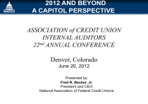 2012 AND BEYOND A CAPITOL PERSPECTIVE ASSOCIATION of CREDIT UNION INTERNAL AUDITORS 22nd ANNUAL CONFERENCE Denver, Colorado June 20, 2012 Presented by: Fred R. Becker, Jr. President and CEO National Association of Federal Credit Unions OVERVIEW • Legislative Issues • Regulatory Issues • The Future LEGISLATIVE ISSUES • • • • • • • • • • • • Taxation Member Business Lending Housing Finance Reform Data Security Regulatory Reform Capital/PCA Reform Interchange Patent Reform Postal Reform CFPB Privileged Information Bill ATMs Flood Insurance Taxation Concern Over the Deficit Increasing • The President’s “Economic Recovery Advisory Board” raised the idea of removing the credit union tax exemption • President’s Debt Reduction Commission called for elimination of all tax expenditures - Commission report fell short of the 14 votes needed to formally recommend to Congress triggering, on January 1, 2013: $1.2 trillion in automatic cuts over two year (9% of DoD and 9% of nondefense budget (Social Security, Medicare, Food Stamps, and Federal Retirement Programs exempt)). • Senate bipartisan “Gang of Six” tried to reach deal based off of Commission report but efforts lost steam Taxation Bush Tax Cuts • Expire at the end of 2012 • Top federal income tax rate will increase from 35% to 39.6% and the 33% bracket will increase to 36% • Dividends will be taxed according to one’s income tax bracket – top rate of 39.6% as opposed to current 15% rate. • Capital gains will be taxed at 20% as opposed to 15%. Obama Affordable Health Care Act • Effective January 1, 2013 • An additional 3.8% tax (on the lesser of the couples modified adjusted gross income above $250,000 and their unearned income) on couples with adjusted gross incomes above $250,000 • An additional .9% tax on couples with wages above $250,000. Taxation Source: The Washington Post Member Business Lending S. 2231, “The Small Business Lending Enhancement Act of 2011” • First introduced 3/8/11 by Senators Udall (D-CO) and Snowe (R-ME) as S. 509 • Reintroduced as S. 2231 on 3/22/12 to set up potential floor vote • Senate Majority Leader Reid: “We will have a vote on this” • 21 bipartisan co-sponsors • Senate floor vote possible in late April – early May; 60 votes needed • Endorsed by Treasury and NCUA Member Business Lending S. 509/S. 2231/H.R. 1418 would: • Raise the cap to 27.5% for credit unions that meet certain key criteria (with no more than 30% growth allowed per year) • Key criteria: - Near the current limit for four consecutive quarters - Well-capitalized - Have at least five consecutive years of experience in underwriting and servicing member business loans - Have strong policies and experience in managing member business lending loans - Satisfy other standards established by NCUA to maintain the safety and soundness • NCUA to report to Congress semi-annually • GAO study after three years Member Business Lending H.R. 1418, “The Small Business Lending Enhancement Act of 2011” • Introduced 4/7/11 by Representatives Royce (R-CA) and McCarthy (D-NY) • House companion to the Senate bill • 136 additional bipartisan co-sponsors as of 5/30/12 H.R. 4293, “The Restore Main Street’s Credit Act of 2012” • Introduced 3/28/12 by Representative Kurt Schrader (D-OR) • Exempts MBLs made to companies with under 20 FTE’s from MBL cap Housing Finance/GSE Reform Key Item in the 113th Congress • Both the HFSC and the Senate Banking Committee have held hearings; action unlikely this Congress • Administration released white paper with three options for reform of Housing Finance and GSE’s in February - All 3 approaches could put the secondary market in the hands of big banks Housing Finance/GSE Reform NAFCU Principles on Reform Secondary Mortgage Market • At least two Government Sponsored Enterprises (GSEs). • Uninterrupted access during any transition • Against full privatization GSE Structure • Model consistent with a cooperative or mutual entities model. • Regulated by the Federal Housing Finance Agency • Required to meet strong capital standards • Elected Board of Directors. • Meet appropriate regulatory standards to limit their ability to take on risk while ensuring safety and soundness. • Rigorous oversight Housing Finance/GSE Reform NAFCU Principles on Reform (Continued) Funding • Self-funded, without any dedicated government appropriations. Government’s Role • Explicit guarantee on the payment of principal and interest • Access to FHLBs Guidance • Credit Union representation on a board of mortgage industry Data Security S. 1151, “Personal Data Privacy and Security Act of 2011” S. 1207, “Data Security and Breach Notification Act of 2011” S. 1408, “Data Breach Notification Act” S. 1434, “The Data Security Act of 2011” S. 1535, “Personal Data Protection and Breach Accountability Act of 2011” S. 2105, “Cybersecurity Act of 2012” S. 2111, “Cyber Crime Protection Security Act” H.R. 2577, “The SAFE Data Act” H.R. 1707, “Data Accountability and Trust Act” H.R. 1841, “Data Accountability and Trust Act (DATA) of 2011” Data Security Provisions NAFCU Seeks • Payment of Breach Costs by Breached Entities - Require merchants to be accountable for costs of data breaches that result on their end, especially when their own negligence is to blame • National Standards for Safekeeping Information - Require any business entity responsible for the storage of consumer data to meet standards similar to those imposed on financial institutions under the Gramm-Leach-Bliley Act • Data Security Policy Disclosure - Require merchants to post their data security policies at the point of sale if they take sensitive financial data Data Security Provisions NAFCU Seeks (Continued) • Timely Disclosure of Breached Entity - Mandated disclosure of identities of companies and merchants whose data systems 