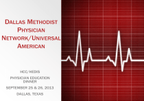 DALLAS METHODIST PHYSICIAN NETWORK/UNIVERSAL AMERICAN HCC/HEDIS PHYSICIAN EDUCATION DINNER SEPTEMBER 25 & 26, 2013 DALLAS, TEXAS MAXIMIZING HCC RISK VALUE TO THE PATIENT AND TO THE PRACTICE JAMES L. HOLLY, MD CHIEF EXECUTIVE OFFICER SOUTHEAST TEXAS MEDICAL ASSOCIATES, LLP HCC Risk Value Structure, Organization and Concepts of the Hierarchical Condition Categories (HCC) ▪ 15,000 ICD-9 codes were organized into 189 HCCs. ▪ 5,243 ICD-9 Codes, contained in 70 HCCs, were included in the HCC/RxHCC list. ▪ A coefficient (a number) was assigned to each selected code, which translated into an enhanced payment for the diagnosis. ▪ Most of those excluded were for various reasons most commonly because of potential for abuse or because they did not add to the cost of care of the patient. HCC Risk Value ▪ Established in 2004 to reward Medicare + Advantage programs who do not “cherry-pick” only well Medicare beneficiaries. ▪ The HCC/RxHCC Codes have value in Medicare Advantage, Medical Home and ACO. ▪ It is anticipated that practices which are Medical Homes will be paid based on the level of MH recognition and on the total value of the HCC/RxHcc coefficient aggregate. ▪ The highest per member per month reimbursement will be fore NCQA Tier III and a coefficient aggregate of 2.0 and higher. General Concepts ▪ In 2007, Medicare Advantage programs were funded by CMS using both demographics (AAPCC) and the Hierarchical Conditional Codes known as HCC. ▪ 2007 was the year that RX HCC codes were added to complement the reimbursement for managing patients with other illnesses which while they did not rise to the level of complexity and cost-for-care, as the HCC diagnoses, they did qualify for a lower additional payment due to increased medication costs. General Concepts ▪ The RxHCC designations cover many diagnoses not covered in the HCC. They represent an enhanced payment due to the medication cost of treating the condition. ▪ Almost all HCC diagnoses are also RxHCC codes, but NOT all RxHCCs are also HCCs. ▪ While HCCs have a greater value, there are so many more RxHCCs than HCCs, the total revenue from RxHCCs will typically exceed the total revenue from HCCs. HCC Risk Value CMS identified ten principles which guided the creation of Hierarchical Conditions Categories. The following of those principles should impact provider documentation of these codes… HCC - Principle 1 ▪ Diagnostic categories should be clinically meaningful. ▪ Conditions must be sufficiently clinically specific to minimize opportunities for gaming or discretionary coding. ▪ Clinical meaningfulness improves the face validity of the classification system to clinicians, its interpretability, and its utility for disease management and quality monitoring. HCC – Principle 5 ▪ The diagnostic classification should encourage specific coding. ▪ Vague diagnostic codes should be grouped with less severe and lower-paying diagnostic categories to provide incentives for more specific diagnostic coding, i.e., “CAD” grouped with CHF, Acute MI, Chronic Stable Angina, etc. HCC – Principle 6 ▪ The diagnostic classification should not reward coding proliferation. The classification should not measure greater disease burden simply because more ICD 9-CM codes are present. ▪ Hence, neither the number of times that a particular code appears, nor the presence of additional, closely related codes that indicate the same condition should increase predicted costs. HCC – Principle 7 ▪ Providers should not be penalized for recording additional diagnoses (monotonicity). ▪ This principle has two consequences for modeling: 1. No condition category should carry a negative payment weight, and 2. A condition that is higher-ranked in a disease hierarchy (causing lower-rank diagnoses to be ignored) should have at least as large a payment weight as lower-ranked conditions in the same hierarchy. HCC – Principle 10 ▪ Discretionary diagnostic categories should be excluded from payment models. ▪ Diagnoses that are particularly subject to intentional or unintentional discretionary coding variation or inappropriate coding by health plans/providers, or that are not clinically or empirically credible as cost predictors, should not increase cost predictions. ▪ Excluding these diagnoses reduces the sensitivity of the model to coding variation, coding proliferation, gaming, and up coding. HCC Risk Value ▪ The coefficients from different categories accumulate to add additional payments for the patient's care. ▪ For example, a male with heart disease, stroke, and cancer has (at least) three separate HCCs coded, and his predicted cost will reflect increments for all three problems. ▪ However, the HCC model is more than simply additive because some disease combinations interact. For example, the presence of both Diabetes and CHF could increase predicted cost by more than the sum of the separate coefficients for people who have diabetes or CHF alone. HCC Risk Value ▪Also, the patient’s age and gender will play a part in the HCC/RxHCC coefficient aggregate. For instance, unrelated to any diagnosis, a 74 year old female will have an HCC coefficient of .46 added to the total coefficient aggregate score based simple on age. HCC vs. RxHCC ▪ Here are some examples of diagnoses which are not HCC but are RxHCC codes: ▪ Hypertension is not an HCC (i.e., 401.1 or 401.9, etc.) but hypertension is an RxHCC. ▪ Osteoporosis, another common illness, is not a medical HCC but is an RxHCC. ▪ CAD in itself is not a medical HCC, but it is an RxHCC. Because CAD is a general term, it is imperative that if the patient has angina or an old MI, the chronic problem list should include angina or old MI as they are HCC diagnoses. (Note : in 2014 “old MI” is being dropped as an HCC.) HCC Risk Value ▪ HCCs are assigned using hospital and healthcare provider diagnoses from any of five sources: 1. Principal hospital inpatient 2. Secondary