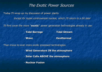 The Exotic Power Sources Today I'll wrap up my discussion of power plants Except for hyper-controversial nuclear, which I'll return to a bit later I'll first cover the more "exotic" power generation technologies already in use: - Tidal Barrage - Tidal Stream - Wave - Geothermal Then move to even more exotic proposed technologies: - Wind Generators IN the atmosphere - Solar Cells ABOVE the atmosphere - Nuclear Fusion Tidal Power Tidal power is really just a different form of hydro power And as discussed in the earlier lecture on hydro and wind powers Hydro is ultimately about gravitational potential energy: D Egravity = M g Dh Which for a continuous steady flow F (volume / second) gave us: Phydro = 9.8 (kW-seconds / m4) x F x Dh (kW = kilowatt) (Nitpicking: salt water can be a few percent more dense than pure water) However, big difference: For tides and waves, flows are NOT steady at all! An Introduction to Sustainable Energy Systems: www.virlab.virginia.edu/Energy_class/Energy_class.htm Alternative forms of tidal power generation The simplest / oldest might have been some variation of this: Floating boat / buoy tied via rope and pulleys to onshore counter weight With movement of onshore weight or pulley used to do some sort of work An Introduction to Sustainable Energy Systems: www.virlab.virginia.edu/Energy_class/Energy_class.htm But we can get a lot more power via a tidal dam Ocean: Dammed inlet or manmade basin: Power generated when tide coming in Power generated when tide going out (a.k.a. "Tidal Barrage") Big side benefit: Power generation mechanism is moved onshore Or at least into the dam, which is connected to the shore This also concentrates / simplifes that mechanism (e.g. into single turbine) Circumventing severe difficulty of keeping mechanisms working in saltwater (Just ask Stephen Spielberg!) How much power out? With density of water ρ, reservoir area A, surface gravity of g: Say tide raises sea level h, then lowers it h: net change in height = 2h So full tidal rise => Gravitational energy of M g 2h. With mass of raised water: M = density of water x its volume = ρ (2 h Area) (2h enters again!) Putting in values for water density and surface gravity: Egravitational = ρ g (2 h Area) 2h = (1000 kg/m3)(9.8 m/s2) 4 Area x h2 = (9800 kg m2/s2 x 1/m4) 4 Area x h2 = 39.2 kiloJoules /m4 x Area x h2 Tidal cycle is ~ 12 hours ~ 43,200 seconds, so cycle averaged power is: Powertides = 0.91 Watts / m4 x (Area x h2) An Introduction to Sustainable Energy Systems: www.virlab.virginia.edu/Energy_class/Energy_class.htm But it's actually 6 hours of rising tide + 6 hours falling: But we can extract power whichever direction tide is pushing water: Get power when rising tide PUSHES water into reservoir AND Get power when falling reservoir PUSHES water back out to sea So, it turns out that answer above is still about right But because salt water is a little denser than fresh water, let's round up to: Powertides ~ 1 Watt / m4 x (Area x h2) where h = half tide Of which we could recover a fraction: εgenerator (efficiency of our hydro generator) Note: Book gets 2X my number = Power out DURING falling tide (with 0 out during rising tide) But there is also the "pumping trick" As described in "Sustainable Energy without the Hot Air" by David J.C. MacKay: Make your dam a bit TALLER than the high tide level, and add some pumps At HIGH tide, pump extra water UP into reservoir (expending energy!) At LOW tide that SAME water will fall a LARGER DISTANCE => More energy back! Tide provided PART of the energy to get extra water up into reservoir But YOU then get ALL the energy back An Introduction to Sustainable Energy Systems: www.virlab.virginia.edu/Energy_class/Energy_class.htm With the numbers working out as follows: Say at (about) high tide, you pump water UP a further height b: With pump efficiency = εpump and generator efficiency= εgenerator That requires you to expend an energy: Eexpended = (1/εpump) M g height =(1/εpump) (ρ A b) g b = ρ g A b2/εpump But then, at low tide, that : Erecovered = εgenerator M g height = εgenerator (ρ A b) g (b + 2h) Giving ratio of added power out to added power invested Ratio out / in = (εgeneratorεpump) (b + 2h)/b call εgeneratorεpump = εtotal If efficiencies were 1, ratio would always be better than 1 => net gain If efficiencies less than 1, ratio => 1 when b = 2h (εtotal)/(1- εtotal) An Introduction to Sustainable Energy Systems: www.virlab.virginia.edu/Energy_class/Energy_class.htm Can also pump water OUT near low tide Putting this ALL together, "Sustainable Energy without the Hot Air" shows: Net gain for pumping is a "boost factor" of (εtotal)/(1- εtotal) For εtotal ~ 0.76 (corresponding to pump and generator efficiencies of ~ 87%) Book generates table (averaged over tidal cycle): Tidal Half Amplitude (h) Optimum Boost Height (b) Power with pumping Power without pumping 1 meter 6.5 meter 3.5 W/m2 0.8 W/m2 2 meter 13 meter 14 W/m2 3.3 W/m2 3 meter 20 meter 31 W/m2 7.4 W/m2 4 meter 26 meter 56 W/m2 13 W/m2 An Introduction to Sustainable Energy Systems: www.virlab.virginia.edu/Energy_class/Energy_class.htm Impressive, however (paralleling conventional hydropower): We must BUILD those coastal reservoirs By damming up bays or estuaries. Thereby modifying coasts with ecological value E.G. water purification and animal rearing value of coastal marshes And/or: visual / leisure time / vacation residence value And/or: harbor / industrial value "Worlds First" tidal power station (1966) in Rance River estuary, in Brittany France 62 MW average (240 MW peak) ~ 1/10th of an average U.S. power plant http://en.wikipedia.org/wiki/Rance_Tidal_Power_Station Thoughts regarding tidal barrages: It's worrying to note that while the above Rance tidal barrage claims to be oldest Rance power output (as cited by most sources) is STILL the largest Also, misleadingly, many sources cite its peak rather than average power! Suggesting, in 50 years since, that many have decided