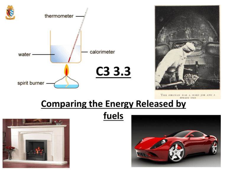 C3 3.3 Comparing the Energy Released by fuels How much energy comes from burning fuels? At the end of the lesson, you should be able to: 1. Describe how we can measure the energy produced by different fuels 2. Be able to state the unit of energy 3. Be able to calculate the energy given off when a fuel is combusted (in kJ/mole) from given data Method 1. Put 100 cm3 of water in the calorimeter. 2. Record the temperature of the water. 3. Clamp the calorimeter in position about 10 cm above the protective mat. 4. Find the mass of a spirit burner containing an alcohol. 5. Place the burner under the calorimeter and light the wick. 6. Stir the water with the thermometer. 7. Stop heating when the temperature has risen by 20 °C. 8. Replace the cap on the burner. 9. Reweigh the burner as soon as possible. 10.Keep noting the temperature – record the highest value reached. 11.If you can, repeat the experiment with other alcohols. 12.Try to keep all the factors the same Calculation 1. Find out the amount of energy transferred to the water: Energy (J) = m(water)xSHC(water)xtemp change Energy (J) = 100 x 4.2 x 20 = 8 400J Energy (kJ) = 8.4 kJ 2. Work out the mass of fuel burnt: Mass of burner (before) – mass of burner (after) For example: if the burner and ethanol fuel had a mass of 196.5g before and 195.4 g after. Mass of fuel burned = 196.5 – 195.4 = 1.1g Calculation 3. Number of moles of fuel burned: You need to know the mass of the fuel burned and the molar mass. For example: mass of ethanol = 1.1 g Mr of ethanol = Ethanol (CH3CH2OH): (12x2) + 16 + 6 = 46 g/mole Moles of ethanol (CH3CH2OH) = mass / molar mass 1.1 / 46 = 0.024 moles Calculation 4. Divide the energy transferred to the water by the number of moles of alcohol to find the enthalpy change of combustion (ΔH). For example: Energy transferred to water = 8.4 kJ Moles of ethanol burned = 0.024 moles Enthalpy change of combustion (ΔH) = 8.4 / 0.024 Enthalpy change of combustion (ΔH) = 350 kJ/mole Calculation 2 1. Find out the amount of energy transferred to the water: Energy (J) = m(water)xSHC(water)xtemp change Energy (J) = 100 x 4.2 x 20 = 8 400J Energy (kJ) = 8.4 kJ 2. Work out the mass of fuel burnt: Mass of burner (before) – mass of burner (after) For example: if the burner and methanol fuel had a mass of 196.5g before and 195.4 g after. Mass of fuel burned = 196.5 – 194.5 = 2.0g Calculation 2 3. Number of moles of fuel burned: You need to know the mass of the fuel burned and the molar mass. For example: mass of methanol = 2 g Mr of methanol = Methanol (CH3OH): (12+ 3+ 16 + 1 = 32 g/mole Moles of methanol = mass / molar mass 2 / 32 = 0.0625 moles Calculation 2 4. Divide the energy transferred to the water by the number of moles of alcohol to find the enthalpy change of combustion (ΔH). For example: Energy transferred to water = 8.4 kJ Moles of methanol burned = 0.0625 moles Enthalpy change of combustion (ΔH) = 8.4 / 0.0625 Enthalpy change of combustion (ΔH) = 134.4kJ/mole What is Really Happening? 1. Write a word equation for the reaction between the alcohol and oxygen (the first has been done for you) methanol + oxygen carbon dioxide + water CO2 (g) + 2 H2O(l) CH3OH (l) + 1½ O2 (g) 2. Where did the energy come from that was transferred to the water? All of the bonds in the reactant molecules are broken and all of the bonds in the product molecules are formed. The Energy in our Food… • We can find the energy in our food in a very similar way, if we can make it burn: Food Energy per 100g 1. What nutrient type is Bread 1,200 kJ present in the three most ‘high energy’ Chocolate biscuit 2,240 kJ foods? Butter 3,310 kJ 2. What sort of problems Apple 160 kJ do scientists face, when trying to Celery 32 kJ measure these values Sausages (fried) 1,450 kJ accurately? Example Susie burned some propanol (C3H7OH). She set up her equipment. She added 100g of water to a copper calorimeter (100ml). She weighed her mass of fuel and the burner before the experiment; it had a mass of 193.45g. She allowed the fuel to raise the temperature of the water by 30.C. She weighed her mass of fuel and the burner after the experiment; it had a mass of 192.55g. How can she calculate a ΔH for the fuel (in kJ/mole)? Step 1: Heat change = m x C x ΔT = 100 x 4.2 x 30 = 12600 J = 12.6 kJ Step 2: Mass of fuel burned = 193.45 – 192.55 = 0.90 g Example Jezebel burned some propanol (C3H7OH). She set up her equipment. She added 100g of water to a copper calorimeter (100ml). She weighed her mass of fuel and the burner before the experiment; it had a mass of 193.45g. She allowed the fuel to raise the temperature of the water by 30.C. She weighed her mass of fuel and the burner after the experiment; it had a mass of 192.55g. How can she calculate a ΔH for the fuel (in kJ/mole)? Step 3: Moles of fuel burned Mr (propanol) = 60 g/mole n = m/M = 0.90/60 = 0.015 moles Step 4: Heat change (kJ/mole) = 12.6/0.015 = 840 kJ/mole YOUR TURN… These are the techniques that you can use to work out the heat changes (in kJ/mole) for chemical reactions. It is a classic Higher Tier CHEM3 skill. Have a go at a few examples yourself now. Prove these answers are correct! Q1: 2565 kJ/mole Q2: 2800 kJ/mole Q3: 458.2 kJ/mole