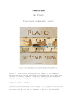 SYMPOSIUM By Plato Translated by Benjamin Jowett http://www.gutenberg.org/cache/epub/1600/pg1600.txt PERSONS OF THE DIALOGUE: Apollodorus, who repeats to his companion the dialogue which he had heard from Aristodemus, and had already once narrated to Glaucon. Phaedrus, Pausanias, Eryximachus, Aristophanes, Agathon, Socrates, Alcibiades, A Troop of Revellers. SCENE: The House of Agathon. Concerning the things about which you ask to be informed I believe that I am not ill-prepared with an answer. For the day before yesterday I was coming from my own home at Phalerum to the city, and one of my acquaintance, who had caught a sight of me from behind, calling out playfully in the distance, said: Apollodorus, O thou Phalerian (Probably a play of words on (Greek), 'bald-headed.') man, halt! So I did as I was bid; and then he said, I was looking for you, Apollodorus, only just now, that I might ask you about the speeches in praise of love, which were delivered by Socrates, Alcibiades, and others, at Agathon's supper. Phoenix, the son of Philip, told another person who told me of them; his narrative was very indistinct, but he said that you knew, and I wish that you would give me an account of them. Who, if not you, should be the reporter of the words of your friend? And first tell me, he said, were you present at this meeting? Your informant, Glaucon, I said, must have been very indistinct indeed, if you imagine that the occasion was recent; or that I could have been of the party. Why, yes, he replied, I thought so. Impossible: I said. Are you ignorant that for many years Agathon has not resided at Athens; and not three have elapsed since I became acquainted with Socrates, and have made it my daily business to know all that he says and does. There was a time when I was running about the world, fancying myself to be well employed, but I was really a most wretched being, no better than you are now. I thought that I ought to do anything rather than be a philosopher. Well, he said, jesting apart, tell me when the meeting occurred. In our boyhood, I replied, when Agathon won the prize with his first tragedy, on the day after that on which he and his chorus offered the sacrifice of victory. Then it must have been a long while ago, he said; and who told you--did Socrates? No indeed, I replied, but the same person who told Phoenix;--he was a little fellow, who never wore any shoes, Aristodemus, of the deme of Cydathenaeum. He had been at Agathon's feast; and I think that in those days there was no one who was a more devoted admirer of Socrates. Moreover, I have asked Socrates about the truth of some parts of his narrative, and he confirmed them. Then, said Glaucon, let us have the tale over again; is not the road to Athens just made for conversation? And so we walked, and talked of the discourses on love; and therefore, as I said at first, I am not ill-prepared to comply with your request, and will have another rehearsal of them if you like. For to speak or to hear others speak of philosophy always gives me the greatest pleasure, to say nothing of the profit. But when I hear another strain, especially that of you rich men and traders, such conversation displeases me; and I pity you who are my companions, because you think that you are doing something when in reality you are doing nothing. And I dare say that you pity me in return, whom you regard as an unhappy creature, and very probably you are right. But I certainly know of you what you only think of me--there is the difference. COMPANION: I see, Apollodorus, that you are just the same--always speaking evil of yourself, and of others; and I do believe that you pity all mankind, with the exception of Socrates, yourself first of all, true in this to your old name, which, however deserved, I know not how you acquired, of Apollodorus the madman; for you are always raging against yourself and everybody but Socrates. APOLLODORUS: Yes, friend, and the reason why I am said to be mad, and out of my wits, is just because I have these notions of myself and you; no other evidence is required. COMPANION: No more of that, Apollodorus; but let me renew my request that you would repeat the conversation. APOLLODORUS: Well, the tale of love was on this wise:--But perhaps I had better begin at the beginning, and endeavour to give you the exact words of Aristodemus: He said that he met Socrates fresh from the bath and sandalled; and as the sight of the sandals was unusual, he asked him whither he was going that he had been converted into such a beau:-To a banquet at Agathon's, he replied, whose invitation to his sacrifice of victory I refused yesterday, fearing a crowd, but promising that I would come to-day instead; and so I have put on my finery, because he is such a fine man. What say you to going with me unasked? I will do as you bid me, I replied. Follow then, he said, and let us demolish the proverb:-'To the feasts of inferior men the good unbidden go;' instead of which our proverb will run:-'To the feasts of the good the good unbidden go;' and this alteration may be supported by the authority of Homer himself, who not only demolishes but literally outrages the proverb. For, after picturing Agamemnon as the most valiant of men, he makes Menelaus, who is but a fainthearted warrior, come unbidden (Iliad) to the banquet of Agamemnon, who is feasting and offering sacrifices, not the better to the worse, but the worse to the better. I rather fear, Socrates, said Aristodemus, lest this may still be my case; and that, like Menelaus in Homer, I shall be the inferior person, who 'To the feasts of the wise unbidden goes.' But I shall say that I was bidden of you, and then you will have to make an excuse. 'Two going together,' he replied, in Homeric fashion, one or other of them may invent an excuse by the way (Iliad). This was the style of their conversation as they went along. Socrates dropped behind in a fit of abstraction, and desired Aristodemus, who was waiting, to go on