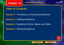 Chapter 18 Chemical Equilibrium Table of Contents Section 1 The Nature of Chemical Equilibrium Section 2 Shifting Equilibrium Section 3 Equilibria of Acids, Bases, and Salts Section 4 Shifting Equilibrium Chapter menu Resources Copyright © by Holt, Rinehart and Winston. All rights reserved. Chapter 18 Section 1 The Nature of Chemical Equilibrium Lesson Starter • List two everyday processes that can easily be reversed and two that cannot. • The freezing of water and the melting of ice can be reversed • The cooking of an egg or the lighting of a match cannot be reversed. • For the reversible processes, describe the conditions that favor the process going in a particular direction. • Low temperature favors freezing, and high temperature favors melting. Chapter menu Resources Copyright © by Holt, Rinehart and Winston. All rights reserved. Chapter 18 Section 1 The Nature of Chemical Equilibrium Objectives • Define chemical equilibrium. • Explain the nature of the equilibrium constant. • Write chemical equilibrium expressions and carry out calculations involving them. Chapter menu Resources Copyright © by Holt, Rinehart and Winston. All rights reserved. Chapter 18 Section 1 The Nature of Chemical Equilibrium Reversible Reactions • Theoretically, every reaction can proceed in two directions, forward and reverse. • Essentially all chemical reactions are considered to be reversible under suitable conditions. • A chemical reaction in which the products can react to re-form the reactants is called a reversible reaction. Chapter menu Resources Copyright © by Holt, Rinehart and Winston. All rights reserved. Chapter 18 Section 1 The Nature of Chemical Equilibrium Reversible Reactions, continued • A reversible chemical reaction is in chemical equilibrium when the rate of its forward reaction equals the rate of its reverse reaction and the concentrations of its products and reactants remain unchanged. • A a state of dynamic equilibrium has been reached when the amounts of products and reactants remain constant. • Both reactions continue, but there is no net change in the composition of the system. Chapter menu Resources Copyright © by Holt, Rinehart and Winston. All rights reserved. Chapter 18 Visual Concepts Equilibrium and Vapor Pressure Click below to watch the Visual Concept. Visual Concept Chapter menu Resources Copyright © by Holt, Rinehart and Winston. All rights reserved. Chapter 18 Section 1 The Nature of Chemical Equilibrium Reversible Reactions, continued • The chemical equation for the reaction at equilibrium is written using double arrows to indicate the overall reversibility of the reaction. 2Hg(l) + O (g) 2HgO(s) 2 Chapter menu Resources Copyright © by Holt, Rinehart and Winston. All rights reserved. Chapter 18 Visual Concepts Chemical Equilibrium Click below to watch the Visual Concept. Visual Concept Chapter menu Resources Copyright © by Holt, Rinehart and Winston. All rights reserved. Chapter 18 Section 1 The Nature of Chemical Equilibrium Equilibrium, a Dynamic State • Many chemical reactions are reversible under ordinary conditions of temperature and concentration. • They will reach a state of equilibrium unless at least one of the substances involved escapes or is removed from the reaction system. • When the products of the forward reaction are favored, there is a higher concentration of products than of reactants at equilibrium. • The equilibrium “lies to the right” Chapter menu Resources Copyright © by Holt, Rinehart and Winston. All rights reserved. Chapter 18 Section 1 The Nature of Chemical Equilibrium Equilibrium, a Dynamic State, continued • When the products of the reverse reaction are favored, there is a higher concentration of reactants than of products at equilibrium. • the equilibrium “lies to the left” • In other cases, both forward and reverse reactions occur to nearly the same extent before chemical equilibrium is established. • Neither reaction is favored, and considerable concentrations of both reactants and products are present at equilibrium. Chapter menu Resources Copyright © by Holt, Rinehart and Winston. All rights reserved. Chapter 18 Section 1 The Nature of Chemical Equilibrium Equilibrium, a Dynamic State, continued • products of the forward reaction favored, lies to the right 2SO (g) 2SO2 (g) + O2 (g) 3 • products of the reverse reaction favored, lies to the left Ğ H2CO3 (aq) + H2O(l) H O (aq) + HCO (aq) 3 3 • Neither reaction is favored Ğ H2SO3 (aq) + H2O(l) H O (aq) + HSO (aq) 3 3 Chapter menu Resources Copyright © by Holt, Rinehart and Winston. All rights reserved. Chapter 18 Section 1 The Nature of Chemical Equilibrium The Equilibrium Expression xC yD nA mB • Initially, the concentrations of C and D are zero and those of A and B are maximum. • Over time the rate of the forward reaction decreases as A and B are used up. • The rate of the reverse reaction increases as C and D are formed. • When these two reaction rates become equal, equilibrium is established. Chapter menu Resources Copyright © by Holt, Rinehart and Winston. All rights reserved. Chapter 18 Section 1 The Nature of Chemical Equilibrium Reaction Rate Over Time for an Equilibrium System Chapter menu Resources Copyright © by Holt, Rinehart and Winston. All rights reserved. Chapter 18 Section 1 The Nature of Chemical Equilibrium The Equilibrium Expression, continued xC yD nA mB • After equilibrium is reached, the individual concentrations of A, B, C, and D undergo no further change if conditions remain the same. • A ratio of their concentrations should also remain constant. • The equilibrium constant is designated by the letter K. [C]x [D]y K [A]n [B]m Chapter menu Resources Copyright © by Holt, Rinehart and Winston. All rights reserved. Chapter 18 Section 1 The Nature of Chemical Equilibrium The Equilibrium Expression, continued • The constant K is independent of the initial concentrations. • K is dep