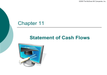 ©2009 The McGraw-Hill Companies, Inc. Chapter 11 Statement of Cash Flows ©2009 The McGraw-Hill Companies, Inc. Part A Formatting the Statement of Cash Flows 11-3 Statement of Cash Flows Provides a summary of cash inflows and cash outflows during the reporting period E-Games, Inc. Statement of Cash Flows For the Year Ended December 31, 2010 Cash Flows from Operating Activities Net income $42,000 Adjustments for noncash effects: Depreciation expense 9,000 Loss on sale of land 4,000 Increase in accounts receivable (7,000) Decrease in inventory 10,000 Increase in prepaid rent (2,000) Decrease in accounts payable (5,000) Increase in interest payable Decrease in income tax payable Net cash flows from operating activities 1,000 (2,000) $50,000 11-4 Statement of Cash Flows (continued) Cash Flows from Investing Activities Purchase of investment Sale of land (35,000) 6,000 Net cash flows from investing activities (29,000) Cash Flows from Financing Activities Issuance of common stock 5,000 Payment of cash dividends (12,000) Net cash flows from financing activities (7,000) Net increase (decrease) in cash 14,000 Cash at the beginning of the period 48,000 Cash at the end of the period $62,000 Note: Noncash Activities Purchased equipment by issuing a note payable $20,000 11-5 LO1 Classification of Cash Flows Categories of Cash Flows Operating activities Investing activities Financing activities Include cash receipts and cash payments for transactions relating to revenue and expense activities Include cash transactions involving the purchase and sale of long-term assets and current investments Inflows and outflows of cash resulting from the external financing of a business 11-6 Classification of Cash Flows Cash Flows from Operating Activities Cash Inflows: Sale of goods or services. Receipt of interest and dividends. Cash Outflows: Purchase of inventory. For operating expenses. For interest. For income taxes. Cash Flows from Investing Activities Cash Inflows: Sale of investments. Sale of PPE or intangibles. Collection of notes receivable. Cash Outflows: Purchase of investments. Purchase of PPE or intangibles. Acceptance of notes receivable. Cash Flows from Financing Activities Cash Inflows: Issuance of bonds or notes payable. Issuance of stock. Cash Outflows: Repayment of bonds or notes payable. Reacquisition of stock (treasury stock). Payment of dividends. 11-7 Sources of Information Sources Explanation 1. Income statement The income statement provides important information in the determination of cash flows from operating activities. 2. Balance sheets We look at the change in asset, liability, and stockholders’ equity accounts from the end of last period to the end of this period to find cash flows from operating, investing, and financing activities. 3. Additional information Sometimes we need additional information from the accounting records to determine specific cash inflows or cash outflows for the period. 11-8 Relationship between Financial Statements 11-9 Reporting Noncash Activities Transactions that don’t increase or decrease cash Excluded from the statement of cash flows Reported in a separate note to the financial statements as noncash activities Examples: Purchase of long-term assets by issuing debt Purchase of long-term assets by issuing stock Conversion of bonds payable into common stock. Exchange of long-term assets 11-10 Operating Activities – Indirect and Direct Methods Differ only in the presentation format for operating activities. We report investing, financing, and noncash activities identically under both methods. Indirect Method Begin with net income and then list adjustments to net income in order to arrive at operating cash flows. More popular method. Easier and less costly. Direct Method Adjust the items on the income statement to directly show the cash inflows and outflows from operations. Conceptually better method. More difficult and more costly. ©2009 The McGraw-Hill Companies, Inc. Part B Preparing the Statement of Cash Flows 11-12 Steps in Preparing the Statement of Cash Flows 1. Calculate net cash flows from operating activities using information from the income statement and changes in current assets (other than cash) and current liabilities from the comparative balance sheets. 2. Determine the net cash flows from investing activities by analyzing changes in long-term asset accounts from the comparative balance sheets. 3. Determine the net cash flows from financing activities by analyzing changes in long-term liabilities and stockholders’ equity accounts from the comparative balance sheets. 4. Combine the operating, investing, and financing activities and make sure the total agrees with the net increase (decrease) in cash. 11-13 Illustration The income statement, balance sheets, and additional information for E-Games, Inc., are provided in the following Illustration. We will use this information in preparing the statement of cash flows following the four basic steps. E-Games, Inc. Income Statement For the Year Ended December 31, 2010 Revenues $ 1,012,000 Expenses: Cost of goods sold Operating expenses (salaries, rent, utilities) $ 650,000 286,000 Depreciation expense 9,000 Loss on sale of land 4,000 Interest expense 5,000 Income tax expense 16,000 Total expenses Net Income 970,000 $ 42,000 11-14 Illustration (continued) E-Games, Inc. Balance Sheets December 31, 2009 and 2010 2010 2009 Increase (I) or Decrease (D) Assets Current Assets: Cash $ 62,000 $ 48,000 $14,000 (I) Accounts receivable 27,000 20,000 7,000 (I) Inventory 35,000 45,000 10,000 (D) 4,000 2,000 2,000 (I) Investment in stock 35,000 0 35,000 (I) Land 70,000 80,000 10,000 (D) Equipment 90,000 70,000 20,000 (I) (23,000) (14,000) 9,000 (I) $ 300,000 $ 251,000 Prepaid rent Long-Term Assets: Accumulated depreciation Total Assets 11-15 Illustration (continued) Liabilities and Stockholders’ Equity Current Liabilities: Accounts payable $ 22,000 $ 27,000 $ 5,000 (D) Interest payable 2,000 1,000 1,000 (