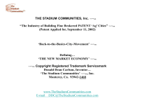 THE STADIUM COMMUNITIES, Inc. ’©®™sm “The Industry of Building Fine Brokered PATENT ‘Ag’ Cities” ’©®™sm (Patent Applied for, September 11, 2002) ‘Back-to-the-Basics-City-Movement’ ’©®™sm Defining… ‘THE NEW MARKET ECONOMY’ ’©®™sm ’©®™sm Copyright Registered Trademark Servicemark Donald Dean Carlson, Inventor… ‘The Stadium Communities’ ’©®™sm, Inc. Monterey, Ca. 93942-1468 www.TheStadiumCommunities.com E-mail DDC@TheStadiumCommunities.com DEDICATED to... My Family Research Librarians Investors Who Can and Do, Now. INTRODUCTION ’THE STADIUM COMMUNITIES’, Inc. ’©®™sm ‘The Industry of Building Brokered PATENT Ag Cities ’©®™sm ‘Back-to-the-Basics-City-Movement ’©®™sm “Building New ‘PATENT’ ‘Ag’ Cities Defining… ‘THE NEW MARKET ECONOMY ’©®™sm (Patent Applied for…) www.TheStadiumCommunities.com E-mail DDC@TheStadiumCommunities.com Corporate Provisions… ‘The Stadium Communities’, Inc. provides comprehensive master-planning, chartering and incorporation services to existing cities which may or may not be incorporated chartered in the formal/state sense and new city-sites as determined by ‘The Stadium Communities’, Inc. Research for each proposed or existing city = “A Univer’City’ in Miniature” ’©®™sm i.e. “The Univer’City’ of Carmel” ’©®™sm Our Research and provides this comprehensive service… “New PATENT ‘Ag’ Cities” ’©®™sm defining… The ‘NEW MARKET ECONOMY ‘ ” ’©®™sm (Letter of Patent Applied for… U.S. Department of Commerce September 11, 2002) COMMISSIONS.. • Governance • Residential • Education • Architecture • Business ’THE STADIUM COMMUNITIES’, Inc. ’©®™sm GOVERNANCE The Stadium Communities’ corporate design in research represents the best as foreseen by our nations founders who foresaw the great need in ‘environmental determinism’ (even though the statement may not have been known to them) – determining in 1776 an opportune time to secularize the governance; business and religious concerns of the society into a healthy civil climate. In California a national concept has emerged called ‘urban sprawl.’ In California a new national concept is emerging… ‘Cap-Cities ’©®™sm (‘In California…’ As California goes so goes the nation… or ‘In California, Life as it can be’) The need for corporately-designed ‘Cap Cities’ ’©®™sm is evident. No ‘Distintive-City-Deliniations’ ’©®™sm make for an unidentifiable future. = “New Fine PATENT’Ag’ Cities” ’©®™sm defining… The ‘NEW MARKET ECONOMY ‘ ” ’©®™sm (Letter of Patent Applied for, U.S. Department of Commerce, September 11, 2002) ‘FOR SUCH A TIME AS THIS’ Reflecting Western Civilization… ‘CITIES OF REFUGE’ ‘AEGIS CITIES’ ’©®™sm RESIDENTIAL A families’ economic status need not be reflected in the home whether it be a cottage or castle. Why not allow the millionaire the choice to select such? = … ‘The Neighborhood’ = fond memories. ‘Cities’ are cool but it is ‘The Neighborhood’ which influences us the most. It is always ‘…a lovely day in the neighborhood’, thanks to Mr. Rogers and when the neighborhood reflects the ‘The Eclectic Fullness of Economics and Ethnicity’©®™sm This is the best in architectural expressions so chosen. As addressed correctly we set aside the typical urban neighborhood planning re. ‘sameness’ – structures reflecting one economic status/code BORING!! Diversity is always the best. Differences attract. = Eclectic-Planning – ‘Always the Best from TheCottage to Castle ’©®™sm RESIDENTIAL (continued) www.Dictionary.com e·clec·tic adj. Selecting or employing individual elements from a variety of sources, systems, or styles: an eclectic taste in music; an eclectic approach to managing the economy. Made up of or combining elements from a variety of sources: “a popular bar patronized by an eclectic collection of artists, writers, secretaries and aging soldiers on reserve duty” (Curtis Wilkie). Every neighborhood is complete in itself re. the mores of the city-at-large so chosen. mo·res P Pronunciation Key (môrz, -z, mr-) pl.n. • • • The accepted traditional customs and usages of a particular social group. Moral attitudes. Manners; ways. ‘COMMISSIONS ON NEIGHBORHOODS’ EDUCATION “You think education is expensive try ignorance!” Derek Bok, Harvard Thus… ‘THE STADIUM COMMUNITIES’, ’©®™sm INC. educational systems not only expect and encourage the best for our.. ‘Intentionally-Educated’ ’©®™sm citizenry but this provision is made re. our … ‘ COMMISSIONS ON EDUCATION’ = All Public Distinctively Complete Educational Systems = … ‘Tailored Education ’©®™sm from publicly-sanctioned and encouraged Home Schooling to the University… ‘City-Class ’©®™sm Universities ‘’The Univer’City’ of Carmel” ’©®™sm “The Univer’City’ of Oakland” ’©®™sm “The Univer’City’ of Chualar” ’©®™sm “The University of Fort Ord” ’©®™sm EDUCATION (continued) The ‘Home-Schooled’ has access to all science labs, the arts, and athletics at the parents discretion and school administrations encouragement. President Lincoln exemplifies the home-schooled child. While not his chosen avenue to education but this gentleman succeeded in his public service beautifully and surely each generation has the ‘Lincolns’ ‘Washingtons’ ‘Franklins’ ‘Jefferson’ ‘Adams’ ‘Hamiltons’ ‘Gates’, etc.. This is the educators responsibility to identify and cultivate each citizenstudent according to their genetic and home-environs – to be all they can be, educationally identify on interest shown. It may be well worth the public’s investment to employ the family to school their child at home. Some student-citizens, in their path 