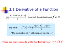 3.1 Derivative of a Function lim h 0 f a h f a h We write: f is called the derivative of f x lim h 0 at a. f a h f a h “The derivative of f with respect to x is …” There are many ways to write the derivative of y f x 3.1 Derivative of a Function f x “f prime x” y “y prime” or “the derivative of f with respect to x” dy dx “dee why dee ecks” or “the derivative of y with respect to x” df dx “dee eff dee ecks” or “the derivative of f with respect to x” d f dx x “dee dee ecks uv eff uv ecks” or “the derivative ( d dx of f of x ) of f of x” 3.1 Derivative of a Function dx does not mean d times x ! dy does not mean d times y ! 3.1 Derivative of a Function dy does not mean dy dx ! dx (except when it is convenient to think of it as division.) df does not mean df dx ! dx (except when it is convenient to think of it as division.) 3.1 Derivative of a Function d d f x does not mean times f x ! dx dx (except when it is convenient to treat it that way.) 3.1 Derivative of a Function 4 3 The derivative is the slope of the original function. 2 y f x 1 0 3 1 2 3 4 5 6 1 2 3 4 5 6 7 8 9 2 The derivative is defined at the end points of a function on a closed interval. 1 0 -1 -2 y f x 7 8 9 3.1 Derivative of a Function 6 y x 3 5 2 4 3 2 1 -3 -2 -1 0 -1 1 x 2 3 y lim -2 -3 h 0 6 5 4 3 2 1 -3 -2 -1 0 -1 -2 -3 -4 -5 -6 x h y lim 2 x h h 0 1 x 2 3 y 2 x 2 3 x2 3 h 3.1 Derivative of a Function A function is differentiable if it has a derivative everywhere in its domain. It must be continuous and smooth. Functions on closed intervals must have one-sided derivatives defined at the end points. 3.2 Differentiability To be differentiable, a function must be continuous and smooth. Derivatives will fail to exist at: f x x f x x corner f x 3 cusp f x vertical tangent 2 3 1, x 0 1, x 0 x discontinuity 3.2 Differentiability Most of the functions we study in calculus will be differentiable. 3.2 Differentiability There are two theorems on page 110: If f has a derivative at x = a, then f is continuous at x = a. Since a function must be continuous to have a derivative, if it has a derivative then it is continuous. 3.2 Differentiability Intermediate Value Theorem for Derivatives If a and b are any two points in an interval on which f is differentiable, then f takes on every value between f a and f b . 1 f a 2 f b 3 Between a and b, f must take 1 on every value between 2 and 3. 3.3 Rules for Differentiation If the derivative of a function is its slope, then for a constant function, the derivative must be zero. d c 0 dx example: y3 y 0 The derivative of a constant is zero. 3.3 Rules for Differentiation We saw that if y x 2 , y 2 x . This is part of a pattern. d n n 1 x nx dx examples: f x x f x 4x power rule y x8 4 3 y 8 x 7 3.3 Rules for Differentiation d n n 1 x nx dx Proof: d n ( x h) n x n x lim h0 dx h d n x n nx n1h ... hn x n x lim h0 dx h d n nx n1h ... hn x lim h0 dx h d n x lim nx n1 h 0 dx 3.3 Rules for Differentiation constant multiple rule: d du cu c dx dx examples: d n cx cnx n 1 dx d 7 x 5 7 5 x 4 35 x 4 dx 3.3 Rules for Differentiation constant multiple rule: d du cu c dx dx sum and difference rules: d du dv u v dx dx dx d du dv u v dx dx dx 4 2 y x 2 x 2 y x 12 x (Each term is treated separately) dy 3 3 4x 4x y 4 x 12 dx 4 3.3 Rules for Differentiation Find the horizontal tangents of: y x 2x 2 4 2 dy 4 x3 4 x dx Horizontal tangents occur when slope = zero. 4 x3 4 x 0 Substituting the x values into the x3 x 0 x x 1 0 2 x x 1 x 1 0 x 0, 1, 1 original equation, we get: y 2, y 1, y 1 (The function is even, so we only get two horizontal tangents.) 3.3 Rules for Differentiation 4 y x4 2x2 2 3 -2 -1 2 y2 1 y 1 0 -1 -2 1 2 3.3 Rules for Differentiation 4 y x4 2x2 2 3 2 dy 4 x3 4 x dx 1 -2 -1 0 -1 First derivative (slope) is zero at: x 0, 1, 1 -2 1 2 3.3 Rules for Differentiation product rule: d dv du uv u v dx dx dx Notice that this is not just the product of two derivatives. This is sometimes memorized as: d uv u dv v du d 2 x 3 dx 2 x 3 x 2 3 6 x 2 5 2 x 3 5 x 2x 5x d 2 x 5 5 x 3 6 x 3 15 x dx d 2 x 5 11x 3 15 x dx 10 x 4 33 x 2 15 6 x 4 5 x 2 18 x 2 15 4 x 4 10 x 2 10 x 4 33 x 2 15 3.3 Rules for Differentiation product rule: d dv du uv u v dx dx dx d u ( x h )v ( x h ) u ( x )v ( x ) (uv) lim h0 dx h add and subtract u(x+h)v(x) in the denominator d u ( x h )v ( x h ) u ( x )v ( x ) u ( x h )v ( x ) u ( x h )v ( x ) (uv) lim h0 dx h Proof d u ( x h)v( x h) v( x) v( x)u ( x h) u ( x) (uv) lim h 0 dx h d dv du (uv) u v dx dx dx 3.3 Rules for Differentiation quotient rule: du dv v u d u dx dx dx v v2 d 2 x 5x 2 dx x 3 3 u v du u dv d 2 v v or 2 2 3 x 3 6 x 5 2 x 5x 2 x x 2 3 2 3.3 Rules for Differentiation Higher Order Derivatives: dy y dx is the first derivative of y with respect to x. dy d dy d 2 y is the second derivative. y dx dx dx dx 2 (y double prime) dy y is the third derivative. dx We will learn later what these d 4 y y is the fourth derivative. higher order dx derivatives are used for. 3.3 Rules for Differentiation Suppose u and v are functions that are differentiable at x = 3, and that u(3) = 5, u’(3) = -7, v(3) = 1, and v’(3)= 4. Find the following at x = 3 : d 1. (uv) dx d (uv) uv' vu' dx d u 2. dx v d u vu'uv ' dx v v2 (1)( 7) (5)( 4) 27 2 1 d v 3. dx u d v uv 'vu' dx u u2 (5)( 4) (1)( 7) 52 5(3) (1)( 7) 8 27 25 3.3 Rules for Differentiation d ho dx hi (hi)d (ho) (ho)d (hi ) (ho)( ho) 3.3 Rules for Differentiation 3.4 Velocity and other Rates of Change Consider a graph of displacement (distance traveled) vs. time. distance (miles) B A Average velocity can be found by taking: change in position s s change in time t t time (hours) Vave f t t f t s t t The speedometer in your car does not measure average velocity, but instantaneous velocity. V t f t t f t ds lim t 0 dt t (The velocity at one moment in time.) 3.4 Velocity and other Rates of Change Velocity is the first derivative of position. Acceleration is the second derivative of position. 3.4 Velocity and other Ra