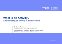 Georgia Tech What is an Activity? Appropriating an Activity-Centric System Svetlana Yarosh Georgia Institute of Technology, Georgia, USA Tara Matthews, Thomas Moran, Barton Smith IBM Almaden Research Center, California, USA © 2009 IBM Corporation Activity-Centric Computing (ACC) Seeks to address fragmentation of work across tools & documents by allowing users to organize work around the computation construct of an Activity. Activity-Centric Computing (ACC) Seeks to address fragmentation of work across tools & documents by allowing users to organize work around the computation construct of an Activity. IBM, ActivityExplorer Georgia Tech, Giornata Microsoft, Scalable Fabric Umeå University, UMEA Georgia Tech IBM Almaden Research Center How do I represent work activities in a system? People have a hard time articulating what an activity is in the early stages of work Leads to adoption issues for ACC systems We study how successful users define & represent their work activities in an ACC system to understand how to make this less of a burden for new users 4 Tara Matthews, USER Group 2009.8.26 © 2009 IBM Corporation Georgia Tech IBM Almaden Research Center Study of ACC System Appropriation Study usage of active users who had successfully appropriated an ACC system (i.e., adopted & adapted it to fit & evolve existing work practices) ACC System = Lotus Activities 2+ year deployment 32,000 users from which to sample (we selected 15 very active users) 39,000 Activities created Users used system of their own accord Research questions What use patterns do active users develop in appropriating Lotus Activities? How do they divide and structure their work into effective Activities? How do these findings inform the design of ACC systems? 5 Tara Matthews, USER Group 2009.8.26 © 2009 IBM Corporation Lotus Activities Tags Objective Tools People Artifacts Georgia Tech IBM Almaden Research Center Participants & Method Participants: Selected 15 highly active users Users 7,286 7,873 20,073 2,234 296 # Activities 1 2-5 6 - 10 11 - 50 51+ Studied active users to understand successful appropriation Method Analyzed content of selected public activities & templates (120 activities) 1. Open coding 2. Axial coding following interviews – use patterns evidenced in both content analysis & interviews converged into nine patterns 7 Semi-structured interviews & system tours (15 active users) Tara Matthews, USER Group 2009.8.26 © 2009 IBM Corporation Activities Patterns of Use Complete Activity Create a Document 13 users Organize an Event 10 users Manage Work Units Partial Activity Unifying Reuse Collect Resources 13 users 12 users Solve a Problem Manage Personal Tasks Maintain a Team Space 11 users 11 users Create a Tutorial 10 users 9 users Exchange Formalized Information 4 users Activities Patterns of Use Complete Activity Create a Document 13 users Organize an Event 10 users Manage Work Units Partial Activity Unifying Reuse Collect Resources 13 users 12 users Solve a Problem Manage Personal Tasks Maintain a Team Space 11 users 11 users Create a Tutorial 10 users 9 users Exchange Formalized Information 4 users Activities Patterns of Use Complete Activity Create a Document 13 users Organize an Event 10 users Manage Work Units Partial Activity Unifying Reuse Collect Resources 13 users 12 users Solve a Problem Manage Personal Tasks Maintain a Team Space 11 users 11 users Create a Tutorial 10 users 9 users Exchange Formalized Information 4 users Activities Patterns of Use Complete Activity Create a Document 13 users Organize an Event 10 users Manage Work Units Partial Activity Unifying Reuse Collect Resources 13 users 12 users Solve a Problem Manage Personal Tasks Maintain a Team Space 11 users 11 users Create a Tutorial 10 users 9 users Exchange Formalized Information 4 users Activities Patterns of Use Complete Activity Create a Document 13 users Organize an Event 10 users Manage Work Units Partial Activity Unifying Reuse Collect Resources 13 users 12 users Solve a Problem Manage Personal Tasks Maintain a Team Space 11 users 11 users Create a Tutorial 10 users 9 users Exchange Formalized Information 4 users Activities Patterns of Use Complete Activity Create a Document 13 users Organize an Event 10 users Manage Work Units Partial Activity Unifying Reuse Collect Resources 13 users 12 users Solve a Problem Manage Personal Tasks Maintain a Team Space 11 users 11 users Create a Tutorial 10 users 9 users Exchange Formalized Information 4 users manage a set of job-specific work units “Each Activity corresponds to an account, so I call the Activity by the account name and then within there, I have different sections by brand and I put the opportunities within those sections and I notify the appropriate team members.” Goal: manage your primary work Method Create multiple identicallystructured “work unit” Activities (e.g., a customer account) Created from a template, which facilitated work reuse Some units observed: Often managed as a set (e.g., view status across all units; filter set to specific sub-sets of units) Customer & Product (Sr. IT Specialist) Tracked status with a code prefix in the Activity title Heavy use of tagging to provide alternate views Customer (Client Relationship Rep.) Version (Technical Sales Specialist) Work Request (Bus. Support IT Analyst) Proof-of-Concept (Sftwr. Sales Leader) Customer Report (L3 Service Specialist) manage a job-specific work unit: customer report (also: personal, solve problem) unit definition info to fill in user’s notes required APAR form additional to-dos user does for APARs filled-in version of the customer report APAR number many tags for finding user’s notes completed & re-uploaded APAR form checkedoff to-dos APAR info Georgia Tech IBM Almaden Research Center Manage a set of job-specific work units Supplementing existing tools for work outside a workflow “I still definitely use Siebel, because we have to. But, like most CRM systems, they are for reporting onl