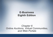 E-Business Eighth Edition Chapter 6 Online Auctions, Virtual Communities, and Web Portals Learning Objectives In this chapter, you will learn about: • Origins and key characteristics of the seven major auction types • Strategies for Web auction sites and auction-related businesses • Virtual communities and Web portals E-Business, Eighth Edition 2 Auction Overview • Business use of the Web – Improve existing processes – New items • Running auctions • Creating virtual communities • Operating Web portals • Online auctions provide business opportunity – Charge buyers and sellers – Sell targeted advertising • Strength of Internet – Brings people together: common narrow interest E-Business, Eighth Edition 3 Origins of Auctions • From Babylon to the Roman Empire to Buddhists • Common activity of 17th century England – Sotheby’s (1744), Christie’s (1766), colonial auctions • Auction: seller offering item for sale – – – – – Bids: price potential buyer willing to pay Bidders: potential buyers Private valuations: amounts seller willing to pay Auctioneer: manages auction process Shill bidders: bidder who seller or auctioneer employees • May artificially inflate price E-Business, Eighth Edition 4 English Auctions • Bidders publicly announce successively higher bids – Stop at highest bid • Item sold to highest bidder (at bidder’s price) • Also known as: – Ascending-price auction – Open auction (open-outcry auction) • Bids publicly announced • Minimum bid – Beginning price – If not met: item removed (not sold) E-Business, Eighth Edition 5 English Auctions (cont’d.) • Reserve price (reserve) – Seller’s minimum acceptable price – Not announced – If not exceeded: item withdrawn (not sold) • Yankee auction – Multiple item units offered for sale • Bidders specify quantity – Highest bidder allotted bid quantity – Remaining items allocated to next highest bidders • Until all items distributed – Bidders pay lowest successful bidder price E-Business, Eighth Edition 6 English Auctions (cont’d.) • English auction seller drawback – May not obtain maximum possible price • English auction buyer drawback – Winner’s Curse • Psychological phenomenon • Caught up in competitive bidding excitement • Bidders risk bidding more than their private valuations E-Business, Eighth Edition 7 Dutch Auctions • Open auction – Bidding starts at a high price • Drops until bidder accepts price • Also called descending-price auctions • Seller offers number of similar items for sale • Common implementation – Use a clock (price drops with each tick) • If items remain: clock restarted E-Business, Eighth Edition 8 Dutch Auctions (cont’d) • Advantages – Seller obtains close to highest private valuation – Quickly move large numbers of commodity items • Disadvantages – Sales or product interest generated: does not justify cost of operation – Customer confusion • Successful examples – Google initial public offering stock sale (2004) – LookSmart stock repurchase (2008) E-Business, Eighth Edition 9 First-Price Sealed-Bid Auctions • Sealed-bid auctions – Bidders submit bids independently • Prohibited from sharing information • First-price sealed-bid auction – Highest bidder wins – If multiple items auctioned: next highest bidders awarded remaining items • At their bid price E-Business, Eighth Edition 10 Second-Price Sealed-Bid Auctions • Second-price sealed-bid auction – Same as first-price sealed-bid auction • Exception – Highest bidder awarded item at second-highest bidder price • Vickrey auctions – William Vickrey: 1996 Nobel Prize in Economics • Yields higher seller returns • Encourages all bidders to bid private valuation amounts • Reduces tendency for bidder collusion E-Business, Eighth Edition 11 Open-Outcry Double Auctions • Open-outcry double auctions – Sealed bid or open outcry – Good for: items of known quality traded in large quantities – No item inspection before bidding • Example – Chicago Board of Trade: commodity futures and stock options – Buy and sell offers shouted by traders in trading pit • Each commodity, stock option traded in own pit • Quite frenzied E-Business, Eighth Edition 12 Sealed-Bid Double Auctions • Double auction – Buyers, sellers submit combined price-quantity bids • Auctioneer – Matches sellers’ offers • Starting with lowest price and then goes up – To buyers’ offers • Starting with highest price and then goes down until all quantities offered are sold • Operation format – Sealed bid or open-outcry • Example: New York Stock Exchange E-Business, Eighth Edition 13 Reverse (Seller Bid) Auctions • Reverse auction (seller-bid auction) – Multiple sellers submit price bids • Auctioneer represents single buyer – Bids for given amount of specific item to purchase – Prices go down as bidding continues • Until no seller is willing to bid lower • Used by consumers • Largest dollar volume – Businesses: both buyers and sellers • Buyer acts as auctioneer • Screens sellers before participation E-Business, Eighth Edition 14 E-Business, Eighth Edition 15 Online Auctions and Related Businesses • Online auction business is rapidly changing • Three auction Web site categories – General consumer auctions – Specialty consumer auctions – Business-to-business auctions • Consumer auctions – Considered business-to-consumer e-commerce – E-commerce • Considered Consumer-to-business • Bidders might be businesses E-Business, Eighth Edition 16 General Consumer Auctions • eBay – Registration required, seller fees, rating system – Seller’s risk • Stolen credit cards; buyer fails to conclude transaction – Buyer’s risk • No item delivery; misrepresented item – Most common auction format: English auction • • • • Seller may set reserve price Bidders listed: bi