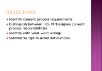 Identify consent process requirements Distinguish between IRB, PI/Designee consent process responsibilities Identify with what went wrong? Summarize tips to avoid deficiencies "A word is not a crystal, transparent and unchanged; it is the skin of a living thought and may vary greatly in color and content according to the circumstances and the time in which it is used" — Oliver Wendell Holmes Jr. DHHS – 45 CFR Part 46.116 Common Rule FDA 21 CFR 50.25 Part 50 (Informed Consent) Part 56 (IRB) ICH GCP E-6 Section 4.8.10 “No investigator may involve a human being as a subject in research… unless the investigator has obtained the legally effective informed consent of the subject or the subject’s legally authorized representative An investigator shall seek such consent only under circumstances that provide the prospective subject or the representative sufficient opportunity to consider whether or not to participate and that minimize the possibility of coercion or undue influence. The information that is given to the subject or the representative shall be in language understandable to the subject or the representative” 45 CFR 46.11 A document that provides a summary of the research and explains the subjects rights as a participant It is designed to outline and be a reference regarding what is expected of the participant information exchange including subject recruitment materials, verbal instructions, written materials, questions and answer sessions and signature documenting consent with date. Protecting study volunteers in research Cynthia McGuire Dunn, MD & Gary Chadwick, PHARM.D, mph 1999. Disclosure of relevant information to prospective subjects about the research; their comprehension of the information, and their voluntary agreement, free of coercion and undue influence, to research participation. http://ohsr.od.nih.gov/info/sheet6.html Detailed description of the method for obtaining informed consent Who Where The process submitted for IRB approval Changes in the process are submitted as amendments PI assures the informed consent process in research is an ongoing exchange of information throughout the course of the research and it is documented Oral Telephonic E consent Video Facsimile The person must be trained regarding informed consent process and be knowledgeable about study FDA Requirements: IRB must know who will conduct consent process FDA does not require the that the PI personally conduct the consent process. ECOG Requirements: “Legally, it is the physician’s responsibility to discuss the study with the patient and obtain the written consent.” “After an initial discussion it may be the physician, nurse, or CRA who provides further details to the patient.” 7.2.6 “Presenting the Consent Form to the Patient,” ECOG Protocol Management 41% Study nurse 21% PI 19% No one 12% Family member 8% Other Source: 2002 Center Watch Survey of 1,561 Study Volunteers Fetuses, Pregnant Women, and Human In Vitro Fertilization Prisoners Children Elderly Cognitively Impaired Minorities Etc. Cognition/capacity Level of education Social/cultural values Language Age Environment Anxiety/fear Pain Influence of medications Quality of disclosed information Readability of informed consent “the belief that the purpose of a clinical trial is to benefit the individual patient rather than to gather data for the purpose of contributing to scientific knowledge” The subject believes that his medical needs will determine his assignment to a treatment group or the PI will modify the protocol to serve his own medical need. The subject has unreasonable expectations about the likelihood of benefit from study participation. In this example the subject believes the PI will not administer treatment that might harm them, but rather, will provide interventions that only help them. When the study is closed and final reports are issued At each interaction, the investigator must reassure Voluntary participation continues New information is given to the subject FDA Mandates ICH/GCP 4.8 suggests FDA has no regulations concerning delegation of consenting although it is discussed in the FDA Information Sheets FDA only requires that a copy of consent be provided to subject consent is obtained the same day that the subject's involvement in the study begins, the subject's medical records/case report form should document that consent was obtained prior to participation ICH allows the delegation of the informed consent process to a designee ICH recommends the person conducting the informed consent process sign and date the consent form ICH recommends that the subject receive a signed and dated copy of the consent form If research“FDA Consent information sheet” FDA and ICH BOTH require the IRB to review: The informed consent, process, protocol, advertisements, and the Investigator's Brochure ICH/GCP 3.1 also recommends IRB review of: Subject recruitment procedures Written information provided to subjects Information about subject compensation Investigator's current CV and/or other documents evidencing qualifications DHHS OHRP FDA Other Federal Agencies (NIH, CDC and CMS State Law Institution IRB Policy Policy IRB Policy Department Policy Research Team SOP’s Study Protocol/ Contract Depending on funding and/or Dept policy ICH/GCP Emergency, life threatening situation that requires intervention Minimal risk study with IRB approval Ultimate protector of the subject’s rights and safety Be personally certain that each subject is adequately informed and freely consents to participate in the investigator’s research Assure that every reasonable precaution is taken to reduce risk to a minimum for the subject The investigator is responsible for whom he delegates authority Follow the protocol and IRB approved study documents Obtain consent before initiating ANY studyspecific procedures Provide a quiet, comfortable, and private setting Explain the consent procedures and process to the subject Ensure sufficient t