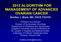 2012 ALGORITHM FOR MANAGEMENT OF ADVANCED OVARIAN CANCER Bradley J. Monk, MD, FACS, FACOG Professor and Director Division of Gynecologic Oncology Department of Obstetrics and Gynecology Creighton University School of Medicine at St. Joseph’s Hospital and Medical Center, a Member of Catholic Healthcare West Phoenix, Arizona USA bradley.monk@chw.edu Newly Diagnosed Advanced Ovarian Cancer Ovarian Carcinoma: Incidence and Mortality • Incidence in US women – 21,880 cases in 2010 – Eighth most common cancer – Second most common gynecologic cancer – 1.5% lifetime risk of getting ovarian cancer • Mortality in US women – 14,850 deaths in 2010 – Fifth most common cause of cancer death – Most common cause of death due to gynecologic cancer – 1.0% lifetime risk of dying of ovarian cancer ACS. Available at: http://www.cancer.org/ Cancer in the United Sates of America ACS. Available at: http://www.cancer.org/ First-line Therapy Global Standard Treatment Surgery with maximum cytoreduction effort IV Platinum + Taxane Chemotherapy (Carboplatin + Paclitaxel) x 6 2004 Consensus Statements on the Management of Ovarian Cancer: Final Document of the 3rd International GCIG Ovarian Cancer Consensus Conference (GCIG OCCC 2004). Annals Of Oncology 16 (Supplement 8) Viii7–viii12, 2005 Basis for Current Standard: Systemic Therapy • Studies showing paclitaxel/cisplatin superior to cyclophosphamide/cisplatin – GOG Protocol 111[1] – EORTC-NCIC OV 10[2] • Studies showing paclitaxel/carboplatin at least equivalent to paclitaxel/cisplatin in efficacy – AGO Trial[3] – GOG Protocol 158[4] 1. McGuire WP, et al. N Eng J Med .1996;334:1-6. 2. Piccart MJ, et al. J Natl Cancer Inst. 2000;92:699-708. 3. DuBois A, et al. J Natl Cancer Inst. 2003;95:1320-1329. 4. Ozols RF, et al. J Clin Oncol. 2003;21:3194-3200. First-line Therapy: Acceptable but Uncommon 1. 2. 3. 4. 5. 6. Docetaxel instead of paclitaxel Neoadjuvant chemotherapy Intraperitoneal Chemotherapy Weekly dosing Adding a targeted agent (e.g. bevacizumab) Maintenance or consolidation chemotherapy after complete remission First-line Therapy: Acceptable but Uncommon 1. 2. 3. 4. 5. 6. Docetaxel instead of paclitaxel Neoadjuvant chemotherapy Intraperitoneal Chemotherapy Weekly dosing Adding a targeted agent (e.g. bevacizumab) Maintenance or consolidation chemotherapy after complete remission IGCS Meeting October 25th 2009 Bangkok N Engl J Med. 2010 Sep 2;363(10):943-53 RANDOMISED TRIAL COMPARING PRIMARY DEBULKING SURGERY (PDS) WITH NEOADJUVANT CHEMOTHERAPY (NACT) FOLLOWED BY INTERVAL DEBULKING (IDS) IN STAGE IIIC-IV OVARIAN, FALLOPIAN TUBE AND PERITONEAL CANCER. RANDOMISED EORTC-GCG/NCIC-CTG TRIAL ON NACT + IDS VERSUS PDS Ovarian, tubal or peritonal cancer FIGO stage IIIc-IV (n = 718) Randomization Primary Debulking Surgery 3 x Platinum based CT Interval debulking (not obligatory) > 3 x Platinum based CT Neoadjuvant chemotherapy 3 x Platinum based CT Interval debulking if no PD > 3 x Platinum based CT Primary Endpoint: Overall survival Secondary endpoints: Progression Free Survival, Quality of Life, Complications NACT + IDS versus PDS: ITT Overall survival 100 90 80 Median survial 70 PDS: 29 months 60 IDS: 30 months 50 40 HR for IDS:0.98 (0.85, 1.14) 30 20 10 0 (years) 0 O N 259 361 251 357 2 4 Number of patients at risk : 183 68 191 56 6 16 11 8 2 1 10 Treatment Upfront debulking surger Neoadjuvant chemothera First-line Therapy: Acceptable but Uncommon 1. 2. 3. 4. 5. 6. Docetaxel instead of paclitaxel Neoadjuvant chemotherapy Intraperitoneal Chemotherapy Weekly dosing Adding a targeted agent (e.g. bevacizumab) Maintenance or consolidation chemotherapy after complete remission Role of IP Chemotherapy for Optimally Debulked Advanced-Stage Ovarian Cancer GOG 1041 Improved outcome in CP-treated patients when cisplatin administered IP (relative risk, 0.76) GOG 1142 Improved outcome in TP-treated patients when cisplatin administered IP (relative risk, 0.78) GOG 1723 Improved outcome in TP-treated patients when paclitaxel and cisplatin administered IP (relative risk, 0.73) CP =Cyclophosphamide and cisplatin; IP = Intraperitoneal; TP = Paclitaxel and cisplatin. 1. Alberts DS, et al. N Engl J Med. 1996;335:1950-1955. 2. Markman M, et al. J Clin Oncol. 2001;19:1001-1007. 3. Armstrong DK et al. N Engl J Med. 2006;354:34-43. Reprinted with permission from Memorial Sloan-Kettering Cancer Web site. Available at: www.mskcc.org/patient_education/html/ 41495.cfm. Accessed March 9, 2006. GOG172: Ovarian (optimal III) • • • • Epithelial Ovarian Cancer Optimal Stage III No prior therapy Elective Second-Look 2 Cisplatin 75 mg/m I Paclitaxel 135 mg/m2 (24 h) II Open: Closed: Accrual: Cisplatin 100 mg/m2 IP d1 Paclitaxel 135 mg/m2 (24 h) IV d1 Paclitaxel 60 mg/m2 IP d8 23-Mar-98 29-Jan-01 416 pts (evaluable) Armstrong, et al. NEJM 354:34-43, 2006 GOG Protocol 172 Relative risk of death = 0.75 (95% CI: 0.58, 0.97) P = .03 By Treatment Group 1.0 0.9 IP median overall survival = 65.6 months Proportion Surviving 0.8 0.7 0.6 0.5 IV median overall survival = 49.7 months 0.4 0.3 0.2 Rx Group Rx Group IV IV IP IP 0.1 0.0 0 12 Lost to Follow-up 5 11 Alive 93 117 24 Alive Dead Total 210 78 117 93 88 205 Dead Total 127 101 210 205 36 Months on Study IV = Intravenous; IP = Intraperitoneal. Adapted with permission from Armstrong DK, et al. N Engl J Med. 2006;354:34-43. 48 60 GOG Protocol 172 Toxicity IV, % (N = 210) IP, % (N = 201) G3/4 Leukopenia* 64 76 G3/4 Platelet 4 12 G3/4 GI* 24 46 G3/4 Renal* 2 7 G3/4 Neurologic Event* 9 19 G3/4 Fatigue* 4 18 G3/4 Infection* 6 16 G3/4 Metabolic* 7 27 G3/4 Pain* 1 11 *P ≤ 0.05 No difference in QOL at 12 months IV = Intravenous; IP = Intraperitoneal; GI = Gastrointestinal; QOL = Quality of life. Armstrong DK, et al. N Engl J Med. 2006;354:34-43. GOG 252: Stage II/III Disease: Small Volume Residual • • • Epithelial Ovarian Cancer Optimal Stage III No prior therapy Carboplatin AUC=6 (IV) I Paclitaxel 80 mg/m2 (d1, 8, 15 3h