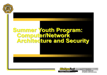 Summer Youth Program: Computer/Network Architecture and Security Introduction to Networking Objectives: Understand the physical connection that has to take place for a computer to connect to the Internet. Recognize the components that comprise the computer. Install and troubleshoot network interface cards and/or modems. Use basic testing procedures to test the Internet connection. Demonstrate a basic understanding of the use of web browsers and plug-ins. Internet Connection Requirements Internet is the largest data network on earth Consists of many large and small networks that are interconnected Individual computers are the sources and destinations of information through the Internet Connection to the Internet can be broken down into three parts: Physical connection Logical connection Applications Computer Basics Electronic Components Transistor, Integrated circuit (IC), Resistor, Capacitor, Connector, and Light emitting diode (LED) PC Subsystems Printed circuit board, CD-ROM drive, Central processing unit (CPU), Floppy drive, Hard drive, Microprocessor, Motherboard, Bus, Random-access memory (RAM), Read-only memory (ROM), System unit, Expansion slot, Power supply, Backplane components Network interface card (NIC), Video card, Audio card, Parallel port, Serial port, Mouse port, Power cord Network Interface Card A NIC, or LAN adapter, provides network communication capabilities to and from a PC These considerations are important in the selection of a NIC: Protocols – Ethernet, Token Ring, or FDDI Types of media – Twisted-pair, coaxial, wireless, or fiber-optic Type of system bus – PCI or ISA NIC’s & Modems A modem, or modulator-demodulator, has two main functions: provides the computer with connectivity to a telephone line converts data from a digital signal to an analog signal that is compatible with a standard phone line A NIC provides a network interface for each host Situations that require NIC installation include the following: Installation of a NIC on a PC that does not already have one Replacement of a malfunctioning or damaged NIC Upgrade from a 10-Mbps NIC to a 10/100/1000-Mbps NIC Change to a different type of NIC, such as wireless Installation of a secondary, or backup, NIC for network security reasons Internet Connections for Consumers Requires use of a Modem Dial-up – slow Always on High Speed Connections DSL – Verizon Cable – Comcast, Charter, Road-Runner TCP/IP TCP/IP The operating system tools must be used to configure TCP/IP on a workstation Testing Connectivity with Ping Ping is a basic program that verifies a particular IP address exists and can accept requests. Ping stands for Packet Internet or Inter-Network Groper. How can ping be used? ping 127.0.0.1 - loopback test. It verifies the operation of the TCP/IP stack and NIC transmit/receive function. ping host computer IP address - verifies the TCP/IP address configuration for the local host and connectivity to the host. ping default-gateway IP address - verifies whether the router that connects the local network to other networks can be reached. ping remote destination IP address - verifies connectivity to a remote host. Information & Testing NIC MAC Address Verification http://standards.ieee.org/regauth/oui/index. shtml Traceroute Site: http://www.traceroute.org Web Browsers and Plug-ins A Web browser is software that interprets HTML, which is one of the languages used to code Web page content. Two of the most popular Web browsers are Internet Explorer (IE), Netscape Communicator, and FireFox Plug-ins are applications that work with the browser to launch the programs required to view special files: Flash – Plays multimedia files created by Macromedia Flash Quicktime – Plays video files created by Apple Real Player – Plays audio files IE vs. FireFox FireFox and all other Mozilla-based products are generally more secure than IE Reasons: It is not integrated with Windows, which helps prevent viruses and hackers from causing damage if they somehow manage to compromise FireFox. There is no support for VBScript and ActiveX, two technologies which are the reasons for many IE security holes. No spyware/adware software can automatically install in FireFox just by visiting a web site. FireFox doesn't use Microsoft's Java VM, which has a history of more flaws than other Java VMs. You have complete control over cookies. Data Networks Creation Data networks developed as a result of businesses and governments agencies needing to exchange electronic information across long distances. Businesses needed solution to: How to avoid duplication of equipment and resources How to communicate efficiently How to set up and manage a network The Creation of Standards One solution to incompatibility was to create standards within Local Area Neworks (LANs) LANs limitations prompted (Metropolitan Area Networks) MANs and (Wide Area Networks) WANs Data Networks with Respect to Distances Networking Devices Networking Devices: Repeaters and Hubs Repeaters Hubs Networking Devices: NICs and Bridges NICS Bridges Networking Devices: Switches Switches Networking Devices - Routers Routers Network Topology Network Topology: Bus & Star Topology STAR TOPOLOGY BUS TOPOLOGY Network Topology: Ring Topology RING TOPOLOGY Network Topology Cont: Partial & Full Mesh Partial Mesh Full Mesh MS VISIO Creating Network Diagrams MS Visio Network Example CONFIDENTIAL CONFIDENTIAL Network Diagam MaxPro SiliconGraphics LABORATORIES, INC. P O WER Computer Systems XL FILE SERVER SERIES EMAIL SERVER 3645 Main Street Critical Alarm Major Alarm High Capacity Bandwidth Manager Minor Alarm ON ON OFF PS1 10A OFF PS1 10A NEWBRIDGE A4 ABC 1 GHI LTR 3 MNO 5 TUV FUNCTION REDIAL/PAUSE 1 CODED DIAL 0 RESUME STOP START/COPY # AUTHENTICATION SERVER ALARM RECEIVE MODE RESOLUTION 9 SYMBOLS OPER CARTRIDGE 6 WXY 8 7 DEF 2 JKL 4 PRS * TONE < 2 > 3 PRINTER RESET 4 5 6 PRINTER OMNI SWITCH AV-CLIENT Designed by: TELNET CLIENT Designed by: MMX ä MMX ä Ò Ò Ò Ò Ò Microsof t