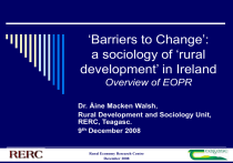 ‘Barriers to Change’: a sociology of ‘rural development’ in Ireland Overview of EOPR Dr. Áine Macken Walsh, Rural Development and Sociology Unit, RERC, Teagasc. 9th December 2008 Rural Economy Research Centre December 2008 Overview: Context & Methodology Findings & Implications Conclusions and recommendations Rationale Teagasc RD Commodity Group (2005): Resistance to Change in the adoption of ‘alternative’, ‘diverse’ economic activity The growing significance of ‘rural development’ in the EU context Failure of economic rationale to explain ‘barriers to change’ Alternative methodological approach to explain socio-cultural factors that govern decision-making Stages of the study Analysis of a primary RD policy instrument (deconstruction of the governance and RD model, the context of its emergence and its central claims) Development of appropriate methodology to investigate interplay of the model with rural society Implementation of methodology Analysis of primary field data Results: Policy evaluative Sociological analytical Contextualisation: consultation with policy makers & practitioners Emergence of the model: EC: rural problems reaching ‘crisis proportions’ - 1980s “rural population decline was acute; the effects of the polluting non-sustainable character of heavily capitalised intensive agriculture was becoming evident in the natural environment; there were steeply declining numbers at work in agriculture and low agricultural incomes, (stemming in part for the high proportion of officially categorised non-viable farms); rural underemployment was rife; and there was a deficiency of outlets for off-farm employment opportunities” (Kearney et al, 1995) ‘The Future of Rural Society’ (CEC, 1988) Broadened concept of the rural economy: “a complex economic and social fabric made up of a wide range of activities: farming, small trades and businesses, small and medium-sized industries, commerce and services” (CEC, 1988) The LEADER model (1991 - ) Move away from sectoral, ‘top-down’ policy to: provide integrated (multi-sectoral) and representative (democratic) rural development. “to provide representation to a wide span of local interests, and thus an effective means of developing local economies” The EC LEADER Programme “the basic ideas behind these (partnership) schemes is that all the competent actors in the development process be brought together in a way that will allow them to pool their talents and complement each other over a set period during which, under the stimulus provided by the partnership, a cycle of accelerated local development will occur” (Curtin and Varley, 1997, p. 142). LEADER “enabling a better understanding of the area and its living strength” (CEC, 1988) “an innovation and a lever of innovation” (LEADER European Observatory, 1997 ‘Barriers to Change’ Overview research question: Is governance and rural development: representative & effective in practice? Central analytical focus: interplay between policy model and social environment in which it is implemented Agricultural studies: positivism is dominant, the “cultural turn” has been slow to influence studies in agriculture (Barnett, 1998) Socio-cultural research Source: Food and Agriculture Organisation (FAO) of the United Nations (2000) Socio-cultural research Examines a specific question of interest in a holistic fashion Why people behave as they do. Analysis of multiple determinants of behaviour in the context in which it takes place. Uncovering the rationale for individual behaviour as socially constructed, and the reasons for differences in the behaviour of various groups “An in-depth understanding of the cultural context and the factors that determine local level outcomes is crucial for the formulation and the success of policies and programmes that are acceptable, appropriate and sustainable” Providing insight into the cultural context of the issues that affect agriculture and rural development. UNFAO (2000) Socio-cultural research Identifying the complete range of issues and perceptions that combine to explain the interviewee’s rationale or ‘view of the world’. Detecting the inter-dependent nature of experiences and perceptions, which analysed on their own, can be meaningless or misleading (see Wilson, 1997). Understanding objective rationalisation of external structures or stimuli (e.g. agricultural policies) and his/her objective responses, rather than assuming a farmer to be a passive adopter of these structures (Darnhofer et al, 2005). Methodology: Qualitative research methods Policy model is fixed Socio-cultural context of implementation/adoption is various Seeking to understand subjectivity i.e. the social and cultural ‘scripts’ which ultimately determine identities, attitudes, and behaviour (Canetto, 2005) Qualitative Methodology 3 pronged approach 1. 2. 3. Policy analysis: deconstruction of governance and rural development model (proxy data analysis, interviews with practitioners / policy officials) Sociological analysis: design and implementation of qualitative interviewing (ethnographic study of socio-cultural factors) Focus group interviewing with local and extra local policy-makers and practitioners: enhancing practical relevance and application of research findings 1: Analysis of model Deconstruction of policy model: What is the policy context of the model’s emergence? What are the central claims of the model? Operation in practice at local level: How has LEADER taken form in chosen case-study areas, using as evidence: Detailed operational plans and annual reports The actors that have become involved Records of the projects they have funded: i.e. development outcome 2. Test: two social groups… Traditionally primary social groups in Ireland Engagement among members of these groups in ‘rural development’ is poor Farming community: ‘Custodians of the countryside’ Within group, some are increasingly non-viable In