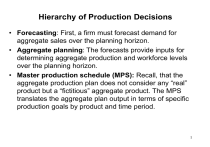 Hierarchy of Production Decisions • Forecasting: First, a firm must forecast demand for aggregate sales over the planning horizon. • Aggregate planning: The forecasts provide inputs for determining aggregate production and workforce levels over the planning horizon. • Master production schedule (MPS): Recall, that the aggregate production plan does not consider any “real” product but a “fictitious” aggregate product. The MPS translates the aggregate plan output in terms of specific production goals by product and time period. 1 Hierarchy of Production Decisions Forecast of Demand Aggregate Planning Master Production Schedule Inventory Control Operations Scheduling Vehicle Routing 2 Hierarchy of Production Decisions Suppose that a firm produces three types of chairs: 1.ladder-back chair, 2.kitchen chair 3. desk chair. The aggregate production considers a fictitious aggregate unit of chair and finds that the firm should produce 550 units of chairs in April. The MPS then translates this output in terms of three product types and four work-weeks in April. 3 Hierarchy of Production Decisions • The MPS suggests that the firm produce 200 units of desk chairs in Week 1, 150 units of ladder-back chair in Week 2, and 200 units of kitchen chairs in Week 3. • Material Requirements Planning (MRP): A product is manufactured from some components or subassemblies. For example a chair may require two back legs, two front legs, 4 leg supports, etc. 4 Hierarchy of Production Decisions Master Production Schedule April 1 Ladder-back chair 2 3 Aggregate production plan for chair family 4 5 150 6 7 8 150 200 Kitchen chair Desk chair May 200 120 120 200 550 200 790 5 Hierarchy of Production Decisions While forecasting, aggregate plan and MPS consider the volume of finished products, MRP plans for the components, and subassemblies. A firm may obtain the components by in-house production or purchasing. MRP prepares a plan of in-house production or purchasing requirements of components and subassemblies. • Scheduling: Scheduling allocates resources over time in order to produce the products. The resources include workers, machines and tools. • Vehicle Routing: After the products are produced, the firm may deliver the products to some other manufacturers, or warehouses. The vehicle routing allocates vehicles and prepares a route for each vehicle. 6 Hierarchy of Production Decisions Materials Requirement Planning Back legs Back slats Seat cushion Leg supports Seat-frame boards Front legs 7 Material Requirements Planning • The demands for the finished goods are obtained from forecasting. These demands are called independent demand. • The demands for the components or subassemblies depend on those for the finished goods. These demands are called dependent demand. • Material Requirements Planning (MRP) is used for dependent demand and for both assembly and manufacturing • If the finished product is composed of many components, MRP can be used to optimize the inventory costs. 8 Importance of an MRP System • Next two slides explain the importance of an MRP system. The first one shows inventory levels when an MRP system is not used. The next one shows the same when an MRP system is used. • The chart at the top shows inventory levels of the finished goods and the chart on the bottom shows the same of the components. • If the production is stopped (like it is at the beginning of the chart), the finished goods inventory level decreases because of sales. However, the component inventory level remains unchanged. When the production resumes, the finished goods inventory level increases, but the component inventory level decreases. 9 Importance of an MRP System Inventory without an MRP System 10 Importance of an MRP System Inventory with an MRP System 11 Importance of an MRP System • Without an MRP system: – Component is ordered at time A, when the inventory level of the component hits reorder point, R – So, the component is received at time B. – However, the component is actually needed at time C, not B. So, the inventory holding cost incurred between time B and C is a wastage. • With an MRP system: – We shall see in this lesson that given the production schedule of the finished goods and some other information (see the next slide), it is possible to predict the exact time, C when the component will be required. Order is placed carefully so that it is received at time C. 12 MRP Input and Output • MRP Inputs: – Master Production Schedule (MPS): The MPS of the finished product provides information on the net requirement of the finished product over time. – Bill of Materials: For each component, the bill of materials provides information on the number of units required, source of the component (purchase/ manufacture), etc. There are two forms of the bill of materials: • Product Structure Tree: The finished product is shown at the top, at level 0. The components assembled to produce the finished product is shown at level 1 or below. The sub-components used to produce the components at level 1 is 13 MRP Input and Output Master Production Schedule Forecasts Bill of Materials file MRP computer program Inventory file To Production Reports Orders To Purchasing 14 MRP Input and Output shown at level 2 or below, and so on. The number in the parentheses shows the requirement of the item. For example, “G(4)” implies that 4 units of G is required to produce 1 unit of B. The levels are important. The net requirements of the components are computed from the low levels to high. First, the net requirements of the components at level 1 is computed, then level 2, and so on. 15 MRP Input and Output • Bill of Materials: For each item, the name, number, source, and lead time of every component required is shown on the bill of materials in a tabular form. – Inventory file: For each item, the number of units on hand is obtained from the inventory file. • MRP Output: – Every required it