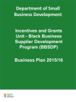 Department of Small Business Development Incentives and Grants Unit - Black Business Supplier Development Program (BBSDP) Business Plan 2015/16 21/03/2016 Structure of the Business Plan • DSBD Strategic Objective • Legislative, Policies and Strategis • Objectives/goals of the Incentives Unit • Mission and Vision • Unit Programmes • Black Business Supplier Development Program (BBSDP) • Cooperative Incentive Scheme (CIS) • Youth, Women and People with Disabilities Business Development Program (YWPWD) • Business Units Performance Plan • Financial Plan • Risks/Challenges/Areas of improvement • Organisational Human needs • Key projects 1 21/03/2016 Departments Strategic Objective • DSBD Strategic Objective To Create an enabling environment for the development and growth of sustainable small businesses that would ensure that they contribute to the creation of employment and economic growth • The Incentives Unit Alignment to DSBD To provide incentives programmes that promote broader participation in the mainstream economy by small businesses and co operative owned by individuals from historically disadvantaged communities and marginalised regions. 2 21/03/2016 Incentives Units Legislative, Policies and Strategies • • • • • • • • • • The Public Finance Management Act of 1999 and amended National Small Business Act of 1996 and as amended in 2004; The Co-Operatives Act of 2013 Broad Based Black Economic Empowerment Amendment Act, 2013 The Integrated Small Business Development Strategy (2004) The New Growth Path The Industrial Policy Action Plan National Development Plan The DSBD 2015-19 Strategic Plan The Medium Term Strategic Framework ( Outcome 4: Decent employment through inclusive growth) 3 21/03/2016 Functions of the Unit • Implement incentives that support employment creation and support National Priorities • Achieve an improved customer satisfaction • Design and Implement Incentives programmes that support sustainability of SMME and Cooperative, competitiveness, job creation and equity • Provide Post investment Support • Build a strong organisational capability • Build strategic business linkages that ensure mutually beneficial partnerships 4 21/03/2016 Rationale for Co-operatives Development Vision & Mission Unit Unit Vision & Mission: To administer a set of incentive instruments which are meant to stimulate and facilitate the development of sustainable, competitive enterprises through the efficient provision of effective and accessible incentive measures that support national priorities ( Unemployment, Inequality and Poverty) 5 21/03/2016 Rationale for Co-operatives Development Unit Programmes Unit • Black Business Supplier Development Program (BBSDP) • Cooperatives Incentive Scheme (CIS) • Shared Economic Infrastructure Facility (SEIF) • Youth, Women and People with Disabilities Business Development Program (YWPWD) 6 21/03/2016 Rationale for Co-operatives Development Black Business Supplier Development Program (BBSDP) Unit BRIEF BACKGROUND ABOUT BBSDP • The current BBSDP was relaunched in 2010 in order to address the constraints that many black-owned small enterprises faced in participating in the mainstream economy. • Start Date: • End date : • Program aligned with BBBEE policy • Impact Study for 2 yrs. to be undertaken starting in the 1 September 2010 31 July 2017 current financial year 7 21/03/2016 Rationale for Co-operatives Development Black Business Supplier Development Program (BBSDP) Unit BBSDP OBJECTIVE • To fast-track existing SMMEs that exhibit good potential for growth into the mainstream economy. • To grow black-owned enterprises by fostering linkages between black SMMEs, private and public sector entities. • To complement current affirmative procurement and outsourcing initiatives of corporate and public entities. • To enhance the capacity of grant recipient enterprises to successfully compete for corporate and public sector procurement and outsourcing opportunities. 8 21/03/2016 Rationale for Co-operatives Development Black Business Supplier Development Program (BBSDP) Unit BBSDP OFFERING • Eligible Enterprises can receive an incentive grant value up to R1 million • The program provides grants to a maximum of R800 000 for tools, machinery and equipment and; • R200 000 for business development and training interventions per eligible enterprise. 9 21/03/2016 Rationale for Co-operatives Development Black Business Supplier Development Program (BBSDP) Unit COST SHARING STRUCTURE • For Tools , Machinery and Equipments, the BBSDP will offer a cost-sharing grant of 50% of the approved costs of qualifying interventions, and approved enterprises will contribute 50% of the necessary costs (for business development services and training). • For Enterprise Support Services interventions, the BBSDP will offer a cost-sharing grant of 80% of the approved costs of qualifying interventions, and approved enterprises will contribute 20% of the necessary costs (for business development services and training). 10 21/03/2016 Rationale for Co-operatives Development Black Business Supplier Development Program (BBSDP) Unit QUALIFYING CRITERIA • Predominantly black-owned (51%). • Have a predominantly black management team (50%). • R250 000 to R35million annual turnover. • Operating or trading for at least one year. • If operating for less than a year and or below the entry turnover threshold but has a valid tender or contract the applications may be considered at the sole discretion of the dsbd. 11 21/03/2016 Rationale for Co-operatives Development Black Business Supplier Development Program (BBSDP) Unit EXAMPLES OF SOME OF THE INTERVENTIONS THAT HAVE BEEN SUPPORTED ENTERPRISE SUPPORT MACHINERY TOOLS AND EQUIPMENTS SERVICES (ESS) COST SHARING 80:20 • • • • • • • • Quality management system and assurance (e.g. International Organisation for Standardisation (ISO), certification, 
