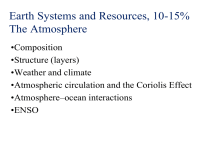 Earth Systems and Resources, 10-15% The Atmosphere •Composition •Structure (layers) •Weather and climate •Atmospheric circulation and the Coriolis Effect •Atmosphere–ocean interactions •ENSO College Board: Air Pollution • • • • • • • • • Sources — primary and secondary Major air pollutants Measurement units Smog Acid deposition — causes and effects Heat islands and temperature inversions Indoor air pollution; remediation and reduction strategies Clean Air Act and other relevant laws Troposphere – ‘Sky’ • 75% of mass of atmosphere • 0 to 11 miles in altitude • 78% nitrogen, 21% oxygen (+ H2O, CO2) • Location of ‘weather’ • Temperature decreases with altitude (lower pressure) until the next layer is reached Stratosphere • 99% of ultraviolet radiation (especially UVB) is absorbed by the stratosphere • Temperature increases with altitude • Ozone • Ozone (O3) = O2 + O2 + lightning/sunlight = O3 Mesosphere • The temperature decreases with increasing altitude Thermosphere • Temperature increases with increasing altitude • Very high temperatures, very few molecules Layers of the Atmosphere • Thermosphere – ‘top’ layer; absorbs solar radiation • Mesosphere – middle layer; most meteors ‘melt’ here • Stratosphere - UV absorbed by ozone • Troposphere – ‘sky’; decreasing temperature; 78%, 21% Climate: Introduction • Weather – the condition of the atmosphere in a local area • Temperature, atmospheric pressure, cloudiness, wind, humidity and precipitation • Climate - a larger area’s average weather conditions over a looonnng time • Seasons • More direct sun – summer • Less direct sun - winter • Warmer molecules rise, cooler molecules fill the space • The surface of the earth heats unevenly • Land masses change temperature faster than water • Wind – moving air mass http://www.youtube.com/ watch?v=klOhwR5h_Aw Wind • Caused by a pressure gradient: • Cooler air has more air pressure (air is more dense) warmer air has less pressure (air is less dense) • Air moves from cooler, high pressure air to warmer, low pressure • Wind – movement of air Global Air Circulation • Six giant convection cells occur at different latitudes • Heat and moisture are circulated around but not evenly • Pattern of circulation creates different climates (biomes) • Deserts around ___ latitude • Rains around ___ latitude • ‘Horse’ latitudes – ‘doldrums’ Ocean Currents: Distribute Heat and Nutrients • Ocean currents influence climate by distributing heat from place to place and mixing and distributing nutrients. http://www.youtube.com/watch?v=6vgvTeuoDW Y&edufilter=vH8ntV7keCE-ZLl5wRMzNg Breezes • Mountain breeze - cooler air sinks down causing increased winds on the mountain. • Valley breeze – air mass is forced into a smaller area which causes high winds to form through the valleys • Warm, moist air masses hitting cooler air on the tops of mountains causes the moisture in the air to condense forming precipitation • Valleys are often fertile, good places for crops Altitude Affects Temperature • Pressure – molecules pushing • Air pressure - the weight of the air/atmosphere • At sea level – 14.7 pounds per square inch • 760mm Hg (1 Barr) • Barometer measures atmospheric pressure Rain shadow effect The Coriolis Effect • The rotation of the Earth on its axis that deflects winds to the right in the Northern Hemisphere and to the left in the Southern Hemisphere. http://www.youtube.com/watch?v=XiYs4QBW TOo&edufilter=vH8ntV7keCE-ZLl5wRMzNg http://www.youtube.com/watch? v=i2mec3vgeaI&edufilter=vH8n tV7keCE-ZLl5wRMzNg ENSO • El Nino – Southern Oscillation • Disruption of the normal ocean-air interactions • Pushes down the upwelling of nutrients from the ocean floor – less nutrient = less primary productivity • Rain patterns change – drought in some places, heavy rain in others • Colder winters in NE US, more Atlantic hurricanes Pollutants • Produced from a source into the atmosphere • Particulates (particles), gases • Natural causes: • Volcanoes, fires, sea salt, pollen, dust, decaying vegetation • Anthropogenic – caused by humans • Methane, various oxides, ozone, dust particles, microorganisms, and chlorofluorocarbons (CFC’s) • Anthropogenic causes of Primary Pollutants – factories, cars, power generation Air Pollution – Primary and Secondary Pollutants • Primary air pollutants – produced directly into the atmosphere • Secondary air pollutants – produced when primary air pollutants react Primary Pollutants CO CO2 SO2 NO NO2 Most hydrocarbons Most suspended particles Sources Natural Mobile Stationary Secondary Pollutants SO3 HNO3 H3SO4 H2O2 O3 PANs Most NO3– and SO42– salts Major Pollutants • • • • • • • Carbon oxides (CO, CO2) Nitrogen oxides (NO, NO2, HNO3) Sulfur oxide (SO2, H2SO4) SPM (Suspended Particulate Matter) Ozone VOCs – (Volatile Organic Compounds) Radon Major Pollutants • Carbon oxides: • Carbon monoxide (CO) is a highly toxic gas that formed from incomplete combustion of carboncontaining materials (cars) • 93% of carbon dioxide (CO2) in the troposphere occurs naturally as a result of the carbon cycle. • 7% of CO2 in the troposphere is anthropogenic (burning fossil fuels; coal, oil) • It is not regulated as a pollutant under the U.S. Clean Air Act Major Pollutants • Nitrogen oxides and nitric acid: • Nitrogen oxide (NO) forms when nitrogen and oxygen gases react in car engines and coal-burning plants • NO can also form from lightening, soil and legumous bacteria (nitrogen fixation) • NO reacts with air to form NO2 • NO2 reacts with water vapor in the air to form nitric acid (HNO3), acid deposition (Secondary pollutant) Major Pollutants • Sulfur dioxide (SO2) and sulfuric acid: • About one-third of SO2 is natural • Anthropogenic – sulfurous coal, oil refining 