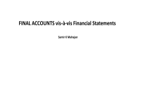 FINAL ACCOUNTS vis-à-vis Financial Statements Samir K Mahajan CLASSIFICATION OF FINAL ACCOUNT Trial balance proves the arithmetical accuracy of the business transactions, but it is not the end. The businessman is interested in knowing whether the business has resulted in profit or loss and what the financial position of the business is at a given period. In short, he wants to know the profitability and the financial soundness of the business. The trader can ascertain these by preparing the final accounts. The final accounts are prepared at the end of the year from the trial balance. Hence the trial balance is said to be the connecting link between the ledger accounts and the final accounts. CLASSIFICATION OF FINAL ACCOUNT contd. The basic objectives of preparing financial statements are : (a) To present a true and fair view of the financial performance of the business; (b) To present a true and fair view of the financial position of the business; and For this purpose, the firm usually prepares the following financial statements: 1. Trading and Profit and Loss Account 2. Balance Sheet Trading and Profit and Loss account, also known as Income statement, shows the financial performance in the form of profit earned or loss sustained by the business. Balance Sheet shows financial position in the form of assets, liabilities and capital. These are prepared on the basis of trial balance and additional information, if any. TRADING AND PROFIT AND LOSS ACCOUNT Trading and Profit and Loss account is prepared to determine the profit earned or loss sustained by the business enterprise during the accounting period. It is basically a summary of revenues and expenses of the business and calculates the net figure termed as profit or loss. Profit is revenue less expenses. If expenses are more than revenues, the figure is termed as loss. Trading and Profit and Loss account summarises the performance for an accounting period. It is achieved by transferring the balances of revenues and expenses to the trading and profit and loss account from the trial balance. Concept of Gross Profit and Net Profit Trading and Profit and Loss account is also an account with Debit and Credit sides. It can be observed that debit balances (representing expenses) and losses are transferred to the debit side of the Trading and a Profit and Loss account and credit balance (representing revenues/gains) are transferred to its credit side. The trading and profit and loss can be seen as combination of two accounts, viz. Trading account and Profit and Loss account. The trading account or the first part ascertains the gross profit and profit and loss account or the second part ascertains net profit. TRADING ACCOUNT The trading account ascertains the result from basic operational activities of the business. The basic operational activity involves the manufacturing, purchasing and selling of goods. It is prepared to ascertain whether the selling of goods and/or rendering of services to customers have proved profitable for the business or not. Trading account ascertain gross profit or gross loss. Gross Profit = Sales less return – (Purchases less return + Direct Expenses) The gross profit or the gross loss is transferred to profit and loss account. Trading Account contd. ITEMS APPEARING IN THE DEBIT SIDE OF TRADING ACCOUNT o Opening stock: Stock on hand at the beginning of the year is termed as opening stock. The closing stock of the previous accounting year is brought forward as opening stock of the current accounting year. In the case of new business, there will not be any opening stock. o Purchases less returns : Purchases made during the year, includes both cash and credit purchases of goods. Purchase returns must be deducted from the total purchases to get net purchases. ITEMS APPEARING IN THE DEBIT SIDE OF TRADING ACCOUNT contd. Trading Account contd. Direct Expenses: Direct expenses means all expenses directly connected with the manufacture, purchase of goods and before bringing them to the point of sale. Some of the direct expenses are: i. Wages: It means remuneration paid to workers. ii. Carriage (Freight or cartage) or carriage inwards: It means the transportation charges paid to bring the goods from the place of purchase to the place of business. iii. Octroi Duty: Amount paid to bring the goods within the municipal limits. iv. Customs duty, dock dues, clearing charges, import duty etc. These expenses are paid to the Government on the goods imported. v. Factory rent paid vi. Other expenses : Fuel, power, lighting charges, oil, grease, waste related to production and packing expenses Trading Account contd. ITEMS APPEARING IN THE CREDIT SIDE OF TRADING ACCOUNT o Sales less returns: This includes both cash and credit sale made during the year. Net sales is derived by deducting sales return from the total sales. o Closing stock: Closing stock is the value of goods which remain in the hands of the trader at the end of the year. It does not appear in the trial balance. It appears outside the trial balance. (As it appears outside the trial balance, first it will be recorded in the credit side of the trading account and then shown in the assets side of the balance sheet). Trading Account contd. ITEMS APPEARING IN THE CREDIT SIDE OF TRADING ACCOUNT contd. BALANCING OF TRADING ACCOUNT The difference between the two sides of the Trading Account, indicates either Gross Profit or Gross Loss. If the credit side total is more, the difference represents Gross Profit. On the other hand, if the total of the debit side is more, the difference represents Gross Loss. o The Gross Profit or Gross Loss is transferred to Profit & Loss Account. Format of Trading Account Dr Trading Account for the year ending 31st March …………. Cr Particulars (expenses /loss) Rs Rs To Opening Stock To Stock: Raw materials Work in progress Semi-finished goods Finished goods To Purchases Less: Returns outward or purchase return Less: goods taken away by proprietor Le
