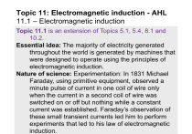 Topic 11: Electromagnetic induction - AHL 11.1 – Electromagnetic induction Topic 11.1 is an extension of Topics 5.1, 5.4, 8.1 and 10.2. Essential idea: The majority of electricity generated throughout the world is generated by machines that were designed to operate using the principles of electromagnetic induction. Nature of science: Experimentation: In 1831 Michael Faraday, using primitive equipment, observed a minute pulse of current in one coil of wire only when the current in a second coil of wire was switched on or off but nothing while a constant current was established. Faraday’s observation of these small transient currents led him to perform experiments that led to his law of electromagnetic induction. Topic 11: Electromagnetic induction - AHL 11.1 – Electromagnetic induction Understandings: • Electromotive force (emf) • Magnetic flux and magnetic flux linkage • Faraday’s law of induction • Lenz’s law Applications and skills: • Describing the production of an induced emf by a changing magnetic flux and within a uniform magnetic field • Solving problems involving magnetic flux, magnetic flux linkage and Faraday’s law • Explaining Lenz’s law through the conservation of energy Topic 11: Electromagnetic induction - AHL 11.1 – Electromagnetic induction Guidance: • Quantitative treatments will be expected for straight conductors moving at right angles to magnetic fields and rectangular coils moving in and out of fields and rotating in fields • Qualitative treatments only will be expected for fixed coils in a changing magnetic field and ac generators Data booklet reference: • = BA cos • = – N / t • = BVℓ • = BVℓN Topic 11: Electromagnetic induction - AHL 11.1 – Electromagnetic induction Theory of knowledge: • Terminology used in electromagnetic field theory is extensive and can confuse people who are not directly involved. What effect can lack of clarity in terminology have on communicating scientific concepts to the public? Utilization: • Applications of electromagnetic induction can be found in many places including transformers, electromagnetic braking, geophones used in seismology, and metal detectors Topic 11: Electromagnetic induction - AHL 11.1 – Electromagnetic induction Aims: • Aim 2: the simple principles of electromagnetic induction are a powerful aspect of the physicist’s or technologist’s armory when designing systems that transfer energy from one form to another Topic 11: Electromagnetic induction - AHL 11.1 – Electromagnetic induction Electromotive force (emf) Consider the magnetic field (B-field) provided North by a horseshoe magnet ( a curved bar magnet). If we place a stationary charge q South within the B-field, it will feel NO MAGNETIC FORCE. Yet if we project the charge q through the B-field with a velocity v it will feel a force: F = qvB sin magnetic force on a where is angle between v and B moving charge Topic 11: Electromagnetic induction - AHL 11.1 – Electromagnetic induction Induced electromotive force (emf) It should thus come as no surprise that moving a piece of wire (a conductor) through a magnetic field produces a magnetic force on the charges in the moving wire: Don’t forget the right-hand-rule! + v B Topic 11: Electromagnetic induction - AHL 11.1 – Electromagnetic induction Induced electromotive force (emf) Consider this new experiment: If the north pole of a magnetic is suddenly thrust through a looped conductor, a current is created. T or F:Current travels through the circuit only while the magnet is moving through the loop. T or F:Current 0 direction depends on + which direction the magnet is being moved through the loop. Topic 11: Electromagnetic induction - AHL 11.1 – Electromagnetic induction Induced electromotive force (emf) Since moving a conductor through a magnetic field produces a current, this very action must therefore induce an electromotive force (emf) in the conductor. Since moving a magnetic field trough a conductor produces a current, this very action must therefore induce an emf in the conductor. We have shown, therefore, that all we need is relative motion between a conductor and a magnetic field in order to induce an emf. FYI This is the principle behind electricity generation using turbines and generators. Motion of a conductor through a B-field produces an emf which can drive a current. Topic 11: Electromagnetic induction - AHL 11.1 – Electromagnetic induction Induced electromotive force – straight wire through B EXAMPLE: Show that the emf induced in a straight conductor of length ℓ moving at velocity v through a magnetic field of strength B is = Bvℓ induced emf in a where v and B are perpendicular straight wire SOLUTION: Note that since v B then = 90º: F = qvB sin = qvB sin 90º = qvB. Recall that E = V / x = V / ℓ and that F = qE. Since F = qE = qV / ℓ and F = qvB, we have qV / ℓ = qvB V = Bvℓ = . The IBO expects you to derive this formula. Topic 11: Electromagnetic induction - AHL 11.1 – Electromagnetic induction Induced electromotive force – straight wire through B PRACTICE: The Boeing Dreamliner, having wingspan of 60 m, is flying through Earth’s magnetic field near Tuscon (B = 56 T) at 265 ms-1. Treating the wing as a straight wire, find the induced emf from wingtip to wingtip. SOLUTION: = Bvℓ = (5610-6)(60)(265) = 0.90 V. FYI Sometimes weaker magnetic field strength is measured in gauss instead of tesla. The conversion is 1 gauss = 10-4 tesla. Thus the B in this example is B = 0.56 gauss. Topic 11: Electromagnetic induction - AHL 11.1 – Electromagnetic induction Magnetic flux Consider the experiment where the plane of the loop is in the same plane as the moving magnetic field: T or F:Because of the orientation of the loop most of the magnetic field lines to NOT pass through the area of the loop. T or F:There is 0 no current + generated in this experiment. Topic 11: Electromagnetic induction - AHL 11.1 – Electromagnetic induc