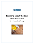 Learning about the Law Lesson: Working in BC CLB 7-8 Instructional Package Working in BC Lesson Plan: Working in BC (CLB 7-8) CLB Outcomes CLB 8-IV: Comprehending Information CLB 7-II: Giving Instructions CLB 8-IV: Comprehending Information Understand extended monologue or presentation on topics that are generally familiar and related to general knowledge or technical/work-related issues in own field. Give instructions and directions for technical and nontechnical tasks, procedures and processes. Access, locate and integrate several pieces of information from relevant online reference sources. Content Outcomes Understand how laws may affect you at work Identify specific laws that protect you when you are working Identify where to get more information about the rights and responsibilities of employers and employees Resources People’s Law School (PLS) Learning about the Law Wikibook or Learning about the Law (Working in BC, Renting a Home) booklet (hardcopy, published 2013). PLS worksheets, “Learning about the Law: Working in BC” Computer lab (optional) External Resources and Referrals For more information on employment laws, visit www.labour.gov.bc.ca For more information on discrimination in the workplace, visit www.justiceeducation.ca Assessment Plan and Tools Self-assessment checklist Learning and the Law: Working in BC - People’s Law School 2013 Working in BC Sample Lesson Plan Time Sample Tasks Warm up 10’ In small groups, students talk about what they know about employment laws in Canada, using the topics in the organizer as a guide Students discuss and compare laws in their own countries related to employment law Pre-read 15’ Individually, students fill in the first column and second column In small groups, students discuss their notes in the second column and add to the list if they wish Let students know that they will fill in the final column at the end of the lesson Expected Outcome Activate prior knowledge 20’ In pairs, students complete the multiple-choice questions as a prereading task When finished, students scan for the correct answers in the PLS wikibook or booklet discuss their answers Listen and discuss 20’ Students discuss what they know about the Employment Standards Branch Students predict what they will hear by checking off Yes or No on the list of items according to what the Employment Standards Branch addresses or provides help with Student watch the video to check their answers Learning and the Law: Working in BC PLS Worksheet: Get Ready! Prepare for reading PLS Worksheet: Prepare and Generate interest Review! Predict and read Resources Understand more about BC laws that affect workers Identify specific laws that protect you at work PLS Worksheet: Read and Comprehend! PLS Learning about the Law Wikibook or booklet Listen for details Identify where to get more information about rights and responsibilities of employers and employees PLS Worksheet: Listen and Check! Computer lab - People’s Law School 2013 Working in BC Time Sample Tasks 30’ Students work with a partner Assign each pair one situation Pairs research the Employment Standards Branch website factsheets in order to create a flow chart or graphic organizer of the information Students prepare mini oral presentations of the information in order to provide instructions to the class for the situation they researched Identify where to get more information about employment standards Understand moderately complex extended descriptions Access and locate online information for a specific purpose Present instructions for how to address certain workplace issues Choose and write 25’ Students choose one task Students research the PLS wikibook or booklet and the Employment Standards Branch website in order to complete the task Students present their writing tasks to a partner or hand in for feedback Find out more! 30’ Students find out more information about human rights in the workplace and when renting a home Learning and the Law: Working in BC Resources http://www.labour .gov.bc.ca/esb/vide os/welcome.htm Students watch the video a second time in order to identify where to get help with the items for which the Employment Standards Branch does not provide assistance Research and present Expected Outcome Understand how BC laws may affect you at work Write an appropriate formatted text Define human rights Identify basic human rights laws in BC in the workplace and when renting a PLS Worksheet: Giving Instructions Computer lab http://www.labour .gov.bc.ca/esb/facs hts/welcome.htm PLS Worksheet: Write! PLS Learning about the Law Wikibook or booklet Computer lab http://www.labour .gov.bc.ca/esb/wel come.htm PLS Worksheet: Find out more! Computer lab http://www.justice education.ca/resou rces/human-rightsin-bc - People’s Law School 2013 Working in BC Time Sample Tasks Expected Outcome Resources home Review 15’ Have the students go back to their worksheet and fill in the final column of the KWL chart as a review of what they learned in today’s class Go around and elicit one or two points from each student about what they learned in regards to rights and responsibilities Speed read or review Use the list of questions as a way to review or have the students find the information Teaching Ideas: 20’ Option 1: Do a speed reading competition by asking a question and having the students race to find the answers in the PLS wikibook or booklet Option 2: Do a review but using the questions in a Family Feud or Jeopardy game Self-Assessment 10’ Allow students to fill out selfassessment form on their own Learning and the Law: Working in BC Review and reflect on what was learned in class PLS Worksheet: Prepare and Review! Review and comprehend content related to employment laws PLS Worksheet: Game Time! Skim and scan to find information Self-assessment PLS Learning about the Law Wikibook or booklet PLS Worksheet: What did you learn? - People’s Law School 2013 Working in BC Get Ready! In your group, disc