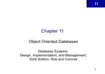11 Chapter 11 Object Oriented Databases Database Systems: Design, Implementation, and Management, Sixth Edition, Rob and Coronel 1 11 In this chapter, you will learn: • What basic concepts govern OO systems • How OO features are related to the more traditional relational and ER models • What the basic features of an OO database management system (OODBMS) are • What effect OO concepts are likely to have on data modeling and design Database Systems: Design, Implementation, & Management, 6th Edition, Rob & Coronel 2 11 In this chapter, you will learn: (continued) • About the advantages and disadvantages of OODBMSs • How OO concepts have influenced the relational model • How Oracle9i implements object extensions Database Systems: Design, Implementation, & Management, 6th Edition, Rob & Coronel 3 11 Object Orientation and Its Benefits • A set of design and development principles based on conceptually autonomous computer structures known as objects • Each object represents a real-world entity with the ability to act upon itself and interact with other objects • Modularity is therefore almost inevitable Database Systems: Design, Implementation, & Management, 6th Edition, Rob & Coronel 4 11 Object Orientation Contributions Database Systems: Design, Implementation, & Management, 6th Edition, Rob & Coronel 5 11 The Evolution of Object Oriented Concepts • Object oriented programming – Developed as an alternative to traditional programming methods – Programmer creates or uses objects: • Self-contained, reusable modules that contain data as well as the procedures used to operate on such data Database Systems: Design, Implementation, & Management, 6th Edition, Rob & Coronel 6 11 The Evolution of Object Oriented Concepts (continued) • Object oriented programming languages were developed to: – Provide an easy-to-use software development environment – Provide a powerful software modeling tool for application development – Decrease development time by reducing the amount of code – Improve programmer productivity by making that code reusable Database Systems: Design, Implementation, & Management, 6th Edition, Rob & Coronel 7 11 The Evolution of Object Oriented Concepts (continued) • Object oriented environment has several important attributes: – Data set is no longer passive – Data and procedures are bound together, creating an object – Object has an innate ability to act on itself Database Systems: Design, Implementation, & Management, 6th Edition, Rob & Coronel 8 11 Object Oriented Concepts • Have their roots in programming languages • No knowledge of programming is necessary to understand these concepts Database Systems: Design, Implementation, & Management, 6th Edition, Rob & Coronel 9 11 Objects: Components and Characteristics • Object: – Abstract representation of a real-world entity – Has: • Unique identity • Embedded properties • Ability to interact with other objects and act upon itself – Defining characteristic is its unique identity Database Systems: Design, Implementation, & Management, 6th Edition, Rob & Coronel 10 11 Real-World Student Objects Database Systems: Design, Implementation, & Management, 6th Edition, Rob & Coronel 11 11 Object Identity • Unique to that object • Assigned by system at moment of object’s creation • Cannot be changed under any circumstances • Can be deleted only if the object is deleted • Can never be reused Database Systems: Design, Implementation, & Management, 6th Edition, Rob & Coronel 12 11 Attributes (Instance Variables) • Attributes: – Known as instance variables in OO environment • Domain: – Logically groups and describes the set of all possible values that an attribute can have Database Systems: Design, Implementation, & Management, 6th Edition, Rob & Coronel 13 11 Object Attributes Database Systems: Design, Implementation, & Management, 6th Edition, Rob & Coronel 14 11 Object State • Set of values that object’s attributes have at a given time • Can vary, although its OID remains the same • To change the object’s state, change the values of the object’s attributes • To change the object’s attribute values, send a message to the object – Message will invoke a method Database Systems: Design, Implementation, & Management, 6th Edition, Rob & Coronel 15 11 Messages and Methods • Method: – Code that performs a specific operation on object’s data – Protects data from direct and unauthorized access by other objects – Used to change the object’s attribute values or to return the value of selected object attributes – Represent real-world actions Database Systems: Design, Implementation, & Management, 6th Edition, Rob & Coronel 16 11 Depiction of an Object Database Systems: Design, Implementation, & Management, 6th Edition, Rob & Coronel 17 11 Method Components Database Systems: Design, Implementation, & Management, 6th Edition, Rob & Coronel 18 11 Objects Send Messages to Each Other Database Systems: Design, Implementation, & Management, 6th Edition, Rob & Coronel 19 11 Classes • Collection of similar objects with shared structure (attributes) and behavior (methods) • Class instance or object instance – Each object in a class Database Systems: Design, Implementation, & Management, 6th Edition, Rob & Coronel 20 11 Class Illustration Database Systems: Design, Implementation, & Management, 6th Edition, Rob & Coronel 21 11 Protocol • An object’s public aspect • How it is known by other objects as well as end users • Other objects communicate with the student object using any of these methods Database Systems: Design, Implementation, & Management, 6th Edition, Rob & Coronel 22 11 Public and Private Aspects of an Object Database Systems: Design, Implementation, & Management, 6th Edition, Rob & Coronel 23 11 OO Summary: Object Characteristics Database Systems: Design, Implementation, & Management, 6th Edition, Rob & Coronel 24 11 Musical Instrument