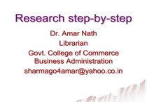 Research step-by-step Dr. Amar Nath Librarian Govt. College of Commerce Business Administration sharmago4amar@yahoo.co.in What is classified as research? Research is defined as: the creation of new knowledge and/or the use of existing knowledge in a new and creative way so as to generate new concepts, methodologies and understandings. This could include synthesis and analysis of previous research to the extent that it leads to new and creative outcomes. Types of research There are four types of research activity as defined : Pure basic research: is experimental and theoretical work undertaken to acquire new knowledge without looking for long term benefits other than the advancement of knowledge. Strategic basic research: is experimental and theoretical work undertaken to acquire new knowledge directed into specified broad areas in the expectation of useful discoveries. It provides the broad base of knowledge necessary for the solution of recognized practical problems. Applied research: is original work undertaken primarily to acquire new knowledge with a specific application in view. It is undertaken either to determine possible uses for the findings of basic research or to determine new ways of achieving some specific and predetermined objectives. Experimental development: is systematic work, using existing knowledge gained from research or practical experience for the purpose of creating new or improved products/processes. WHAT IS A LITERATURE REVIEW A literature review is a critical evaluation of literature published on a particular topic. Literature reviews are different to other types of writing you may have done at University in M.A.,M.Phil and PhD.level. There are many reasons why we conduct a literature review. Few are as follows: • To ensure thorough understanding of the topic • To identify potential areas for research • To identify similar work done within the area • Identifying knowledge gaps that demand further investigation • To compare previous findings • To evaluate existing findings and suggest further studies. • To demonstrate that you can access previous work in an area • To identify information and ideas that may be relevant to your project • To identify methods that could be relevant to your project LITERATURE REVIEWS VERSUS ESSAYS While literature reviews and essays require many of the same skills – for instance, critical thinking skills, academic writing skills and referencing skills – they have different purposes. Whereas essays require you to support your own arguments, literature reviews require you to critique the arguments of others. LITERATURE REVIEWS VERSUS ANNOTATED BIBLIOGRAPHIES While literature reviews and annotated bibliographies both require you to summarize sources, literature reviews involve much more than this. Annotated bibliographies are primarily descriptive, whereas literature reviews are primarily analytical. Literature reviews and annotated bibliographies are also structured differently. Annotated bibliographies are presented in an alphabetical list format, and each reference is treated separately. In contrast, literature reviews synthesize the ideas contained in each reference, and are structured around a central concept divided by subheadings. WHAT ARE THE PURPOSES OF A LITERATURE REVIEW? Literature reviews serve many purposes. It provide useful background information to your topic, which enables readers to better understand your topic. Demonstrate your knowledge of the subject area. Make clear your perspectives on the topic Justify your choice of research design. For instance, your choice of qualitative over quantitative approaches, or your method of data analysis. Explain how your work will fill in a gap in the scholarly literature. WHAT ARE THE KEY FEATURES OF A LITERATURE REVIEW? Literature reviews require you to critically evaluate the literature. To ‘critically evaluate’ a source is to scrutinize it to determine its strengths and weaknesses. The following REVIEW criteria will assist you in critically evaluating sources: R is for Relevance Does the reference completely cover your topic, or only one aspect of it? Have you read widely to determine how relevant it is in relation to other sources? E is for Expertise of author What is the educational background of the author? What are their qualifications? Are they writing in their area of expertise? Are they regularly cited by other authors in the field? V is for Viewpoint of author/organisation Does the author have any personal or professional affiliations that may bias their work? Has the research been sponsored by an organisation with a vested interest in the topic? What is the purpose of the source – to inform, persuade or entertain? I is for Intended audience Is the reference aimed at the general public or a scholarly audience? Is it intended for professionals in the field or a community of researchers? Is it intended for a large or small readership? E is for Evidence Are opinions supported by scholarly evidence? Is a particular referencing style used properly and consistently? Has the reference been subjected to peer review? W is for When published Was the reference published recently? Have significant developments been made in the subject area since the reference was published? THE REVIEW CRITERIA R is for Relevance How relevant is the resource to your topic or question? Does the resource provide a broad overview, or does it relate to just one aspect of your topic/question? Have you read a variety of sources to determine whether this one is useful? E is for Expertise of Author What is the educational background of the author? Is this topic in the author’s area of expertise? Are they regularly cited by the other authors in the field? V is for Viewpoint of Author/Organization Is the author or organisation associated with a particular view or position? What is the purpose of the resource? (is it intended to inform? To persuade? To entertain?) I is for Intend