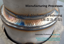 Manufacturing Processes Welding & Mechanical Fastening (용접과 조립) Associate Professor Su-Jin Kim Welding & Joining Manufacturing Processes © Pearson & GNU Su-Jin Kim School of Mechanical Engineering Gyeongsang National University Welding • Welding(용접) joins metals by melting it and adding a filler metals to form a pool of molten metal that cools to become a strong joint. • Energy sources: gas flame, electric arc, laser, friction. Welding & Joining Manufacturing Processes © Pearson & GNU Su-Jin Kim Fusion Welding (Liquid State Welding) 1. 2. 3. 4. Oxyfuel Gas Welding Arc Welding Laser Beam Welding Resistance Welding Welding & Joining Manufacturing Processes © Pearson & GNU Su-Jin Kim Fusion Welding • • • • Heat source: Oxyfuel fire, Arc, Laser Filler: Additional metals are supplied to the weld zone. Retarding Oxidization: Flux, shielding Gas Slag protects molten puddle from oxygen and spatter Welding & Joining Manufacturing Processes © Pearson & GNU Su-Jin Kim Oxyfuel Gas Welding • • Oxyfuel gas welding (산소용접) uses acetylene(C2H2) gas combined with oxygen to produce a flame. The flame melts the metals to be joined. Welding & Joining Manufacturing Processes © Pearson & GNU Su-Jin Kim Oxyfuel Gas Welding Flame types (a) NeutralWelding (b) OxidizingCutting (c) CarburizingHeating Welding & Joining Manufacturing Processes © Pearson & GNU Su-Jin Kim http://www.youtube.com/watch?v=y3E_MWG9Q0M Pressure Gas Welding 2 components welded by heating at their interface using a torch with oxyacetylene gas mixture and pressure. Welding & Joining Manufacturing Processes © Pearson & GNU Su-Jin Kim Rail : http://www.youtube.com/watch?v=B8XLVBYFxyk Arc Welding Arc Welding (아크용접) : Electric discharge is heat sorce. Shield metal AW Welding & Joining Manufacturing Processes © Pearson & GNU Su-Jin Kim Gas metal AW (MIG) Gas tungsten AW (TIG) Heat transfer in arc welding • Welding speed is VI ve uA Welding & Joining Manufacturing Processes © Pearson & GNU Su-Jin Kim e = efficiency V = voltage applied I = current u = specific energy A=weld section area Shielded metal arc welding • SMAW (피복금속AW) is the simplest and most versatile joining process. • It uses a consumable electrode coated in flux giving off a shielding gas. Welding & Joining Manufacturing Processes © Pearson & GNU Su-Jin Kim http://www.youtube.com/watch?v=TeBX6cKKHWY&feature=related Submerged arc welding • • Weld arc is covered by a flux powder which is fed into the weld zone by gravity through a nozzle. Flux completely covers the molten metal and prevents weld from oxidization and spatter. Welding & Joining Manufacturing Processes http://www.youtube.com/watch?v=Uns93e4HaNU&feature=related © Pearson & GNU Su-Jin Kim Gas metal arc welding • • GMAW(가스방호AW)= MIG (metal inert-gas welding) Weld area is shielded by gas (Ar, He, CO2) to prevent oxidation. Welding & Joining MIG: Manufacturing Processes © Pearson & GNU Su-Jin Kim http://ma.gnu.ac.kr/vod/Joining/Metal_Inert_Gas_Welding.MP4 Flux-cored arc welding • • FCAW (유심용제AW) is similar to MIG but electrode is tubular and filled with flux. Continuous and automatic electrode feeding. Welding & Joining Manufacturing Processes © Pearson & GNU Su-Jin Kim FCAW vs. MIG: http://www.youtube.com/watch?v=chE6RPhM3xE Electrogas welding • EGW welds thick vertical edges in one pass with special equipment. A shielding gas is sometimes used. Used in shipbuilding and storage tanks. Welding & Joining Manufacturing Processes © Pearson & GNU Su-Jin Kim http://www.youtube.com/watch?v=8nwP0JYQIdg Electroslag welding • • ESW is for thick (25~300mm) vertical edges. Flux is added. After the molten slag reaches the tip of the electrode, arc is extinguishes and energy is supplied through the electrical resistant of the molten zone. Welding & Joining Manufacturing Processes http://www.youtube.com/watch?v=rCL8NCy2eg8 © Pearson & GNU Su-Jin Kim Gas tungsten arc welding • • GTAW(텅스텐AW)=TIG(Tungsten inert gas) A filler metal is supplied from a filler wire. Welding & Joining Manufacturing Processes © Pearson & GNU Su-Jin Kim http://www.youtube.com/watch?v=VEEpikDY058 Plasma arc welding • • A concentrated plasma arc is produced and directed toward the weld area. Higher quality and speed than the TIG. Welding & Joining Manufacturing Processes © Pearson & GNU Su-Jin Kim Plasma AW http://www.youtube.com/watch?v=jo376zPns8I Plasma cutting • Plasma: gas -(heat)> plasma ( +ions + -electrons ) • Focused stream of plasma cut sheet metal. • Cutting speed ≈ efficiency, power / thickness, specific heat, melting point : v ≈ η P / (t w c Tm) - Negative electrode Cutting gas Shielding gas Plasma channel Positive metal Weldinghttp://www.youtube.com/watch?v=mJJydOxHwZU&feature=results_main&pla & Joining + Manufacturing Processes ynext=1&list=PL8EE6E5350B31D89B © Pearson & GNU Su-Jin Kim Electron-beam Welding • • Kinetic energy of high-velocity electrons is converted into heat to strike the workpiece. The higher the vacuum the more the beam will be able to penetrate the part and the greater depth-to-width ratio. Welding & Joining Manufacturing Processes © Pearson & GNU Su-Jin Kim http://www.youtube.com/watch?v=NONurFigP5I Laser-beam welding • • Uses a high-power laser beam as a heat source to produce a fusion weld. Has a high energy density and a deep penetrating capability. Welding & Joining Manufacturing Processes http://www.youtube.com/watch?v=51d6gQxg1KI © Pearson & GNU Su-Jin Kim Laser-beam welding • Laser welding of diff-case. Laser welded Section Bolted Welding & Joining Manufacturing Processes © Pearson & GNU Su-Jin Kim Press 10 ton + Laser welding Laser-beam Cutting • High power (kW) laser melts and evaporates material. • CO2 & Nd:YAG lasers are used for industrial cutting. Mirror Nd:YAG crystal Xenon Flashlamp Mirror Laser Welding & Joining http://ma.gnu.ac.kr/vod/Machining/Laser_beam_machining.MP