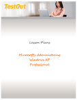 Lesson Plans Microsoft’s Administering Windows XP Professional (Exam 70-270) Table of Contents Course Overview ........................................................................................................ 4 Section 0.1: XP Administration ........................................................................ 6 Section 1.1: User Accounts and Preferences................................................ 9 Section 1.2: Managing Users..............................................................................12 Section 1.3: Managing Groups .........................................................................16 Section 1.4: User Profiles ....................................................................................19 Section 1.5: Group Policy ..................................................................................21 Section 2.1: Installing Devices .........................................................................24 Section 2.2: Drivers ...............................................................................................27 Section 2.3: Managing Devices.........................................................................30 Section 2.4: Hardware Profiles ........................................................................32 Section 3.1: Network Connections ..................................................................34 Section 3.2: TCP/IP ...............................................................................................36 Section 3.3: Name Resolution ..........................................................................40 Section 3.4: Dial-up and Direct Connections .........................................42 Section 3.5: Internet Connections ...................................................................45 Section 3.6: ICS and ICF ......................................................................................48 Section 3.7: Remote Services .............................................................................51 Section 4.1: File Systems .....................................................................................54 Section 4.2: Partitions and Volumes ............................................................57 Section 4.3: Additional Configuration .......................................................60 Section 5.1: Compression, Encryption, and Quotas..............................63 Section 5.2: NTFS Permissions .........................................................................66 Section 5.3: Shared Folders ...............................................................................68 Section 5.4: Share Access ....................................................................................71 Section 5.5: Offline Files ....................................................................................72 Section 5.6: Internet Information Services .................................................75 Section 6.1: Installing Printers .......................................................................77 Section 6.2: Printing Management ................................................................80 Section 6.3: Advanced Configuration and Troubleshooting ............83 Section 6.4: Faxing ................................................................................................86 Section 7.1: IE Resource Access ........................................................................89 Section 8.1: Applications ...................................................................................91 Section 8.2: Processes and Services ................................................................94 Section 8.3: Monitoring Performance ..........................................................97 Section 8.4: Optimizing Performance .......................................................100 Section 8.5: Backup and Recovery .............................................................103 Section 9.1: Group Policy ...............................................................................105 Section 9.2: Auditing ........................................................................................108 Section 9.3: Security Templates ...................................................................111 Section 9.4: IE Security ....................................................................................113 Section 10.1: Installing and Upgrading Windows ..............................116 Section 10.2: Advanced Installation .........................................................119 Practice Exams .....................................................................................................122 Appendix A: Approximate Time for the Course .................................123 Course Overview 0.0 Introduction Introduction to XP Administration gives students a look at the XP interface along with a number of important system tools. Students also get a brief look at Active Directory and Group Policy. 1.0 Users and Groups Users and Groups covers the basic principles involved in managing users. Students learn best-practice skills for organizing users into groups with common needs as well as how to customize Windows XP according to individual needs. 2.0 Installing Hardware Installing hardware covers hardware usage and management. Students learn how to work with Plug and Play and legacy devices as well as how to allocate system resources among devices, enable devices, disable devices, and troubleshoot devices. Students also learn how to work with drivers by getting driver updates, manually installing driver, and configuring driver signing. 3.0 Networking Networking covers the principles of networking from TCP/IP configuration to dial-up connections using VPN and other security measures. 4.0 Disk Management Disk Management covers file system configuration as well as bestpractice skills for hard disk organization and maintenance. 5.0 Managing Files Managing Files covers t