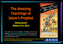 The Amazing Teachings of Islam’s Prophet Mohammed’s Believe It or Else! This slide show and the additional information and text was adapted by Charles Welty for Davidson Press from the comic book by Dr. Abdullah Aziz. The printed comic book is not distributed or published by Davidson Press. Visit http://davidsonpress.com/islam to read this comic book on line. Permission is granted by the author to duplicate and present this slide show worldwide. Note to the Teacher and Students • This PowerPoint™ slide show has been prepared to enable you to teach your own study class based on Mohammed’s Believe It or Else! by Abdullah Aziz using the included Speaker’s Notes. • Although there is a copyright on this presentation, the author grants you the right to copy the Speaker’s Notes and to teach this slide show to the public. 2 Tips on Navigation • Use the navigation buttons in the lower right corner to move through the slide presentation. Home (Title Page) Back One Slide Return to Previous Slide Forward One Slide • When a Qur’an or Hadith reference is cited, the following slide will contain the full text of all of the references so they can be read easily by the members of your study. 3 Table of Contents (1 of 4) • The Holy Books of Islam • What is a Hadith? • The Two Collections of Hadiths • Importance of the Hadith • What Drives the Hadith? • A Working Assumption • “Salvation” in Islam • Mohammed’s Believe It or Else! • • • • • • Introduction Allah’s Monkey Men Jewish Rats and Pigs Mohammed’s Inspiration A Test of Prophethood The Seal of Prophethood 4 Table of Contents (2 of 4) • The Giant She-Camel • The Champions of the Cave • The Man Who Died for 100 Years • A 90-Foot Adam • No Dogs or Cats • Satan Stays in the Nose Overnight • Playing Chess is Forbidden • Non-Muslims Have Seven Intestines • Don’t Pray Looking Up • The Wondrous Wings of a Fly • The Qur’an Forgotten • The Setting of the Sun 5 Table of Contents (3 of 4) • • • • • • • Mohammed Was Bewitched Mohammed Had Head Lice Drinking Camel Urine The Crying Palm Tree The Fingers of Life The Shouting Food Allah’s Hammer • The Angel with 600 Wings • If You Sleep During Prayers, Satan Pees in Your Ear • No Garlic or Onions • Yawning Is from Hell • Hell-Fire for Women • No Assurance of Salvation 6 Table of Contents (4 of 4) • What Made the Prophet Afraid? • Healing Palm Leaves • What Color Was Mohammed’s Skin? • Allah’s Prophet Uncovered • What Color Was Mohammed’s Hair? • Learn the Basics of God’s Law • Aisha the Child Bride • The Racist Prophet and the Ethiopians • Gabriel Opens Mohammed’s Chest • What You Need to Know About Islam • What Must I Do to Be Saved? 7 The Holy Books of Islam • Islam has two “inspired” written texts. – The Qur’an • Recited by Mohammed 8 The Holy Books of Islam • Islam has two “inspired” written texts. – The Qur’an • Recited by Mohammed – The Hadith • Over a dozen volumes of written commentaries on the Qur’an. • Includes much historical information not found in the Qur’an. • Deemed as authoritative as the Qur’an by Muslim scholars. 9 What is a Hadith? • A tradition or collection of traditions of Mohammed. – Includes his sayings and deeds. – Sometimes used as a synonym of sunna. • As a discipline, consists of 2 branches. – Validation through chain of authority (isnad). – Validation through content (matn). • Two collections: Sunni and Shiite 10 The Two Collections of Hadiths • Sunni scholars recognize… – Bukhari collections – Abu Dawud, Tirmidhi, an-Nassi, and Ibn Maja collections • Shiite scholars recognize… – Collections through Ali’s family – Al-Kulini, al-Babuya, al-Qummi, al-Tusi collections. 11 The Importance of the Hadith • The Hadith is to be considered as authoritative as the Qur’an. • Dr. Mohammed Hamidullah says, “The custodian and repository of the original teachings of Islam… [are found] above all in the Qur’an and the Hadith.”1 “The Qur’an and the Hadith… are the basis of all [Islamic] law.”2 1Introduction to Islam, page 250. 2Ibid., page 163. 12 The Importance of the Hadith • Dr. Mohammed Hamidullah also says Muslims revere the Hadith as well as the Qur’an because: “The Hadith is as divinely inspired as the Qur’an itself. The teachings of Islam are based primarily on the Qur’an and the Hadith, and, as well shall presently see, both are based on divine inspiration.”1 1Introduction to Islam, page 23. 13 The Importance of the Hadith • Muslim writers such as Hammudullah Abdalatati says the Hadith is considered the Second Source of Islam: “All the articles of faith… are based and derived from the teachings of the Qur’an and the Traditions (Hadith) of Mohammed.”1 • Thus it is no surprise that the Hadith is inspired and authoritative to “orthodox” Muslims. 1Islam in Focus, (Singapore: The Muslim Converts’ Association of Singapore, 1991), page 21. 14 The Importance of the Hadith • The Hadiths contain much information about preIslamic Arabic which is not found in the Qur’an. – For example, Vol. 3, #65 and Vol. 5, #53, tell us there were 360 idols as the Ka’bah when Mohammed conquered it. • The Hadith contains intricate details and in what way various Islamic rituals and laws are to be carried out. 15 What Drives the Hadith? • The driving force behind the Hadith is the question... “What must I do to be forgiven by Allah and to be admitted to paradise?” • In the Hadith, Mohammed does not give vague generalities to the reader. • He tells the reader exactly what to do, how to do it, and in what order to do it. 16 A Working Assumption • Without Allah’s forgiveness, no one may enter Paradise. • Hell fire awaits those who do not gain Allah’s favor. • To gain Allah’s acceptance is not easy. • One must earn Allah’s forgiven
