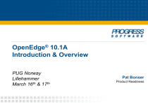 OpenEdge® 10.1A Introduction & Overview PUG Norway Lillehammer March 16th & 17th Pat Bonser Product Readiness What is OpenEdge 10 Anyway? A roadmap for how applications will be defined, developed, deployed, managed and integrated A project involving 4 application development strategies • • • • Advanced business logic capabilities Integration capabilities User interface independence Database capabilities An initiative to bring SOA concepts to reality March 2006, PUG Norway 2 © 2006 Progress Software Corporation OpenEdge 10 Roadmap for SOA Focus on Enablement March 2006, PUG Norway Focus on Productivity Focus on Best Practices 3 © 2006 Progress Software Corporation OpenEdge 10 Delivery Concept For Any Capability… Start by Making It Possible Work on Making it Easier Then Automate It March 2006, PUG Norway 4 © 2006 Progress Software Corporation OpenEdge Phasing and Objectives OpenEdge 10 For Any Capability… Phase I: Start by Making It Possible OpenEdge 10.0A OpenEdge 10.0B Phase II: Work on Making it Easier OpenEdge 10.1A Phase III: Then Automate It The Future March 2006, PUG Norway 5 © 2006 Progress Software Corporation OpenEdge Phasing and Objectives OpenEdge 10 For Any Capability… Phase I: Start by Making It Possible OpenEdge 10.0A OpenEdge 10.0B Phase II: Work on Making it Easier OpenEdge 10.1A Phase III: Then Automate It The Future March 2006, PUG Norway 6 © 2006 Progress Software Corporation OpenEdge 10.1x: Emphasis on Productivity Core services for business applications Tools for Business Logic Improvements in language productivity Continued emphasis on Web services Tools for Service Interface generation Enhanced integration with Sonic Renewed emphasis on thin client Increased Open Client capabilities Enhanced UI capabilities Performance, performance, performance Availability, scalability, reliability Continued growth of SQL March 2006, PUG Norway 7 © 2006 Progress Software Corporation OpenEdge 10.1A OpenEdge® Architect Object-Oriented Extensions to the 4GL (ABL) Core Business Services – Auditing for OpenEdge® Language & UI XML ProDataSets Consuming Web services Open Client OpenEdge Connectivity to SonicMQ® OpenEdge® RDBMS OpenEdge® SQL Platforms & 64bit Support Packaging & Installation Diagnostics & Logging March 2006, PUG Norway 8 © 2006 Progress Software Corporation OpenEdge Architect Simplifies Designing, Developing, and Testing Open Edge Architect is an integrated development environment tailored for building applications using an architected, business-logic centric approach March 2006, PUG Norway 9 © 2006 Progress Software Corporation OpenEdge Architect Fundamentals Tool Eclipse Open Source Platform Tool Tool March 2006, PUG Norway 10 © 2006 Progress Software Corporation Key Contents of OpenEdge Architect Project Based Development DB Navigator Meta Catalog T4BL (Tools for Business Logic) OpenEdge Architect Meta Catalog Database Navigator Services March 2006, PUG Norway 11 © 2006 Progress Software Corporation OpenEdge Architect Meta Catalog Supports developers in analyzing the impact of code changes - how code is related to other code Focuses on the needs of developers navigating large amounts of code making up a complex application Provides significant productivity benefits to developers in their day-to-day work March 2006, PUG Norway 12 © 2006 Progress Software Corporation What are T4BL ? Tools for Business Logic Visual design tools for the development of business objects • Business objects that represent data elements and business logic that provide application functionality Tools to model business objects which can be used to generate ABL application code • Using T4BL component models – ABL code can generated which can then be used/reused in OpenEdge applications Supports the OpenEdge Reference Architecture March 2006, PUG Norway 13 © 2006 Progress Software Corporation Code/Model Development Accommodate a wide range of development styles Code written by hand can easily be transformed into visual model components Text/Code Oriented Visual/Graphically Oriented Code-centric Model-centric Code/Model Development Model components can be visually edited and the code elements will reflect the change March 2006, PUG Norway 14 © 2006 Progress Software Corporation Code/Model Round Trip Code can be created or edited at any time Code is not dependent on a model DEFINE TEMP-TABLE ttCust LIKE Customer. DEFINE TEMP-TABLE ttOrder LIKE Order. DEFINE TEMP-TABLE ttOrdlin LIKE OrderLine. DEFINE DATASET CustOrdLin FOR ttCust,ttOrder,ttOrdlin DATA-RELATION Customer_Order FOR ttCust,ttOrder RELATION-FIELDS (CustNum,CustNum) DATA-RELATION Order_OrderLine FOR ttOrder,ttOrdlin RELATION-FIELDS (OrderNum, OrderNum). DEFINE INPUT PARAMETER NumCusts AS INTEGER. DEFINE OUTPUT PARAMETER DATASET FOR CustOrdLin. DEFINE OUTPUT PARAMETER sError AS CHARACTER. DEFINE DATA-SOURCE srcCust FOR Customer. DEFINE DATA-SOURCE srcOrder FOR Order. DEFINE DATA-SOURCE srcOline FOR Orderline. BUFFER ttCust:ATTACH-DATA-SOURCE(DATA-SOURCE srcCust). BUFFER ttOrder:ATTACH-DATA-SOURCE(DATA-SOURCE srcOrder). BUFFER ttOrdlin:ATTACH-DATA-SOURCE(DATA-SOURCE srcOline). ttCust Code elements can be transformed into model elements at any time ttOrderLin CustNum:INTEGER CustName:CHARACTER Contact:CHARACTER Country:CHARACTER OrderNum:INTEGER LineNum:INTEGER ItemNum:INTEGER Qty:DECIMAL 1 N ttOrder N OrderNum:INTEGER CustNum:INTEGER OrderDate:DATE ShipDate:DATE 1 BUFFER ttCust:BATCH-SIZE = NumCusts. March 2006, PUG Norway Models create structure and code that can be edited Based on Templates and Rules 15 © 2006 Progress Software Corporation Business Logic Tool Set Component Designer • Graphical editor • Used to create and edit components Application Schema Explorer • Provides a view to efficiently locate building blocks • Promotes reuse of code March 2006, PUG Norway 16 © 2006 Progress Software Corporation 3rd Party Plug-ins Over 300 plug-ins available today • Provides vast array of customi