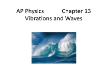 AP Physics Chapter 13 Vibrations and Waves Chapter 13: Vibrations and Waves 13.1 13.2 13.3 13.4 13.5 Simple Harmonic Motion Equations of Motion Wave Motion Wave Properties Standing Waves and Resonance Homework for Chapter 13 • Read Chapter 13 • HW 13.A : pp.447-448: 8,9,11,12,15,16,17,20,31-38, 41,42. • HW 13.B: pp 449-450: 51, 52, 54, 55, 58, 60, 62, 64, 71, 76 – 80. 13.1: Simple Harmonic Motion Warmup: Good Vibrations Physics Warmup #114 The source of all waves is a vibrating object. ********************************************************************************************* Complete the table below by identifying the source of each wave described. Wave Source A tuning fork is struck with a rubber hammer, producing a sound wave. the vibrating tuning fork A motorboat moves through the water, leaving its wake behind. the propeller blades A performer sings a high note. A light bulb gives off light. vocal cords vibrating electrons 13.1: Simple Harmonic Motion • The motion of an oscillating object depends on the restoring forces that make it go back and forth. • The simplest type of restoring force is a spring force. Hooke’s Law: Fs = -kx where k is the spring constant and x is the displacement • The negative sign indicates that the force is opposite to the displacement from the springs relaxed position. • Motion under the influence of the type of force described by Hooke’s Law is called: simple harmonic motion (SHM) • It is called harmonic because the motion can be described by sines and cosines. 13.1: Simple Harmonic Motion Fig 13.1, p. 420. A block on a spring undergoes simple harmonic motion. a) The block is at the equilibrium position, x = 0. a) The force of a hand, Fh, pulls the block for a displacement of x = A. The force of the spring is Fs. • At the time of the release, t = 0. • The time it takes to complete one period of oscillation is T. c) At t = T/4, the block is back at the equilibrium position. d) at t = T/2, the block is at x = -A. e) During the next half of the cycle, the motion is to the right. f) At t = T, the object is back at its starting position. 13.1: Simple Harmonic Motion displacement - the distance of an object, including direction ( x), from its equilibrium position. amplitude (A) - the magnitude of the maximum displacement of a mass from its equilibrium position. period (T) - the time needed to complete one cycle of oscillation. frequency (f) - the number of cycles per second. • frequency and period are related by: f= 1 T • The SI unit of frequency is 1/s, or hertz (Hz). This is also known as cycles per second. 13.1: Simple Harmonic Motion The Energy and Speed of a Spring-Mass System in SHM Recall from Chapter 5, the total potential energy stored in a spring is: U = ½ kx2 On Gold Sheet The total kinetic and potential energies of a spring-mass system is equal to its total mechanical energy. E = K + U = ½ mv2 + ½ kx2 At a point of maximum displacement, (-A or +A), the instantaneous velocity is zero. Therefore all the energy at this point is potential. E = ½ m(0)2 + ½ k( A) 2 Simplifying, the total energy in SHM of a spring: E = ½ kA2 **Energy is proportional to the square of the amplitude** 13.1: Simple Harmonic Motion Example 13.1: A 0.50 kg object is attached to a spring of spring constant 20 N/m along a horizontal frictionless surface. The object oscillates in simple harmonic motion and has a speed of 1.5 m/s at the equilibrium position. a) What is the total energy of the system? b) What is the amplitude? c) At what location are the values for the potential and kinetic energies the same? 13.1: Simple Harmonic Motion Example 13.2: An object is attached to a spring of spring constant 60 N/m along a horizontal, frictionless surface. The spring is initially stretched by a force of 5.0 N on the object and let go. It takes the object 0.50 s to get back to its equilibrium position after its release. a) What is the amplitude? b) What is the period? c) What is the frequency? 13.1: Simple Harmonic Motion: Check for Understanding 1. A particle in SHM: a. has variable amplitude b. has a restoring force in the form of Hooke’s Law c. has a frequency directly proportional to its period d. has its position represented graphically by x(t) = at + b Answer: b 13.1: Simple Harmonic Motion: Check for Understanding 2. The maximum kinetic energy of a spring-mass system in SHM is equal to: a. A b. A2 c. kA d. kA2/2 Answer: d 13.1: Simple Harmonic Motion: Check for Understanding 3. If the amplitude of an object in SHM is doubled: a. how is the energy affected? b. how is the maximum speed affected? Answer: a. Since E = ½kA2, the energy is four times as large. b. Since vmax = k m A , the maximum speed is twice as large. 13.1: Simple Harmonic Motion: Check for Understanding 4. If the period of a system in SHM is doubled, its frequency is: a. doubled b. halved c. four times as large d. one-quarter as large Answer: b, because f = 1/T 13.1: Simple Harmonic Motion: Check for Understanding 5. When a particle in SHM is at the equilibrium position, the potential energy of the system is: a. zero b. maximum c. negative d. none of the above Answer: a, because U = ½ kx2 13.2: Equations of Motion Warmup: Famous Scientists II Physics Warmup #153 Men and women are still making discoveries that totally change our ideas about certain areas of science, revise our theories, and in some cases, abandon centuries-old explanations. Most of those making the discoveries had no idea where technology would take their new found knowledge. Such was the case with Ernest Rutherford, Neils Bohr, and Enrico Fermi and their contributions toward our understanding of the atom. ********************************************************************************************* Solve this anagram to identify a famous scientist not mentioned. sent elite brain 13.2: Equations of Motion Simple Harmonic Motion can be defined using a reference circle as follows: “If a particle is undergoing uni