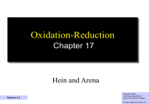 Oxidation-Reduction Chapter 17 Hein and Arena Version 1.1 Eugene Passer Chemistry Department 1 College Bronx Community © John Wiley and Sons, Inc. Chapter Outline 17.1 Oxidation Number 17.2 Oxidation-Reduction 17.4 Balancing Ionic Redox Redox Equations 17.5 Activity Series of Metals 17.3 Balancing OxidationReduction Equations 17.6 Electrolytic and Voltaic Cells 2 Oxidation Number 3 The oxidation number (oxidation state) of an atom represents the number of electrons lost, gained, or unequally shared by an atom. 4 Oxidation numbers can be zero, positive or negative. 5 An oxidation number of zero means the atom has the same number of electrons assigned to it as there are in the free neutral atom. 6 A positive oxidation number means the atom has fewer electrons assigned to it than in the neutral atom. 7 A negative oxidation number means the atom has more electrons assigned to it than in the neutral atom. 8 The oxidation number of an atom that has gained or lost electrons to form an ion is the same as the positive or negative charge of the ion. NaCl The charge oxidation Sodium has lost The on number sodium is +1. an electron . of sodium is +1. The Chlorine oxidation has The charge on number gained an of chlorine is –1. chlorine electron. is -1. 9 In covalently bonded substances, oxidation numbers are assigned by an arbitrary system based on relative electronegativities. 10 For symmetrical covalent molecules each atom is assigned an oxidation number of 0 because the bonding pair of electrons is shared equally between two like atoms of equal electronegativity. Oxidation Electronegativity Number 2.1 0 Oxidation Electronegativity Number 2.1 0 11 For symmetrical covalent molecules each atom is assigned an oxidation number of 0 because the bonding pair of electrons is shared equally between two like atoms of equal electronegativity. Oxidation Number Electronegativity 0 3.0 Oxidation Number Electronegativity 0 3.0 12 When the covalent bond is between two unlike atoms, the bonding electrons are shared unequally because the more electronegative element has a greater attraction for them. Oxidation Number Electronegativity +1 2.1 there is a partial after assignment hydrogen unequal shared electron pair of transfer of an has one lesssharing electron than electrons electron to chlorine neutral chlorine Oxidation Number Electronegativity -1 3.0 after assignment chlorine both shared electrons one to more electron arehas assigned chlorine than neutral chlorine 13 Many elements have multiple oxidation numbers N oxidation number N2 N2O NO N2O3 NO2 N2O5 NO-3 0 +1 +2 +3 +4 +5 +5 14 15 16 Rules for Determining the Oxidation Number of an Element Within a Compound Step 1 Write the oxidation number of each known atom below the atom in the formula. Step 2 Multiply each oxidation number by the number of atoms of that element in the compound. Step 3 Write an expression indicating the sum of all the oxidation numbers in the compound. Remember: The sum of the oxidation numbers in a compound must equal zero. 17 Determine the oxidation number for sulfur in sulfuric acid. H2SO4 Step 1 +1 Step 2 2(+1) = +2 Step 3 -2 4(-2) = -8 +2 + S + (-8) = 0 Step 4 S = +6 (oxidation number for sulfur) Write an Multiply expression oxidation indicating numberthe by sum the number ofknown all the of theeach oxidation number of each atoms oxidation of that numbers element in the ininthe compound. compound. atom below the atom the formula. 18 Determine the oxidation number for sulfur in sulfuric acid. Step 1 Step 2 Step 3 24 C2O -2 4(-2) = -8 2C + (-8) = -2 (the charge on the ion) Step 4 2C = +6 C = +3 (oxidation number for sulfur) Write an Multiply expression oxidation indicating numberthe by sum the number ofknown all the of theeach oxidation number of each atoms oxidation of that numbers element in the ininthe compound. compound. atom below the atom the formula. 19 Oxidation-Reduction 20 Oxidation-reduction (redox) is a chemical process in which the oxidation number of an element is changed. 21 Redox may involve the complete transfer of electrons to form ionic bonds or a partial transfer of electrons to form covalent bonds. 22 • Oxidation occurs when the oxidation number of an element increases as a result of losing electrons. • Reduction occurs when the oxidation number of an element decreases as a result of gaining electrons. • In a redox reaction oxidation and reduction occur simultaneously, one cannot occur in the absence of the other. 23 • Oxidizing agent The substance that causes an increase in the oxidation state of another substance. – The oxidizing agent is reduced in a redox reaction. • Reducing agent The substance that causes a decrease in the oxidation state of another substance. – The reducing agent is oxidized in a redox reaction. 24 The reaction of zinc with sulfuric acid is a redox reaction. Zn(s) + H2SO4(aq) → ZnSO4(aq) + H2(g) Hydrogen Zinc Hydrogen Zinc transfers Hydrogen accepts Zinc is the is electrons the isreducing oxidized. electrons is oxidizing reduced. toagent. hydrogen. from agent. zinc. The electron transfer is more clearly expressed as o + 24 Zn + 2H + SO Zn 2+ 24 o 2 + SO + H 25 26 17.1 Balancing OxidationReduction Equations 27 Change-In-Oxidation Number Method 28 Balance the equation Sn + HNO3 → SnO2+ NO2+H2O Step 1 Assign oxidation numbers to each element to identify the elements being oxidized and those being reduced. Write the oxidation numbers below each element to avoid confusing them with ionic charge. Sn + HNO3 → SnO2 + NO2 + H2O 0 +1 +5 -2 +4 -2 +4 -2 +1 -2 oxidation number of tin increases oxidation number of nitrogen decreases 29 Balance the equation Sn + HNO3 → SnO2+ NO2+H2O Step 2 Write two new equations, using only the elements that change in oxidation number. Then add electrons to bring the equations into electrical balance. Sno → Sn4+ + 4e4N5+ + 1e- → N4+ 30 Balance the equation Sn + HNO3 → SnO2+ NO2+H2O Step 3 Multiply the two equations by the smallest whole numb
