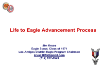 Life to Eagle Advancement Process Jim Kruse Eagle Scout, Class of 1971 Los Amigos District Eagle Program Chairman kruse1016@gmail.com (714) 287-0943 Agenda • • • • • • Introductory Remarks What does it mean to be an Eagle Scout? What role should parents play? BSA requirements for Eagle rank Eagle Scout leadership service project Q & A and discussion Introductory Remarks • Earning the rank of Eagle Scout is a special accomplishment. Only around 4-5% of Scouts earn this distinction each year. • Over 2 million American Boy Scouts have earned the Eagle Rank since 1912. • Famous Eagle Scouts include: – – – – – – Gerald Ford, 38th President of the USA Neil Armstrong, first man to walk on the moon Michael Bloomberg, Former Mayor of New York City Stephen Spielberg, Film Director and Producer J. W. Marriott, President, Marriott Corporation Bill Bennett, former Secretary of Education What does it mean to be an Eagle Scout? There are two parts to the Eagle Scout rank: • Requirements of the rank – • “checking off the boxes” Philosophy of the rank – – – – Adopting the Scout Oath and Scout Law as your personal ethic, a “code to live by” Achieving Eagle Scout transcends the idea of “rank” and speaks to how you intend to live your life Making Eagle to get into college or get a better job should not be your reasons for seeking this rank Becoming a man of character should be your goal What role should parents play? • Parents should: – – – – – • Ensure your son completely reviews the OCC Life to Eagle packet. Encourage your son to pick a project that meets his abilities and interests. Provide encouragement and timely reminders, as necessary. Provide technical assistance, transportation, tools, materials, and limited labor. Discuss problems and suggest solutions. Parents should not: – – – Push your son into a project he doesn’t like. Do any of the planning or the writing. Take over your son’s project to ensure success. BSA requirements for Eagle rank 1. Be active in your troop and patrol for at least six months as a Life Scout. 2. Demonstrate Scout spirit by living the Scout Oath (Promise) and Scout Law in your everyday life. 3. Earn at least 21 Merit Badges (including the 13 Eagle-required MBs) 4. While a Life Scout, serve actively for a period of six months in one or more of positions of responsibility. 5. While a Life Scout, plan, develop, and give leadership to others in a service project helpful to any religious institution, any school, or your community. 6. Take part in a Unit Leader Conference. 7. Successfully complete an Eagle Scout board of review. NOTE: First six requirements must be completed prior to the Scout’s 18th birthday. No Council, District, Unit or Individual has the authority to add to or subtract from any BSA advancement requirement. Completing the Eagle Application • Obtain and complete the most recent Eagle Scout Rank Application from the Council website – Contact the Council to obtain your Scouting and Advancement history records. – All dates for advancement, merit badges etc. must match council records. If discrepancies exists, work with the unit advancement chairman to get them corrected. • Provide five or six references who know you personally and can attest that you live by Scout Oath and Law. • Compose a one to two page Statement of Life Purpose • Review completed application with your advisor • Sign application and obtain signature of the Unit Leader and Committee Chairman #1 – Be active in your unit for at least 6 months as a Life Scout • 3 sequential tests to determine if requirements has been met: – Scout is registered – Scout is in good standing (not dismissed for disciplinary reasons) – Scout meets the unit’s reasonable expectations; or if not, a lesser level of activity is explained (other positive endeavors) • Discuss the concept of “active” with your Unit Leader and come to an agreement. • Being active will enhance your ability to demonstrate Scout Spirit. #2 – Demonstrate Scout Spirit • “Scout Spirit” is simple in concept: “Live by the Scout Oath and Law in your everyday life. – Honor your God and your country. – Extend your helping hand to others. – Steadfastly improve yourself in body, mind, and principle. – Live the 12 points of the Scout Law • Ultimately, the decision to recommend a Scout for Eagle rank will be based on evidence of Scout Spirit. – Unit Leader signs off on this important component. – The Eagle application asks for references who know the Scout personally and can attest that he lives by the principles of the Scout Oath and Law. – The Eagle Board of Review will confirm that you show “Scout Spirit” #3 – Earn a total of 21 merit badges • 13 required merit badges – First Aid Communications – Citizenship in the Community Citizenship in the Nation – Citizenship in the World -- Family Life – Personal Fitness Emergency Preparedness or Lifesaving --Personal Management -- Cooking – Swimming or Hiking or Cycling --Camping – Environmental Science or Sustainability • Some required merit badges (italicized in red) have mandatory time periods and should not be delayed. • Merit badges earned beyond the 21 required MAY qualify for Eagle Palms. • Keep records on merit badges earned – – • Retain Scout portion of each blue card in sports card holders Periodically compare blue card records to troop and council records, and act immediately to correct discrepancies There are special exceptions for Scouts with disabilities #4 – While a Life Scout, serve actively for a period of six months in one or more positions of responsibility: • Discuss the term “serve actively” with your Unit Leader and come to an agreement. • All Life Scouts must obtain Unit Leader approval before taking a leadership position. • Time carried on the unit records in the position is all that may be required. • Scout d