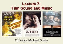 Lecture 7: Film Sound and Music Professor Michael Green Previous Lecture • What is Film Editing? • The Dimensions of Film Editing • Continuity Editing • Discontinuity Editing and Breathless 2 This Lecture • A Brief History of Sound • The Three Components of Film Sound – Dialogue – Sounds Effects – Music • The Relationship between Sound and Image 3 A Brief History of Sound The Jazz Singer (1927) Directed by Alan Crosland Lesson 7: Part I 4 “Silent” Films • Contrary to popular opinion, movies were never “silent.” • Though early films were not accompanied by a soundtrack as we know it today, they were often accompanied by a variety of sounds, including live narration, organs and sounds effects machines. • Some early films such as Birth of a Nation had their own scores and were sometimes exhibited in tandem with a live orchestra. 5 Synchronized Sound • In the beginning there was no recorded sound to synchronize with the image, though innovators worked to synchronize pre-recorded sound with images for decades. • In the late 1920s, Vitaphone’s “sound-ondisc” system was developed, a process in which sound was recorded and played on separate discs. 6 Standardizing Sound • By 1929, 75% of Hollywood films included pre-recorded sound. • By 1930, studios had agreed on a standardized sound technology, with soundon-film systems replacing sound on-disc. 7 Other Negative Effects of Sound • The high cost of sound film hit independent producers particularly hard because it became more difficult to compete with betterfinanced, vertically-integrated studios. • For example, Oscar Micheaux, one of the most important black independent filmmakers, tried to compete with his own sound productions but lost his audiences – even African Americans – to studios. 8 Post-Synchronization • In the late 1930s, the practice of re-recording, or postsynchronization, freed sound from the idea that everything seen on the screen must be heard on the soundtrack. • Re-recording allowed filmmakers to manipulate sound and to experiment with the relation of sound to image. 9 The Freedom of Independence • Now almost all commercial films, even those whose aim is realistic depiction of conversation, use dialogue recorded in post-production. • The freedom engendered by post-synchro has allowed filmmakers to transform film sound into a vital component of cinematic expression, completely independent of, and at times more weighty than, a film’s visual information. 10 Sound Technology • Repeatedly, advances in film sound technology – such as multi-channel soundtracks, surround sound, multi track recording, and Dolby noise reduction – have promised greater fidelity and a heightened sense of audio realism. 11 Sound in Contemporary Film • Today, film sound is digitally recorded and edited, and it is often created digitally. • In fact, film sound went digital long before film images did. • As recently as the 1980s, it was common for a film’s soundtrack to be put together from 20 tracks of sound elements. • Today a soundtrack of 200 or more tracks is the norm. 12 Tremendous Variety • In earlier decades, scenes that had repetitive sounds – such as guns firing– often sounded flat because the sound was not varied. Today, these effects are given great variation. • In Spiderman 2, 100 separate tracks made up the sound of Doc Ock’s tentacles alone. Spiderman 2 (2004) Directed by Sam Raimi 13 Enjoying a Total Sonic Experience “Sound in cinema has never been better than in the contemporary period. One cannot make similar claims for cinematography, editing, or many other elements of cinema structure. In this regard, sound is making a uniquely improved aesthetic contribution to cinema. Viewers today are privileged to enjoy a total sonic experience that was not available to moviegoers in earlier periods.” – Stephen Prince, “Principles of Sound Design” 14 The Three Components of Film Sound The Piano (1993) Directed by Jane Campion Lesson 7: Part II 15 What Makes up Film Sound? • The three components that make up film sound are: – – – Dialogue (speech and voice-over narration) Sound effects Music (diegetic and non-diegetic) • To illustrate movie sound, we will use the • Oscar-winning New Zealand film The Piano (1993), directed by Jane Campion. As you watch the film, pay attention to how the three components work together. 16 Dialogue • Since synchronous sound became a feature • • of the movies, two primary kinds of dialogue have been employed in the cinema. Speech is delivered by characters on screen usually in conversation with one another. Voice-over narration typically is provided by an omniscient, detached narrator or by a character in the story, usually reflecting back on the events on screen. 17 Functions of Dialogue • Dialogue forwards the narrative, giving • voice to the character’s aspirations, thoughts and emotions, often making conflicts among the characters evident. Dialogue plays an important role in establishing character. It can also be used to emphasize setting or a character’s cultural background, age, class, education, and so on. Watch clip #1 from The Piano. 18 Sound Qualities of Dialogue • The human voice has four qualities that invest words with depth: – – – – Volume Pitch Speech characteristics Acoustic qualities My Dinner with Andre (1981) Directed by Louis Malle 19 Volume • Volume reflects the level • • and the type of a person’s engagement with her surroundings. Generally the volume of dialogue suggests the emotional vigor. Consider Marlon Brando’s famous impassioned cry of “Stella!” A Streetcar Named Desire (1951) Directed by Elia Kazan 20 Pitch • A sound’s pitch refers to its • frequency, or its position on a musical scale. In music, the lowest (or deepest) pitch is bass and the highest pitch is soprano. Pitch is often associated with character – Darth Vader’s deep voice si