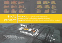 FINAL PROJECT Case Study Paul L Cejas School of Architecture Content Research, Renovation Solutions, Program Designers Alexandra Fernandez, Andrea Moreno, Desiree Vazques “This extraordinary building will be a landmark on our campus, it’s imaginative, it’s unique and will attract visitors to the university and Miami-Dade County”. -President Modesto Maidique CONTENTS INTRODUCTION 1 COVER PAGE 2 TABLE OF CONTENTS TABLE OF CONTENTS PART 1 - RESEARCH 9 PROJECT DETAIL overview, objectives and methods needed resources and deliverables 3 BUILDING IDENTIFICATION background information areas of study 5 USER IDENTIFICATION 6 SYSTEM IDENTIFICATION statement of problems statement of successes solutions and goals 12 RESOURCES AND PART 2 - RENOVATION SOLUTIONS 20 RENOVATIONS level 1 level 2 level 3 PART 3 - PROGRAM 13 PROGRAM SHEETS gallery room 140 pin-up room 241 multi-purpose room 240 pin up room 341 17 PROGRAM SPECIFICATIONS REFERENCES 23 RESEARCH REFERENCES 24 FIGURE REFERENCES 2 Background Information Areas of study RESEARCH / BUILDING IDENTIFICATION Building Information Building name Designed by Project Architect Design group Location Year designed Year completed Size Client Total cost Paul L. Cejas School of Architecture Building Bernard Tschumi Architects and BEA International Anne Save de Beaurecueil Over 30 architects, 10 engineers, 1 landscape architect and a couple construction managers 11200 SW 8th St., Miami, FL, 33199 2000 2003 102,000 square-ft FIU School of Architecture $16,000,000.00 Brief Synopsis Not only was the design selected from a competition, but some of the participating designers are affiliated with or part of FIU faculty and staff. The new building had to create an identity and act as a generator, activating spaces as well as defining them (Santana). The Paul Cejas School of Architecture building is compromised of 5 individual buildings interconnected by walkways and bridges which displays the idea of flowing energy. The complex has two linear pre-cast concrete wings, which are intended to evoke a feeling of sobriety. They border an event-oriented courtyard that is activated by exuberantly colored polygonal generators that are clad in bright yellow, orange and red tiles (Santana). The generator on the west side of the complex contains a lecture hall, while the east side generator, which is awaiting the renovation plans, encloses an art gallery(140), reading room(240), and review/crit rooms (241,341). 3 Background Information Areas of study RESEARCH / BUILDING IDENTIFICATION Areas of Study The exuberant generator that encompasses the gallery, multipurpose room and 2 critique rooms, is currently under study and being funded for renovation. It has three levels, and is clad in bright yellow and light orange tiles. The west façade of each room has a glass wall that extends from floor to ceiling. The west , north and south sides have irregular angles and rectangular glass windows. The spaces for possible renovations that we will be focusing on are: Gallery Space Multipurpose Room Crit Rooms 1) GALLERY / Room 140 • large 2 story room • located on the first floor • displays student work produced throughout the school semesters • occasionally holds meetings and exhibitions • visitors, prospective students and guests of students take tours throughout this space 2) MULTI-PURPOSE ROOM / Room 341 • entrance is located on the second floor • interior space extends to the third level • complex space • serves multiple functions • holds meetings, exhibitions, project presentations and “pin-ups” • some classes are even held in this space due to size and lighting. • numerous types of occupants 3) CRITIQUE ROOMS / Room 240 & 340 • “pin-up rooms” • where students display their semester work per project • work is evaluated by their teachers or third-party panel • students conduct presentations and await criticism from the panel • when pin-ups are not in progress, students use these rooms to do work • individuals use these rooms to minimize interruption • groups use them to work on group projects in isolation 4 RESEARCH / USER IDENTIFICATION Users Occupants that use these spaces are common amongst all three spaces, what varies is the amounts and the time of day. Amount of occupants change because of the function and/or size of the room, while the time of day effects the use of the room due to natural restrictions (e.g. amount of accumulated) heat or typical schedule use of that room per day (e.g. busy during studio there may be a pinup going on, or A/C is shut off). 1) GALLERY / Room 140 • used the least amount of times per day • It has occupants that come in to view the work and immediately leave • prospective students along with their families that are participating in a tour • administrative personnel that serve as tour guides • students viewing work on display (whether its their work or a classmates) •any guests of the students as well as outside visitors • teachers viewing student’s work • faculty members 2) MULTI-PURPOSE ROOM / Room 341 • this space is used many time throughout the day • teachers conducting classes • students using the room for meetings or group work • stakeholder meetings • faculty and administrative personnel holding meetings and gatherings • student organization members • any other affiliates having presentations or exhibitions 3) CRITIQUE ROOMS / Room 240 & 340 • are used by a couple occupants at many times throughout the day • students doing their own personal work • groups of students participating in group work • teachers and classes for critique and evaluation sessions • critique panel may also include other students, faculty and members from other schools 5 Statement of problems Statement of successes RESEARCH / SYSTEM IDENTIFICATION Statement of Problems These three spaces that are considered for renovation pose a number of issues, generally stated as follows: 1) LIGH