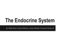 The Endocrine System By: Meklit Daniel, Camya Robinson, Jordan Montalbo & Vanessa Ruales 4A The Endocrine System ● Endocrine system and nervous system work together to help regulate activities of the other systems ● Both use chemical signals when responding to changes that may threaten homeostasis ● Different ways of delivering signals Endocrine System Endocrine vs Nervous System Endocrine ● Composed of glands ● Hormones secreted by glands into bloodstream to target cells ● Takes time to deliver hormones and for cells to respond ● Effect is longer lasting ● System organized for prolonged response Nervous ● Composed of neurons ● Sensory receptors detect changes in internal and external environment ● Communication dependent on nerve impulses ● Axon conduction rapidly occurs as well as neurotransmitter diffusion ● System organized to respond to stimuli quickly Evolution 3. D. 1. : Cell communication processes share common features that reflect a shared evolutionary history. ● Similarities between Endocrine and Nervous System: show closeness evolutionarily o have similar purposes: internal communication and regulation o function similarly: some nerve cells (neurosecretory cells) release hormones into the blood (neurohormones) Epinephrine (fight-or-flight response) is both a hormone and a neurotransmitter Nervous system increase or decrease secretions of specific hormones that affect day/night cycles and reproductive cycles o share same control pathways What are Hormones? ● Hormones are chemical messengers of the endocrine system. o They are peptides or steroids that influence the metabolism of their target cells. Affect endocrine glands. o Responsible for helping maintain homeostasis and regulating normal bodily functions. o Travel through the blood. Hormones Secretion ● Endocrine glands secrete hormones into surrounding fluid or bloodstream where they meet target cells ● Endocrine glands contrast with exocrine glands whose ducts carry secreted substances onto body surfaces or into body cavities ● Hormones maintain homeostasis; regulate growth, development, and reproduction Control Pathways 2. E. 2: Timing and coordination of physiological events are regulated by multiple mechanisms. Examples: menstrual cycle, secretion of leptin, thyroid hormone T4, insulin and glucagon, and melatonin; puberty (primary and secondary sex characteristics) Simple Endocrine Pathway Control Pathways ● ● Negative feedback: when an effector’s (hormone or neurotransmitter) response is inhibiting the initial stimulus, then the response stops o most common; e.g. dehydration in response to decreased ADH Positive feedback: when an effector’s response is to increase the stimulus and create an even larger response by other effectors o Example: Nursing baby suckles nipple, nerve cells stimulated: give message to hypothalamus (control center) Hypothalamus signals posterior pituitary gland to secrete effector, neurohormone oxytocin oxytocin causes the mammary glands to secrete milk: baby suckles more The pathway cycles again until baby is satisfied Control Pathways Effector’s response depends on type of hormone: ● Proteins and Peptides- small polypeptides w/ up to 30 amino acids ● Steroids-lipids; hydrophobic ● Amines- from amino acids Follow same signaling procedure: ● Reception: signal molecule binds to specific receptor protein inside or on target cell (cell that can recognize hormones) ● Signal Transduction: receptor protein being stimulated triggers events within cell ● Response: change in cell’s behavior o depending on target cell, may cause secretion or uptake of substance, activation of enzyme, rearrangement of cytoskeleton 3.D.3: Signal transduction pathways link signal reception with cellular response. Cell-surface receptors Intracellular receptors Receptor-Hormone Complex ● Cell surface receptor: embedded in plasma membrane ● Water-soluble ● Secreted by exocytosis, travel freely in bloodstream and bind to cell-surface signal receptors ● Causes changes in cytoplasmic molecules and sometimes gene transcription Receptor-Hormone Complex ● Water-soluble hormone to signal receptor protein triggers events at plasma membrane that result in cellular response ● Signal transduction pathway: Series of changes in cellular proteins that convert extracellular chemical signal to specific intracellular response Pathway for Water-Soluble Hormones Cell-Surface Receptor G-Protein Linked Receptors ● span plasma membrane ● works with G Protein o has two guanine nucleotides, GTP or GDP, attached ● used by many hormones for signal transduction: epinephrine 1. hormone signals receptor 2. receptor changes shape and binds G protein to it, activating it (GTP or GDP activate it) 3. G protein dissociates from receptor, finds enzyme and activates it: can lead to cellular response which hormone intended Cell-Surface Receptor Epinephrine to Glucose 1. Reception: Epinephrine (“first messenger”) binds to plasma membrane of liver cell, where Gprotein- linked receptor is located 2. Transduction (steps 2-5): Receptor signals G protein to use GTP in order to bind to enzyme adenylyl cyclase 3. Enzyme is signaled to convert ATP to cAMP 4. cAMP acts as “second messenger” and activates protein kinase A 5. Protein kinase A activates phosphorylase kinase , which activates glycogen phosphorylase 6. Result: Glycogen is broken down by glycogen phosphorylase into glucose Note: Each hormone can have many different effects, depending on the target cell. This is just one effect of epinephrine on the liver cell. ● also depending on species: thyroxine Cell-Surface Receptor Second Messengers: small ions and molecules that can continue control pathways started by hormones ● cAMP: epinephrine increases concentration of cAMP within cell o this pathway used for many other purposes than the ultimate breaking down of glycogen into glucose secretion of water from cells ● cGMP: signal