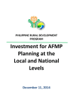 Philippine Rural Development Program Operations Manual PHILIPPINE RURAL DEVELOPMENT PROGRAM Investment for AFMP Planning at the Local and National Levels December 11, 2014 I-PLAN Component Philippine Rural Development Program Operations Manual Table of Contents i. ABBREVIATIONS AND ACRONYMS ................................................................................. 1 1 INTRODUCTION .............................................................................................................. 4 1.1 Operations Manual: Its Purpose and Audiences ........................................................ 4 1.2 Scope and Limitations ................................................................................................ 4 1.3 I-PLAN Component: General Description................................................................... 4 1.4 Background and Key Institutional Issues ................................................................... 5 2 THE I-PLAN COMPONENT .............................................................................................. 7 2.1 Objectives ................................................................................................................... 7 2.2 Expected Outcomes and Outputs .............................................................................. 7 2.3 Major Activities under I-PLAN .................................................................................. 11 2.3.1 Enhancing the AFMP Process .............................................................................11 2.3.2 Supporting AFMP Implementation ....................................................................12 2.4 Target Beneficiaries .................................................................................................. 12 2.5 Strategies .................................................................................................................. 12 2.6 Risks and Mitigation Measures in I-PLAN Implementation ..................................... 13 2.7 Social and Environmental Safeguards ...................................................................... 13 3 IMPLEMENTATION POLICIES ........................................................................................ 14 4 IMPLEMENTATION PROCESSES .................................................................................... 17 4.1 NAFMP/RAFMP Enhancements and PCIP Preparation ............................................ 17 4.1.1 Enhancing the National AFMP ...........................................................................17 4.1.2 Enhancing the Regional AFMP ...........................................................................23 4.1.3 Preparing the Provincial Commodity/ies Investment Plan................................28 4.1.4 Successor National and Regional AFMPs ...........................................................32 4.1.5 GEF Implementation ..........................................................................................32 4.2 Supporting AFMP Implementation .......................................................................... 32 4.2.1 Harmonization of DA’s Planning and Budget Process .......................................32 4.2.2 Planning for Improved Support Delivery to LGUs ..............................................35 4.2.3 Technical Assistance through Other Partner Agencies/Institutions ..................36 5 INSTITUTIONAL AND IMPLEMENTATION ARRANGEMENTS ........................................ 39 5.1 Implementing Organizational Structure, Roles and Responsibilities ....................... 39 5.2 Proposed Staffing Pattern for I-PLAN Component................................................... 40 5.3 Project Cost .............................................................................................................. 41 I-PLAN Component Philippine Rural Development Program Operations Manual 5.4 Financial Management ............................................................................................. 42 5.5 Procurement Process ............................................................................................... 42 6 I-PLAN MONITORING & EVALUATION ......................................................................... 42 6.1 Results-Based Monitoring & Evaluation System ...................................................... 42 6.2 Measurement Indicators & Standards ..................................................................... 43 1.1.1 ..................................................................................................................................43 7 INSTITUTIONALIZATION OF THE I-PLAN PROCESS ....................................................... 45 8 Bibliography ................................................................................................................. 46 List of Tables Table 2-1. Expected Outcomes per I-PLAN Activity ..................................................................7 Table 4-1. Criteria for Prioritizing Commodities .....................................................................20 Table 5-1. I-PLAN Roles & Functions of Organizational Units.................................................39 Table 5-2. I-PLAN Staff Complementation ..............................................................................41 Table 6-1. I-PLAN Outputs, Outcomes and Contribution to PHL Dev’t. Objectives ................43 List of Figures Figure 2-1. I-PLAN Framework ..................................................................................................9 Figure 2-2. Interplay of PRDP Components ............................................................................10 Figure 4-1. Opportunities for Convergence along Sectoral Strategic Plans ...........................36 Figure 5-1. Implementing Organizational Structure for I-PLAN..............................................39 I-PLAN Component Philippine Rural Development Program Operations Ma