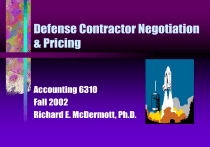 Defense Contractor Negotiation & Pricing Accounting 6310 Fall 2002 Richard E. McDermott, Ph.D. Source Data summarized from Pricing Manual of the Federal Acquisition Regulations (FAR). Determining Contract Type • By contract type we mean compensation arrangement • There is no best contract type for every occasion • Select contract type that will result in reasonable contractor risk with the greatest incentive for efficient economic performance Three Contract Types • Firm fixed price • Cost reimbursement • Labor hour and time and materials FEDERALRESERVENOTE T H E N I T E D T A T E S F M E R I C A T H EU U N I T E DS S T A T E SO O FA A M E R I C A THISNOTEISLEGALTENDER L70744629F FORALLDEBTS,PUBLICANDPRIVATE 12 WASHINGTON,D.C. 12 A H293 L70744629F 12 SERIES 1985 ONEDOLLAR 12 Firm fixed price • Firm fixed price • Fixed price with economic price adjustment • Fixed price incentive fee • Fixed price with successive targets • etc. Cost reimbursement • • • • • Cost reimbursement Cost sharing Cost plus fixed fee Cost plus award fee Cost plus incentive fee Labor hour and time and materials • Both of these include fixed labor rates but only estimates of hours to complete the contract • Neither require the contractor to complete the required work within an agreed upon price Consider Contractor Risk • Having contractors accept unknown or uncontrollable risk can result in – Poor contract performance – Reduced competition – Substantial increase in contract price Two Areas of Risk • Performance Risk • Market risk Performance Risk • Most contract risk is related to contract requirements and the uncertainty surrounding contract performance Performance Risk • Consider – Stability and clarity of contract specification or statement of work – Type and complexity of the item being purchased – Availability of historical pricing data – Prior experience in providing required supplies or services Cost Risk and Contract Type • Exploration and development--cost plus fixed fee • Test/demonstration--cost plus incentive fee or fixed price incentive fee • Full scale development--cost plus incentive fee, fixed price incentive fee, or firm fixed price • Full production--firm fixed price Market risk • Changes in the marketplace will affect contract costs – Changes in prices of labor – Changes in prices of materials – Changes in availability of labor or materials Market Risk • Address through contracts with economic price adjustment clause Pricing • • • • Definition of price Seller pricing objectives and approaches Government pricing objective Government approaches to contract pricing Definition of price • Price is the amount the buyer pays for a product or service • When contract price is less than cost, performance risk increases • If contractor effort to control costs result in unsatisfactory performance, contractor default is a real possibility Seller pricing objectives • Pricing objectives – Cover costs and earn profit • Operational objectives – – – – – Short-term/long-term profitability Market share Survival Product quality Productivity Seller Pricing Approaches • Cost based pricing • Market based pricing Cost based pricing • Mark-up Pricing--price is based on cost plus markup • Margin on Direct Cost--base price on amount necessary to achieve profit margin as a percent of price • Rate of Return Pricing--profit is calculated based on return on investment Market Based Pricing • • • • • • Profit maximization pricing Marker share pricing Market skimming Current revenue pricing Promotional pricing Demand differential pricing • Market competition pricing Market Skimming Pricing • Charge early buyers a premium Promotional Pricing • Products are priced to enhance the sales of the overall product line rather than the profitability of each product Demand Differential Pricing • Products sold in different markets are sold at different prices – Get what the customer will pay Market Competition Pricing • Price is based on what action the competitors have taken or are expected to take • Firms follow this pricing strategy in relatively homogeneous markets Government pricing objective • Pay a fair and reasonable price – What is fair? • Price each contract separately – Don’t try and balance the financial results of one contract against another • Exclude contingencies – Items that cannot reasonably be estimated at the time of award Examples of Contingencies • Results of pending litigation • Cost of volatile market price changes Evaluating the Bid • Evaluate price • Analyze cost Evaluate price • Compare prices in competitive bidding situations • Look at competitive published price lists, rebate agreements etc. • Get independent price estimates Analyze cost • When do you look at bidder’s costs? – When you require offeror to submit cost or pricing data – Why have offeror submit cost data? • To provide support that proposed price is reasonable Contract Costs Include • Direct costs • Indirect costs • Fee Government approaches to contract pricing • Quantitative Techniques for Contract Pricing • Cost Analysis • Negotiation Techniques Quantitative Techniques for Contract Pricing • Round table estimating • Comparison • Detailed analysis Round table estimating • Get various experts around a table, have them come up with their best estimate of what the price will be • Use only where historical costs, detailed drawings, bills of materials, and specifications are not available Comparison • Index numbers can be used to adjust historical costs for inflation • CVP is used – Regression analysis used to determine relationship between independent and dependent cost variables • Improvement curve analysis • Moving averages Detailed analysis • Break costs into tasks, estimate resources required for each task Detailed Analysis Questions • Can t