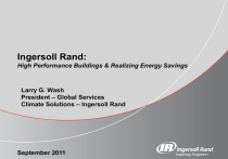 Ingersoll Rand: High Performance Buildings & Realizing Energy Savings Larry G. Wash President – Global Services Climate Solutions – Ingersoll Rand September 2011 My Background • Responsible for the profit and loss of the service, controls, contracting and parts business of Climate Solutions sector – Aftermarket service and parts – Building control systems – Turnkey and controls contracting – Performance-based energy services for commercial buildings and transportation • Executive responsibility for strategic direction, operating performance and marketplace differentiation – architect of Trane High Performance Buildings • Extensive service industry expertise – Previously served as vice president of service and contracting for Trane within North and South America and in various services leadership roles with Xerox and Eastman Kodak • Worldwide speaker and author on growing a profitable global services business; making the business case for energy and operational efficiencies 2 About Ingersoll Rand & Climate Solutions Our Agenda • Overview of Ingersoll Rand • Overview of Climate Solutions sector of Ingersoll Rand – Summary of key initiatives and strategies – Deep dive on Trane High Performance Buildings • Answering Your Questions 3 About Ingersoll Rand & Climate Solutions Ingersoll Rand: Who We Are • A $14 billion diversified industrial company • More than 58,000 employees worldwide • About 83 manufacturing facilities worldwide • Operations in every major geographic region • Strategic brands are #1 or #2 in their markets 4 About Ingersoll Rand & Climate Solutions Ingersoll Rand: Market-leading Brands Comfort and Climate Control Brands Worldwide transport refrigeration Worldwide Commercial and Residential HVAC Equipment Industrial Brands Manufacturer of golf cars and utility vehicles Air compressors, air and power tools 5 About Ingersoll Rand & Climate Solutions Our Brand Promise: We inspire progress by unleashing the potential of people and technologies. Our people, products, systems and services make everyday living healthier, safer, more energy efficient, productive and comfortable—enabling our customers to achieve real progress and create a positive impact in their world. Security Brand Lock and door hardware, security solutions Ingersoll Rand: Inspiring Progress • Diversified Businesses • Balanced Across the Cycle • Customer Focused • Outpacing Market Growth • Change Culture • Innovative, Visionary • Leveraged Enterprise 6 About Ingersoll Rand & Climate Solutions Ingersoll Rand in China: Who We Are • Entered China market in 1922 • Restarted business in China in 1987 through a joint venture with Shanghai Compressor (later changed to “SIRC”) • 1 investment entity, 36 branches, 3 trading companies and 7 major manufacturing facilities • One of global R&D centers located in Taicang, China • About 7,000 on staff • US400 Million in total investment Trane (Taicang) Wujiang Campus Nanjing Compressor Changzhou Tool Guilin Tools Trane (Zhongshan) Climate Solutions Industrial Technologies Security Technologies Cross Sectors – Integrated manufacturing campus Committed to China 7 About Ingersoll Rand & Climate Solutions Shanghai Compressor Airtec Shanghai Fuhsing Ingersoll Rand in China: Our Manufacturing • Taicang: -- Space: 35,500 m2 -- Headcount: 656 -- Revenue: USD227M • Zhongshan: -- Space: 6,300 m2 -- Headcount: 197 -- Revenue: USD45M • Bangkok: -- Space: 7,600 m2 -- Headcount: 301 -- Revenue: USD51M • Penang: -- Space: 6,600 m2 -- Headcount: 211 -- Revenue: USD23M • Wujiang: -- Space: 62,000* m2 -- Headcount: 641 -- Revenue: USD182M Five Manufacturing Facilities in China 8 About Ingersoll Rand & Climate Solutions Climate Solutions: Two Powerful Brands Broad and Global Portfolio of HVAC Systems and Services HVAC SYSTEMS SERVICES / CONTROLS TRANSPORT REFRIGERATION Our Vision: To make building owner and transport customers more profitable and efficient for life through innovative HVACR systems and services 9 About Ingersoll Rand & Climate Solutions Climate Solutions: Two Powerful Brands • 1 out of every 2 U.S. commercial buildings has Trane systems • Thermo King products are sold on every continent around the world • We do business through 400 locations around the world • • We have 25,000 Trane associates in 60 countries We have more than 865 dealers worldwide sell and service our products • • We have 24 innovation, engineering and manufacturing locations around the world We operate nine manufacturing facilities and three R&D Centers of Excellence Industry-leading, Global HVAC Systems and Service Brands 10 About Ingersoll Rand & Climate Solutions Climate Solutions: Manufacturing Footprint in Asia Pacific 4 x Trane plants (total 56,000 m2) • Taicang (35,500 m2) • Zhongshan (6,300 m2) • Bangkok (7,600 m2) • Penang (6,600 m2) Wujiang campus (62,000* m2) • Thermo King (Marine, Genset) • Hussmann (Retail) * includes operations for ITS (20,000 m2) 1 x Hussmann workshops •Tauranga (2,700 m2) Total Mfg footprint: 118,500m2 (incl 20,000m2 for ITS) Two Powerful Brands with Manufacturing Throughout Asia Pacific 11 About Ingersoll Rand & Climate Solutions Total Mfg HC: 1,123 (Trane) + 538 High Performance Buildings Achieving Energy Savings 12 About Ingersoll Rand & Climate Solutions Trane: What is a High Performance Building? Safety Comfort Efficiency “The best sustainable designs are not just environmentally responsible. They produce buildings where employees can thrive and productivity can soar. We call these high performance green buildings.” - U.S. Green Building Council High Performance Buildings: cost effective, safe, secure, sustainable 13 About Ingersoll Rand & Climate Solutions High Performance Buildings: Goal is to Enhance Operational Effectiveness High performance buildings enhance company effectiveness • • • • • Safer, healthier, comfortable environment Reliable operat