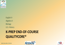 English II Algebra II Biology U.S. History K-PREP END-OF-COURSE QUALITYCORE® KDE:OAA:DSR 2/7/2013 1 • EOC assessments establish a common rigor for core courses. • Current EOC assessments are for courses which are high school graduation requirements. • ACT’s QualityCore® program will link student performance to national results. KDE:OAA:DSR 2/7/2013 2 • Score reports may be created in one PDF for all students or one student report at a time. • Constructed Response (CR) may be generated and scored locally. QualityCore resources may be used. • Local school will determine how to incorporate the CR into a student’s final grade. Policy Change: Students are tested at the completion of all coursework. KDE:OAA:DSR 2/7/2013 3 Session Type Questions Time Student Score School Score MC1 Paper Booklet or CBT 35-38 MC 45 minutes MC2 Paper Booklet or CBT 35-38 MC 45 minutes Score Returns CBT – Immediately Paper – 10 days from ACT receipt CBT – Immediately Paper – 10 days from ACT receipt Scale Score = MC1 + MC2 = Accountability KDE:OAA:DSR 2/7/2013 4 A psychometric study linking QualityCore® results (scale scores) of multiple-choice scores to student class grades was developed using Kentucky scores. STATE-REQUIRED END-OF-COURSE EXAMS RECOMMENDED LINK TO CLASSROOM LETTER GRADES FOR 2012-13 (Based on Multiple-Choice Sections) CPE-linked College Subject Readiness Benchmark English II 175-160 159-154 153-152 151-141 140-125 154 A B C D F Algebra II 175-151 150-148 147-143 142-138 137-125 148 Biology 175-157 156-154 153-146 145-140 139-125 154 U.S. History 175-151 150-147 146-144 143-139 138-125 147 KDE:OAA:DSR 2/7/2013 5 Window #1 #2 #3 #4 #5 #6 Administration Dates (2012-13) August 1-September 15 (new addition) October 1-November 16 December 1-January 15 February 1-March 15 (CR Materials returned unused) April 15-June 15 (No CR Materials received) June 16-July 15 (CBT, except for accommodated forms) Choose 10 consecutive days within the larger window for testing. KDE:OAA:DSR 2/7/2013 6 10 Day Traditional • 10 consecutive testing days chosen within the larger window. • Each content area must be completed in 1 day. • All materials shipped on same day. KDE:OAA:DSR 2/7/2013 Flexible (Non-Traditional) • May test at any time during the larger window. • Each content area must be completed in 1 day per student. • Materials shipped as students complete tests. – Place Supplemental Order for additional header sheets. QualityCore® Customer Service 866/764-7228 7 One document per student per test One document per Test Supervisor • Test booklet pre-printed with student and teacher name • Answer sheet pre-filled with student information • Answer sheet bound as perforated sheet into test booklet • Reference Sheet for Algebra II bound as perforated sheet into test booklet • Test Supervisor’s Manual • Pre-filled School Header • Pre-filled Group Header (possible) KDE:OAA:DSR 2/7/2013 Beginning April 15 8 • Review support documents – Best Practices – QualityCore Testing Helpful Hints – Online User Guide from ACT website • Increase number of proctors in the room for – Better monitoring – Quicker starting of tests • Computer Testing: New Policy: The first computer-based test must begin at the same time as the paper based test. – Multiple testing sessions can be utilized in a single day. Note: A 10-15 minute break is allowed between test sessions. KDE:OAA:DSR 2/7/2013 9 Accommodations • IEP • PSP • 504 Plan (Not in SDRR) Order Materials Online 100-Day Rule Accountability based on summative window Seating Chart http://qc.vantage.com KDE:OAA:DSR 2/7/2013 10 Paper Only Paper and Computer • • • • • • • • • • • • R = Reader A = Audio B = Braille LP = Large Print Scribe Applies to students with IEP, 504 Plan or PSP KDE:OAA:DSR 2/7/2013 Extended Time Paraphrasing Manipulatives Prompting/Cueing Behavior Modification Interpreter (sign language) Dictionaries/Thesauri 11 Computer-based Pencil/Paper Prohibited: • Notes • Foreign language or English dictionary • Electronic devices and cell phones Allowed: • Scratch Paper-Please collect and destroy securely. • Calculators • Reference Sheets (Algebra II) Prohibited: • Scratch paper • Notes • Foreign language or English dictionary • Electronic devices and cell phones Allowed: • Scratch work is to be done in the test booklet. • Calculators • Reference Sheets (Algebra II) KDE:OAA:DSR 2/7/2013 12 Participation = 4 MC (minimum) • First year EL students enrolled in a U.S. school are exempt from accountability. Students are required to take the Algebra II and Biology for federal participation rate. • Second year or more EL students fully participate. • Accommodations are available for students with a Program Services Plan (PSP). KDE:OAA:DSR 2/7/2013 13 • Recorded Trainings available on KDE website http://education.ky.gov/AA/distsupp/Pages/EOC.aspx • Kentucky QualityCore® Specific website http://www.act.org/stateservices/kentucky KDE:OAA:DSR 2/7/2013 14 College Admissions Assessments (ACT) College Placement Assessments (COMPASS & KYOTE) COLLEGE READINESS KDE:OAA:DSR 2/7/2013 15 College/Career Readiness Rate College Ready: Must meet benchmarks on one of the following: College Ready ACT COMPASS KYOTE KDE:OAA:DSR 2/7/2013 Career Ready: Must meet benchmarks for one requirement in Career Academic area and must meet one requirement in Career Technical area Career Ready Career Ready Academic Technical Armed Services Kentucky Vocational Aptitude Occupational Battery (ASVAB) Skills Standards Assessment ACT WorkKeys (KOSSA) (Applied Math, Locating information, and Reading for Information) Industry Certificates Bonus: College AND Career Ready must meet at least one from each area College Ready Academic ACT or COMPASS or KYOTE NOTES: (1) By meeting the College Ready Academic definition, the student does not have to take the additional tests of ASVAB or WorkKeys for the bon