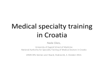 Medical specialty training in Croatia Nada Cikes, University of Zagreb School of Medicine National Authority for Specialty Training of Medical Doctors in Croatia UEMS ORL Section and Board, Dubrovnik, 4. October 2014. Medical education in Croatia • 4 medical schools • 2004 new harmonised core curriculum was introduced in all four schools • 2007 medical schools invited in specialty training programmes developments • 2007- 2011 new competency based specialty training programme was developed for all specialties • from 2011 implementation Introduction of new specialty programes • Need for competency and learning outcomes based programmes • Harmonisation with European documents: – European commission (EU Directive 2005/36 EC)* – UEMS (Charter on specialty training ..... Ch. 6) – Recommendation of intrnl. scientific societies • New specialties proposals: - new specialties - common trunks - reforms of old specialties • Proposal for a new Ordinance on specialty training of medical doctors in Croatia * qualification recognition: subject of negotiation with Croatia for EU accetion Development of specialist training programmes in Croatia • New competency based programmes for 46 specialties • Common trunk for internistic and surgical specialties • For all specialty programmes – duration – training plan – required level of competencies - generic - specific – list and number of procedures – logbook Croatian medical schools and other institutions in training programme development Agreement on collaboration in development of specialty education program between: • all four medical schools • Croatian Medical Association • Croatian Medical Chamber • Croatian Academy for Medical Sciences Development of programmes of specialists education in Croatia 46 task forces: • Programme of specialist education defining competences • Requirements for training institution • Requirements for mentor • Requirements for trainee and logbook Goals Objectives of training programme – generic competences - all physicians in training in all medical specialties – specific competences: knowledge, skills and attitudes – competence-based education, focused on learner performance - learning outcomes in reaching specific objectives of the curriculum Outcome of training programme – specialist able to practice in a professional, ethical and patient-focused way COMPETENCIES skills knowledge competencies professional behaviour Competencies in specialty training programmes • Characeristic for each specialty – common trunk – “main” program of the specialty • All educational units in the programme • Also the number of interventios • Evaluation of comparable competencies in groups of specialties (surgical, internistic) • Determine teaching methods • Determine assessment methods Important: generic competencies for all specialists DESCRIPTION OF THE LEVEL OF COMPETENCIES 1 2 3 Trainee is informed about thematic area on basic level, needs support and supervision in work and problem solving in the thematic area Trainee is partially competent, able to work and solve problems with support and partial supervision Trainee is fully competent, familiar with relevant literature, able to work and solve all problems in the thematic area Specific competencies – goals* • • • • • • Medical knowledge Patient care Practice based learning and improvement Systems based practice Professionalism Interpersonal and communication skills *ACGME Outcome Project 2006 Generic competencies in medicine • Tomorrow’s Doctor (GMC, UK) – generic and specific • The Scottish Doctor – generic and specific • Generic Curriculum for the Medical Specialties Federation of the Royal Colleges of Physicians • The Royal College of Physicians and Surgeons of Canada Physicians Competency Framework • European Board of Internal Medicine Core Competencies • Etc......... Generic competencies in specialty training The CanMEDS 2005 Framework: The Physician Roles • • • • • • • Medical Expert Role Communicator Role Collaborator Role Manager Role Health Advocate Role Scholar Role Professional Role Definitions of 7 roles of physicians • As Medical Experts, physicians integrate all of the CanMEDS Roles, applying medical knowledge, clinical skills, and professional attitudes in their provision of patient-centered care. Medical Expert is the central physician Role in the CanMEDS framework. • As Communicators, physicians effectively facilitate the doctorpatient relationship and the dynamic exchanges that occur before, during, and after the medical encounter. • As Collaborators, physicians effectively work within a healthcare team to achieve optimal patient care. • As Managers, physicians are integral participants in healthcare organizations, organizing sustainable practices, making decisions about allocating resources, and contributing to the effectiveness of the healthcare system. • As Health Advocates, physicians responsibly use their expertise and influence to advance the health and well-being of individual patients, communities, and populations. • As Scholars, physicians demonstrate a lifelong commitment to reflective learning, as well as the creation, dissemination, application and translation of medical knowledge. • As Professionals, physicians are committed to the health and wellbeing of individuals and society through ethical practice, professionled regulation, and high personal standards of behaviour. Implementation • The CanMEDS framework accepted, incorporated in the training programme: – as a teaching module obligatory for all specialties – parts of clinical teaching programmes – content in the logbook • Evaluation: – At the end of the module – Continuous evaluation by mentor – Multisource feedback - 360 degrees Introductory teaching module on generic competencies • Two weeks programme • Each competency: two half – days • Traine
