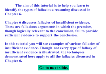 In this tutorial you will see examples of various fallacies of insufficient evidence. Though not every type of fallacy of insufficient evidence is illustrated, the techniques demonstrated here apply to all the fallacies discussed in